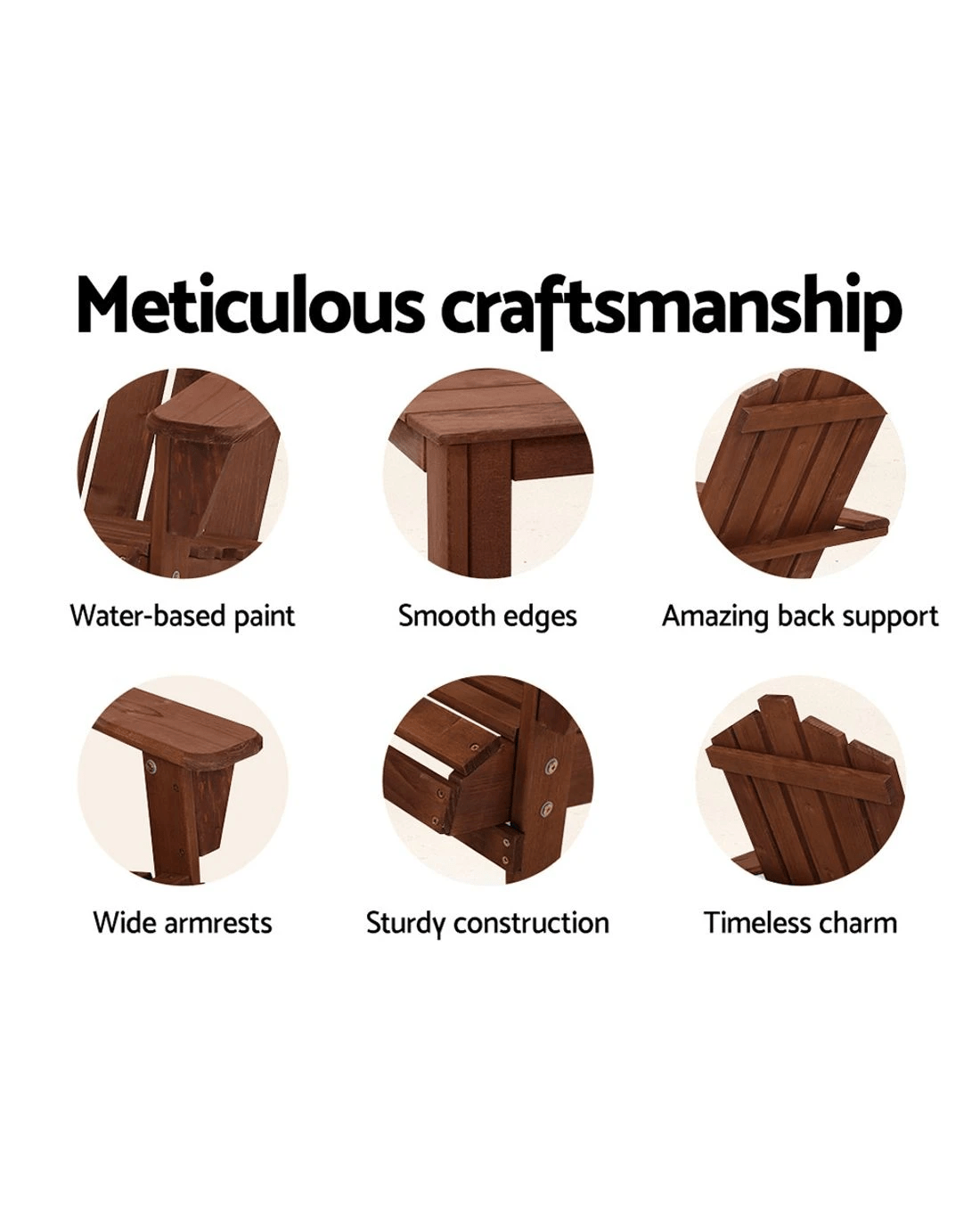 Our Adirondack Chair has followed the age-old tradition of producing a chair that is sturdy and longlasting, and retaining pertinent details such as the supportive high back, smooth edges, bevelled highlights, and flat, extra wide armrests. Not least, its 150kg weight capacity also ensures that it is strong and firm even with robust use.