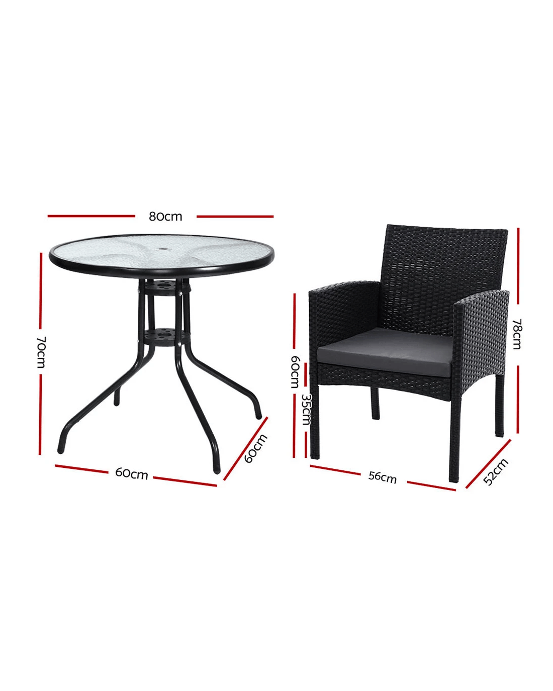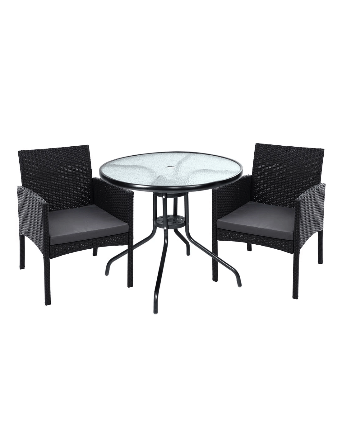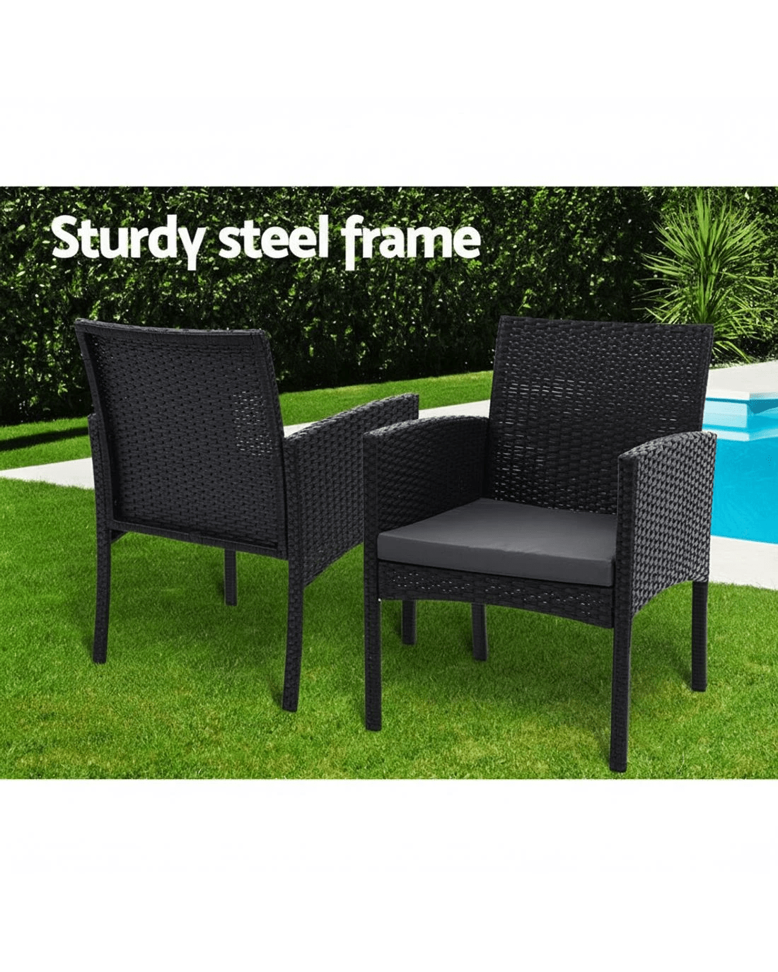 Gardeon 3PC Bistro Set Outdoor Furniture Rattan Table Chairs Cushion Patio - Black