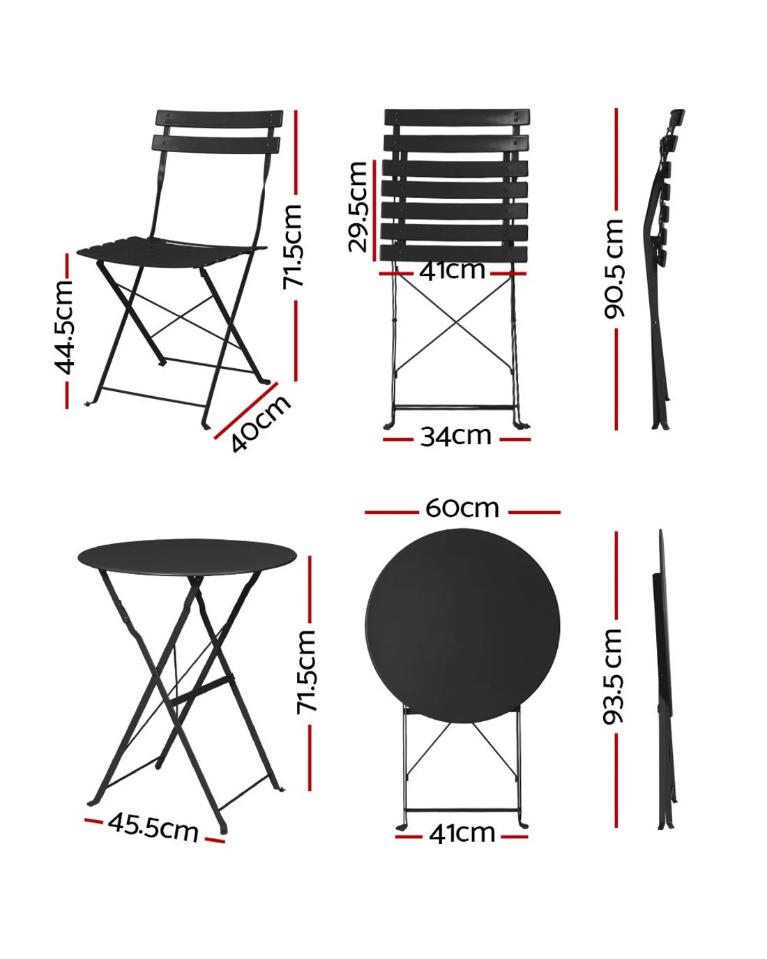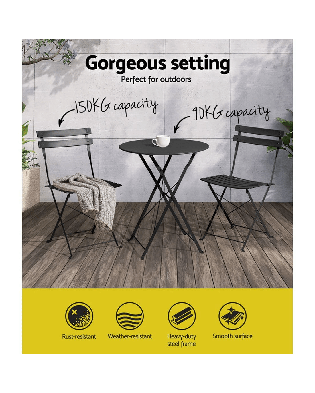 Looking to create a chic and gorgeous outdoor setting? The Gardeon 3-piece outdoor bistro set is a must purchase. It will liven up your outdoor space and help you achieve an elegant outdoor setting where you can enjoy day and night and summer and winter. The set comprises of two chairs and a matching table. Its beautiful and versatile design makes it perfect for indoor and outdoor use. This outdoor bistro set features a heavy-duty, powder-coated galvanised steel frame that is quite sturdy and durable. It has easy slide up/down locking mechanism that ensures stability. The chairs have 150kg weight capacity while the table has 90kg weight capacity, both meticulously designed for robust use. Our outdoor bistro set boasts foldable design that enables you to save space. It doesn't require any assembly, which makes it easy to set up. Furthermore, the chairs flaunt curved back design for comfortable sitting and comes with a scratch-resistant pads and protection cover that prevents tilting or slipping. The outdoor table and chair surface is smooth to touch, and the rust-resistant and water-resistant frame makes it suitable for indoor and outdoor use. Our outdoor bistro set is nothing mundane, but an extraordinary piece. Now create a praise-worthy spot with just a little creativity that will wow your guests using our Gardeon outdoor bistro set.