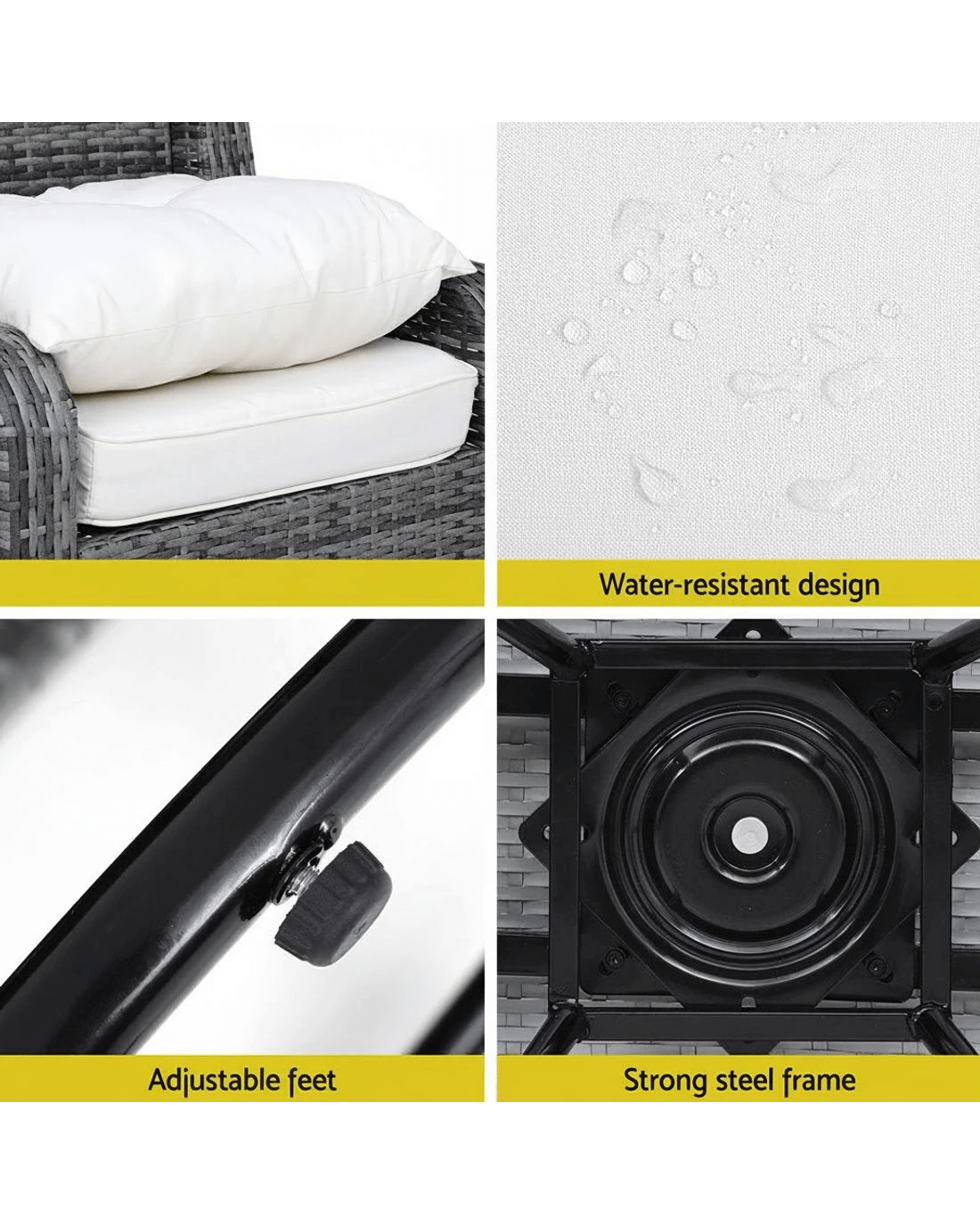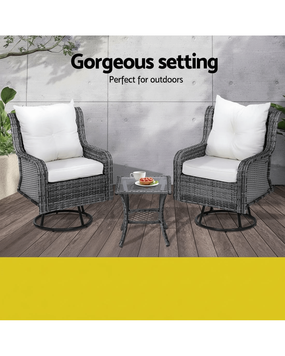 Say goodbye to uncomfortable outdoor furniture and say hello to Gardeon swivel outdoor furniture set. With this furniture set, you can create a relaxed outdoor setting easily that makes a perfect spot for peaceful reading or just unwinding on sunny afternoons with your partner. This outdoor swivel furniture set comprises of two swivel chairs and a side table. Its weather-resistant and UV-resistant design makes it suitable for both indoor and outdoor use. The outdoor swivel furniture set is crafted from durable PE wicker with heavy-duty powder-coated steel frame for ultimate sturdiness. Its meticulously woven PE wicker ensures it lasts long and looks desirable. The two chairs come with 360˚ swivel mechanism, which enables you to face any direction easily, and the soft cushioned seat makes it utterly comfortable to sit for a longer time without experiencing any pain or discomfort. The cushions have removable covers for easy cleaning and washing, and the UV-resistant properties prevents the cushion cover colour from fading. Furthermore, the side table has 5mm thick tempered glass top for durability and strength. Bring home our Gardeon swivel outdoor furniture set for your space today. This versatile swivel furniture set can be styled in multiple ways. So put on your creative hat and start styling.