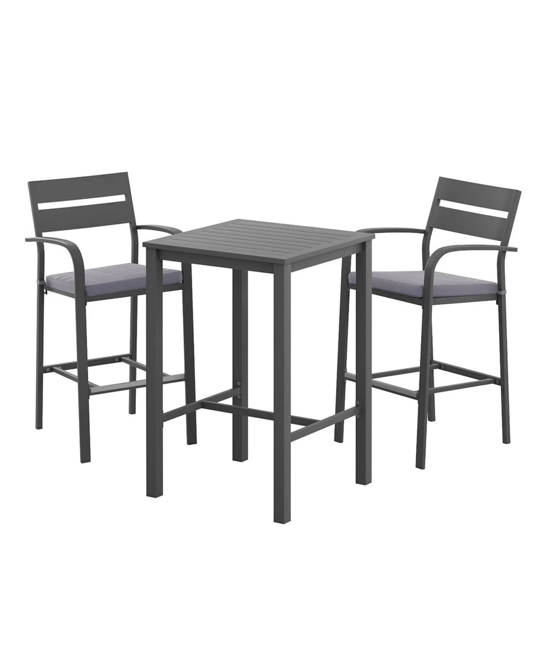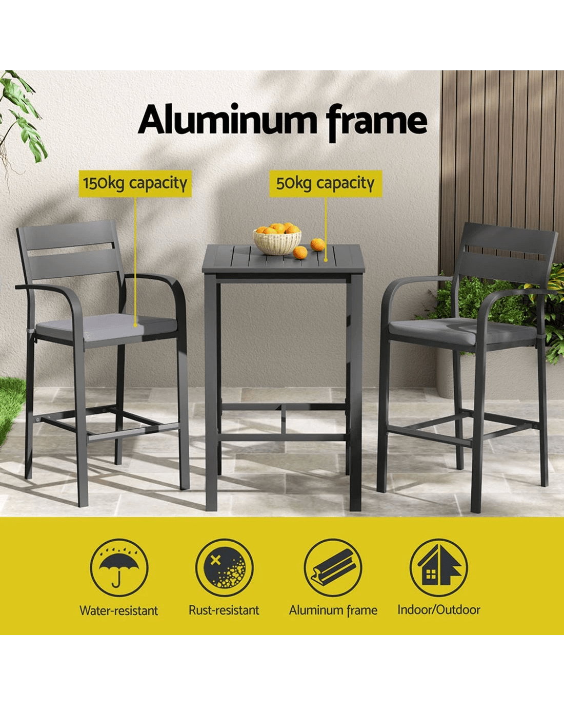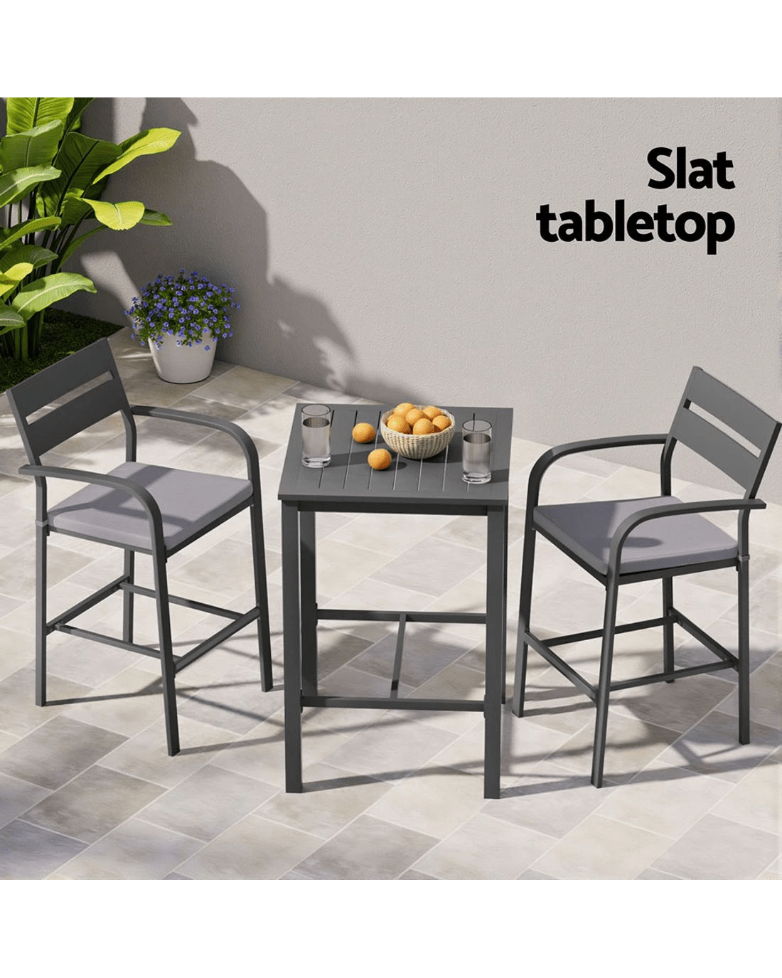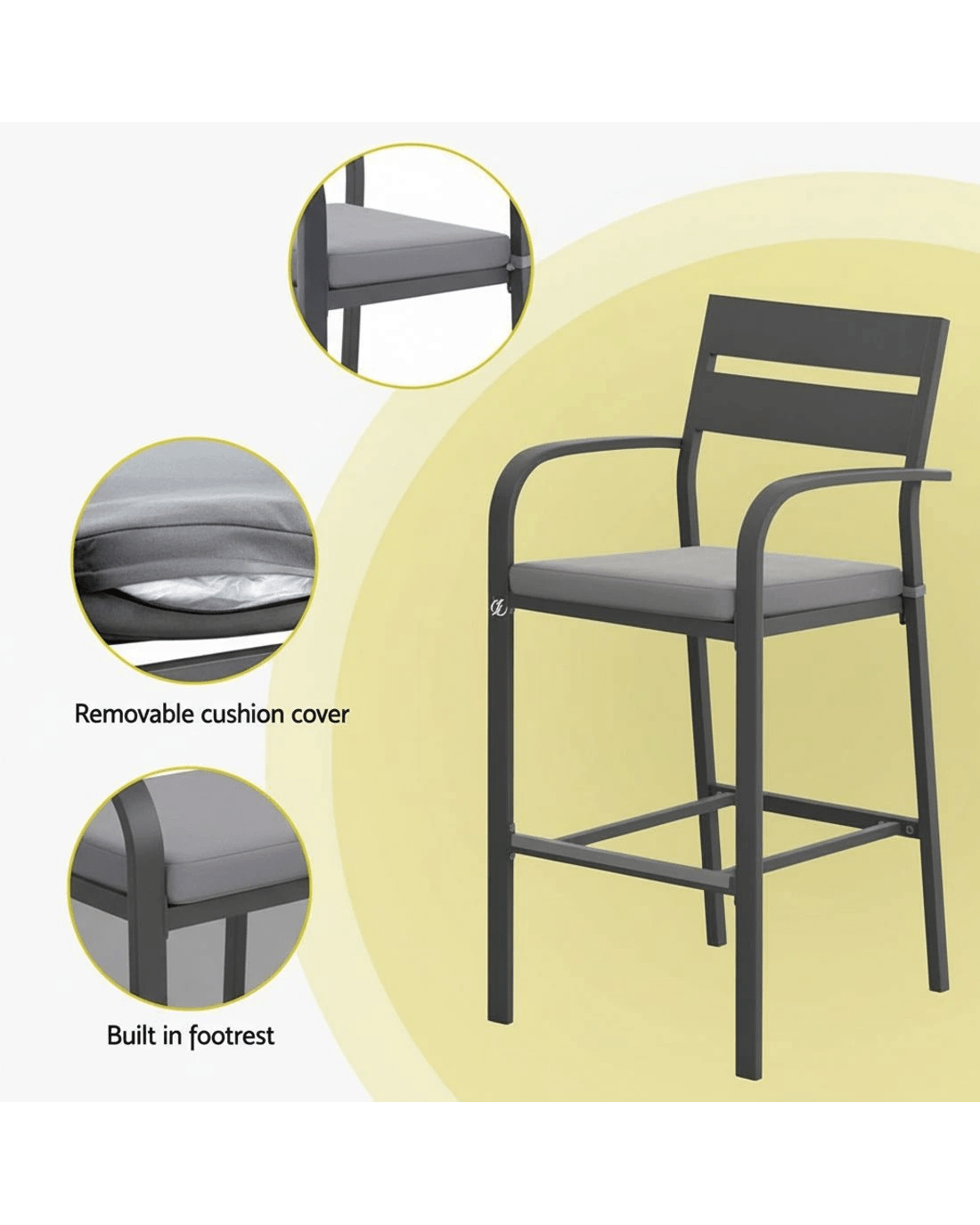 Elevate your outdoor living with Gardeon's stylish 3-piece aluminum bar stool set, perfect for creating an inviting bar area in your backyard, business, or holiday home. These weather-resistant stools feature a finely slatted backrest, curved armrests, and a built-in footrest for optimal comfort, while secured foot pads ensure stability on various surfaces. The removable, extra-thick cushions provide plush seating, making these stools ideal for outdoor enjoyment.