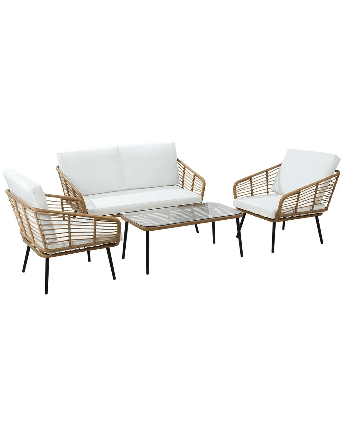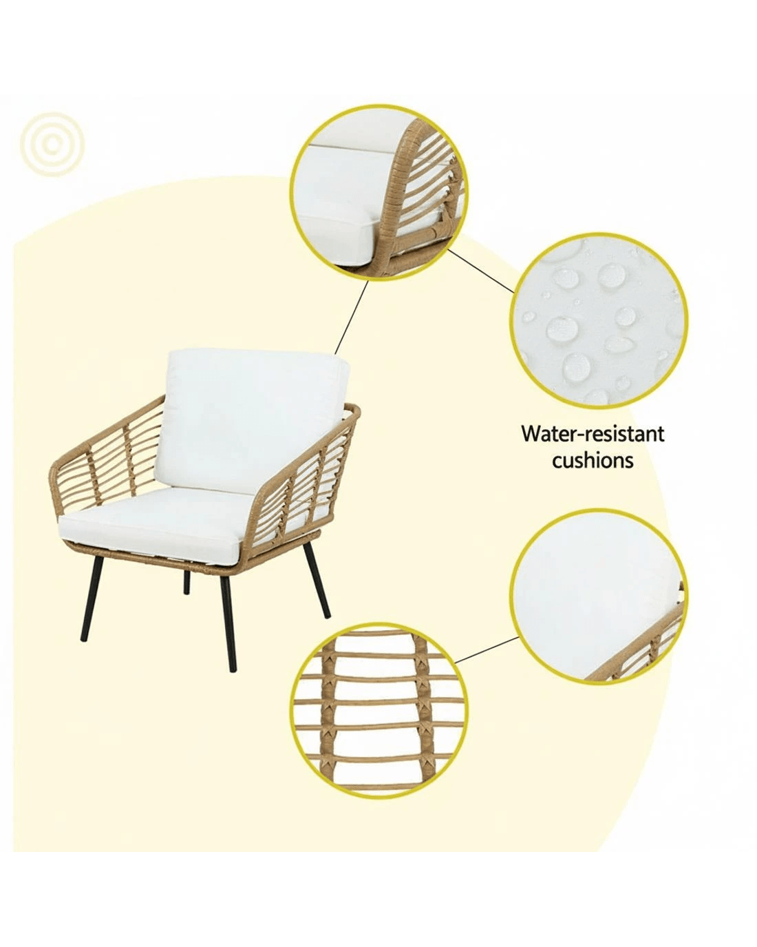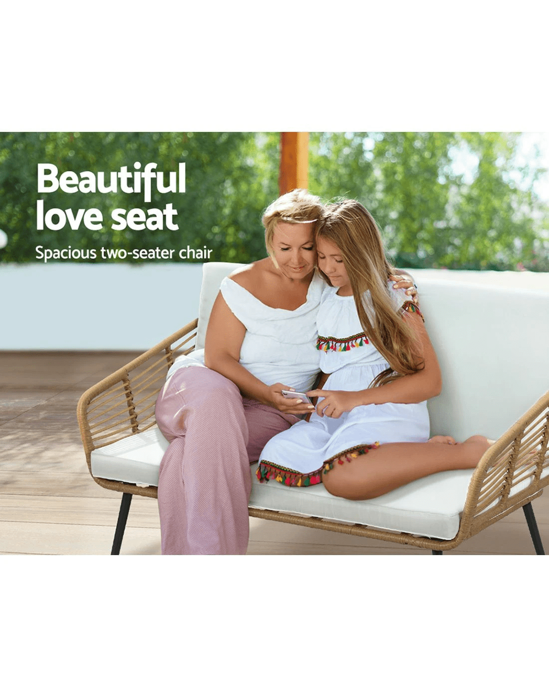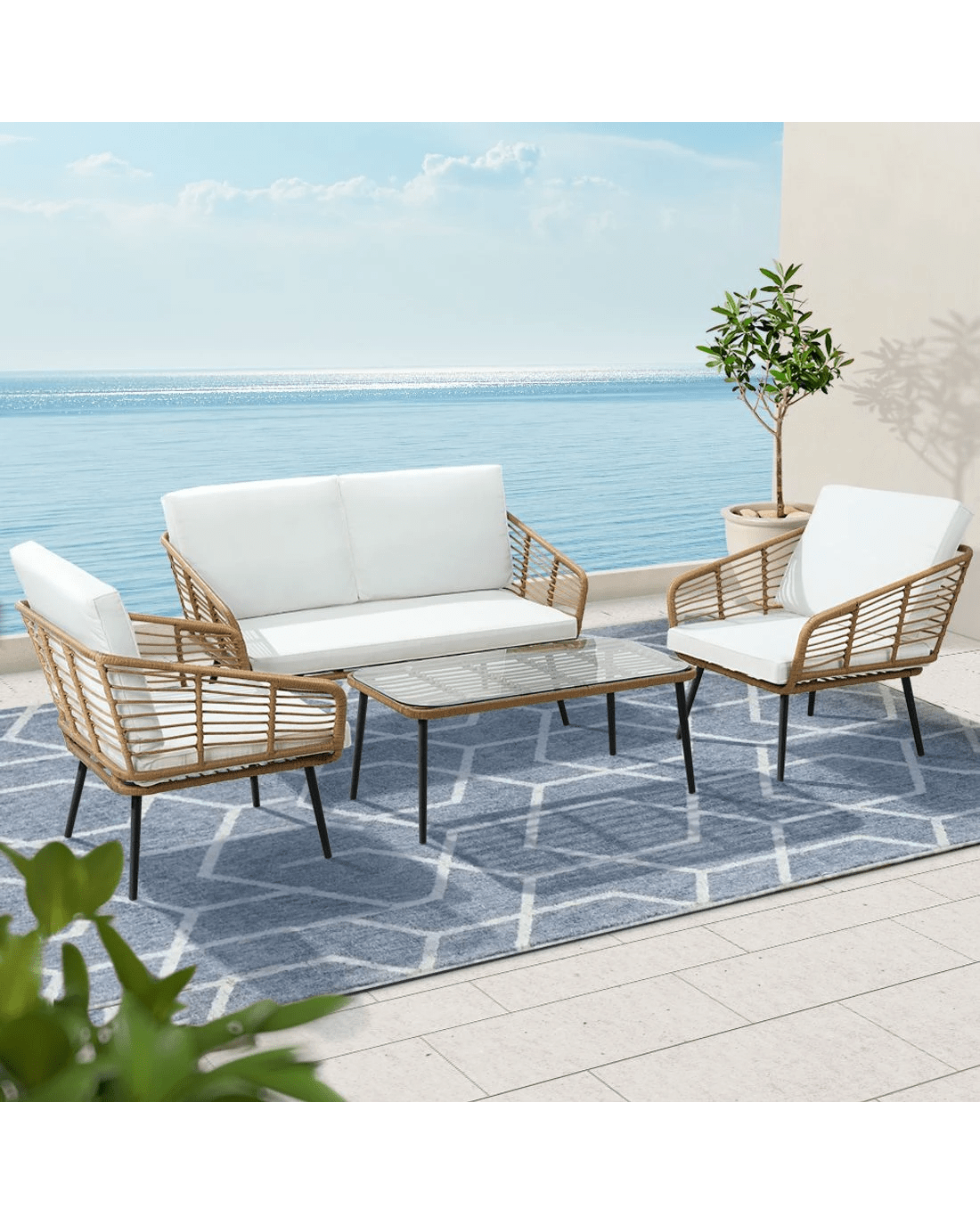 Looking to create a chic and gorgeous outdoor setting? The Gardeon 4-piece rattan outdoor lounge set is a must purchase. It will liven up your outdoor space and help you achieve an elegant space where you can enjoy day and night and summer and winter. This 4-seater set comprises of two single sofas, one 2-seater sofa, and a matching centre table. You can arrange them in multiple ways to suit your space. Its beautiful and versatile design makes it perfect for both indoor and outdoor use. All the seat and back cushions come with 8cm thickness and high-density foam padding that ensures your comfort always. Additionally, the removable cushion covers are water-resistant and UV-resistant to suit different seasons. Furthermore, our outdoor set features a lovely handwoven rattan weave for a touch of tropical charm and decorative effect, and the UV-resistant PE wicker makes this lounge set perfect for all-weather use. The large table with 5mm thick tempered glass top, non-slip suction pads, and durable powder-coated frame ensures strength and durability. This rattan outdoor set will withstand the test of time due to its durable and sturdy structure and powder-coated steel frame. You can create a praise-worthy spot with just a little creativity that will wow your guests. Shop it for your home today.