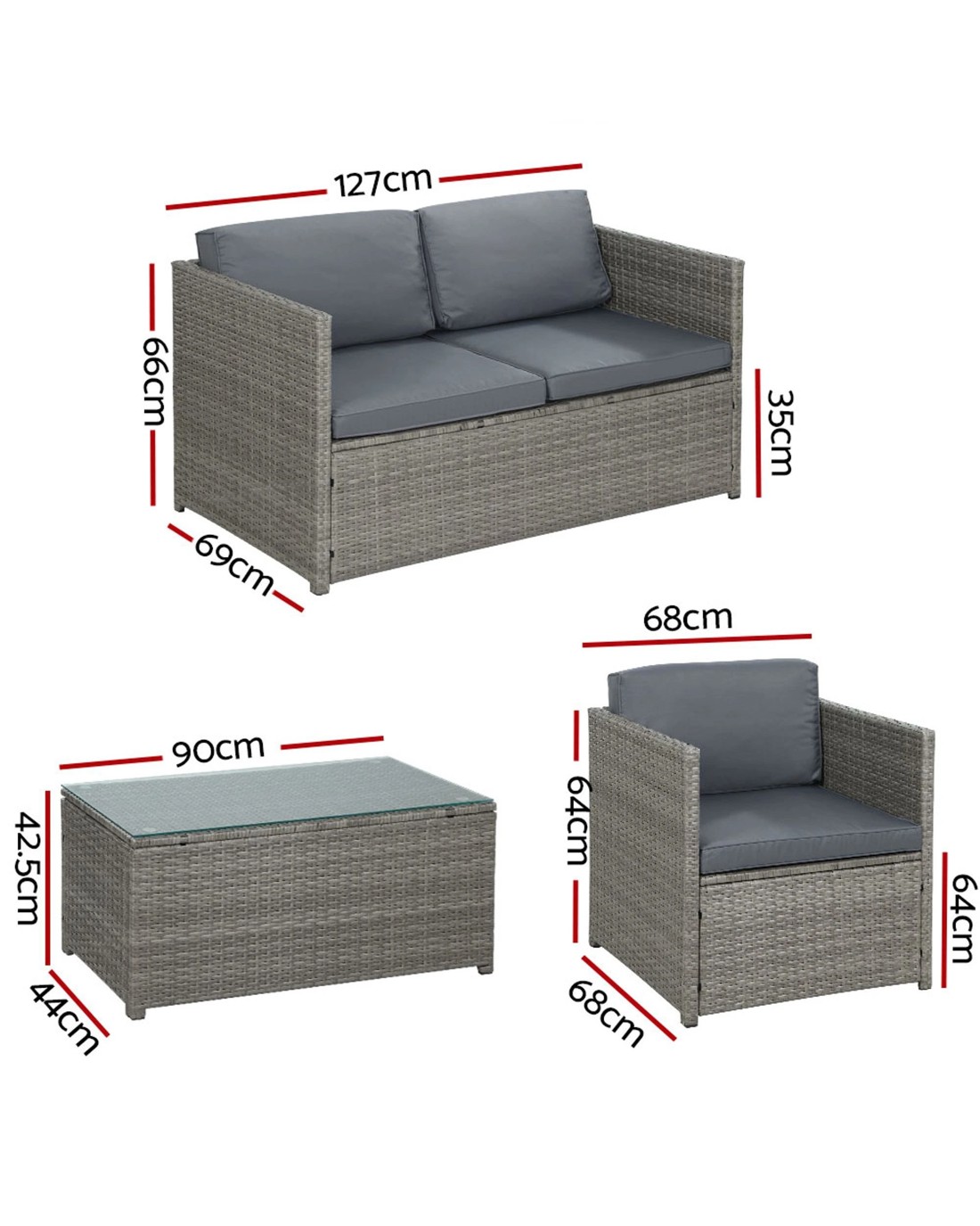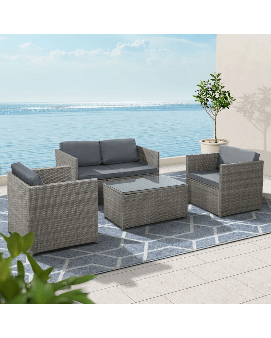 Looking to create a chic and gorgeous outdoor setting? The Gardeon 4-piece wicker outdoor set is a must purchase. It will liven up your outdoor space and help you achieve an elegant space where you can enjoy day and night and summer and winter. This 4-seater set comprises of one two-seater sofa, two single sofas, and a matching centre table. Its beautiful and versatile design makes it perfect for indoor and outdoor use. All the seat and back cushions come with thick, high-density soft padding that ensures your comfort always. Additionally, the removable cushion covers are water-resistant to suit different seasons. Furthermore, our outdoor set features a lovely wicker weave for a touch of tropical charm, and the UV-resistant PE wicker with powder-coated and weather-resistant steel frame is suitable for all-season use. The large table with thick tempered glass top and durable frame ensures strength and durability, and the secured foot pads offers ultimate stability. This table also has anti-slip suction pads that prevents the tempered glass from slipping. This wicker outdoor set will withstand the test of time. You can create a praise-worthy spot with just a little creativity that will wow your guests. Shop it for your home today.