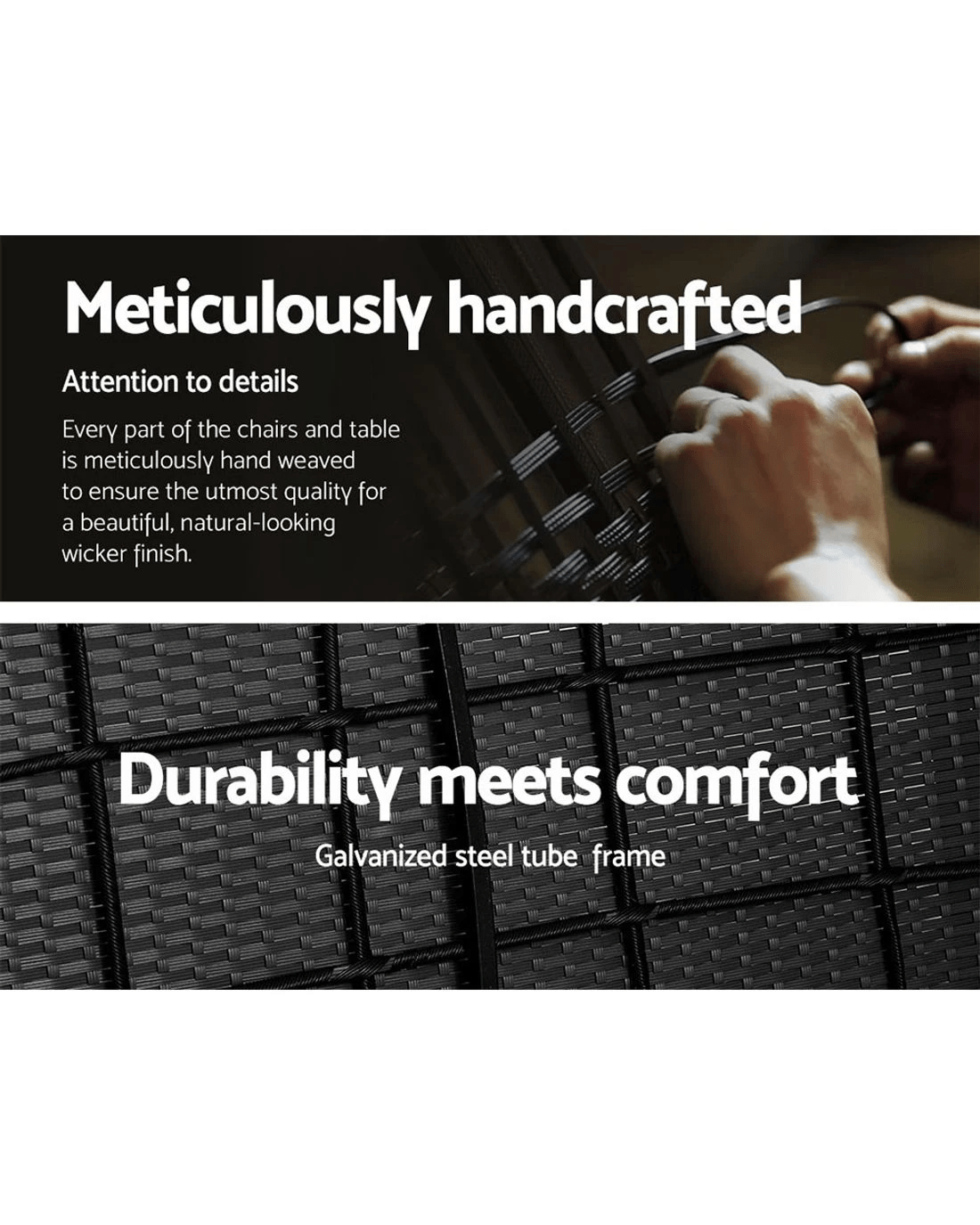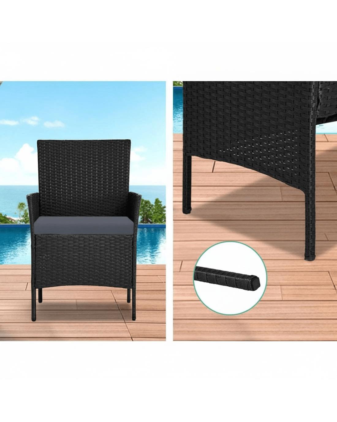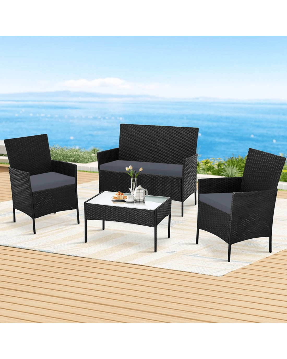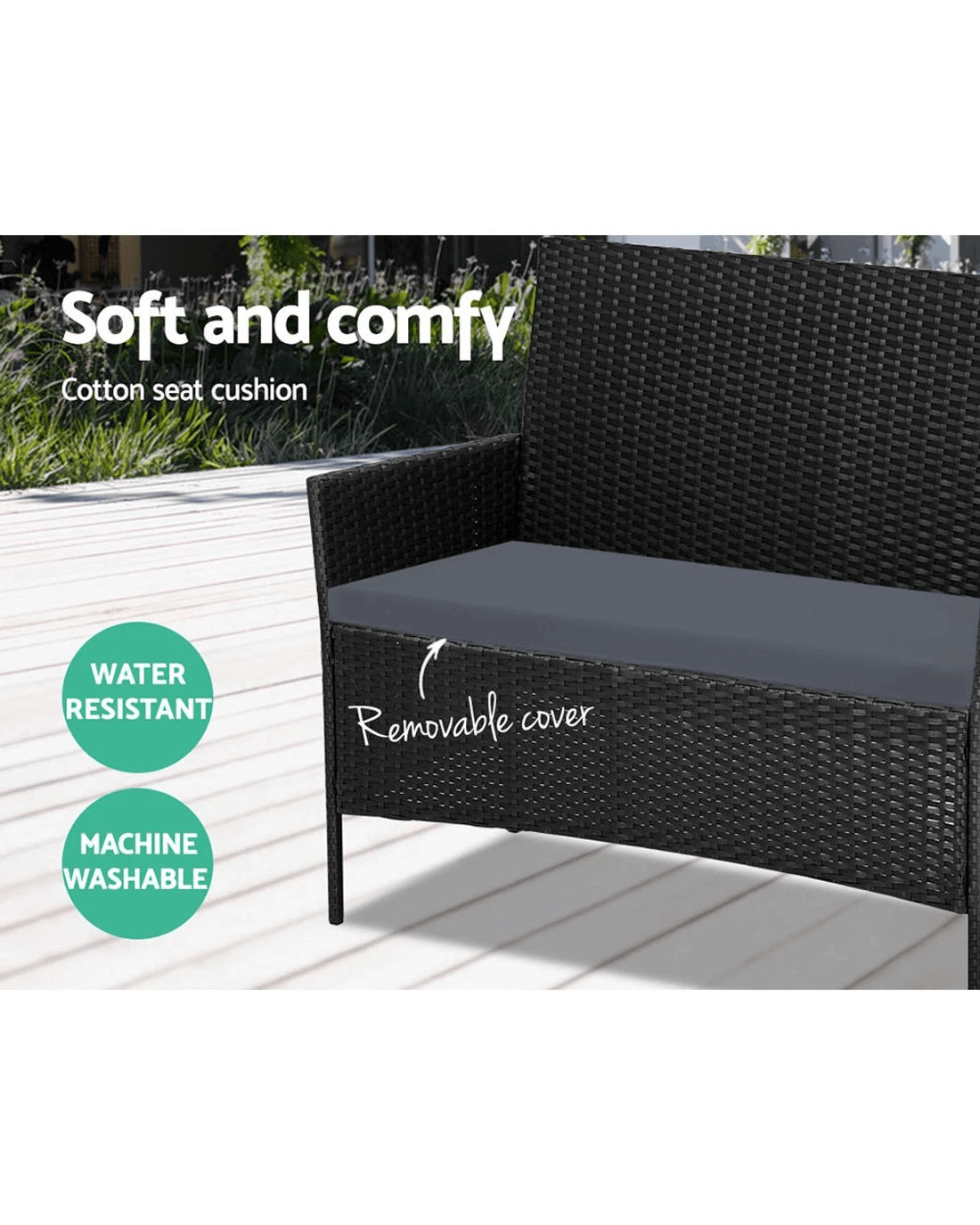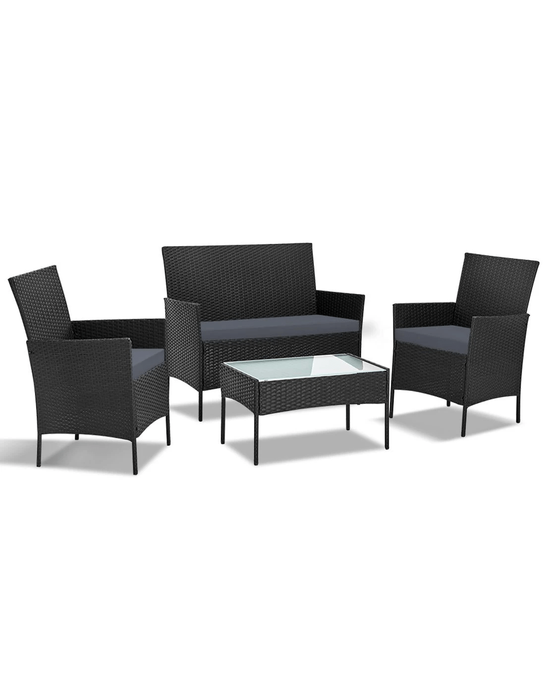 Meticulously crafted, our Gardeon 4-piece Rattan Outdoor Set comprises a chic loveseat, two single armchairs and one matching side table for a beautiful integrated look. Its presence will definitely add panache and style to your deck, patio or even living room. Made of PE wicker and a sturdy steel frame, this set is designed to last through all weather and the test of time. The 5mm tempered glass top for the side table also ensures a strong and safe use with total peace of mind. Not least, the cushion covers are removable and washable to maintain their pristine appearance.