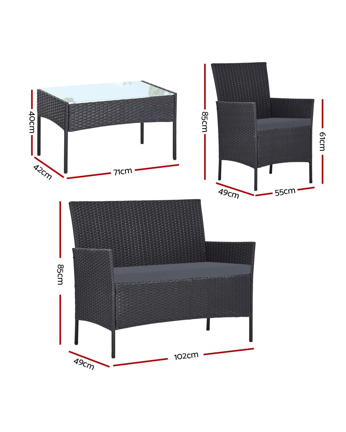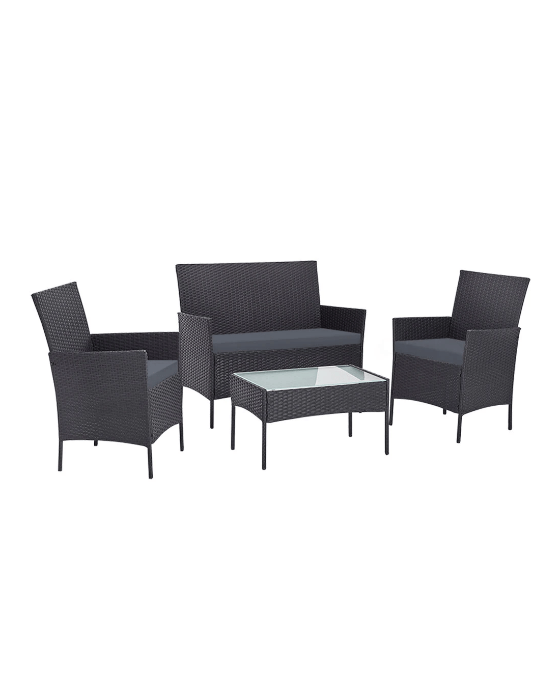 Meticulously crafted, our Gardeon 4-piece Rattan Outdoor Set is comprised of a chic loveseat, two single armchairs and one matching side table for a beautiful integrated look. Its presence will add panache and style to your deck, patio or even living room. Made of PE wicker and a sturdy steel frame, this set is designed to last through any weather and the test of time. The 5mm tempered glass top for the side table ensures a strong, safe surface for total peace of mind. Not least, the cushion covers are removable and washable to maintain their pristine appearance.