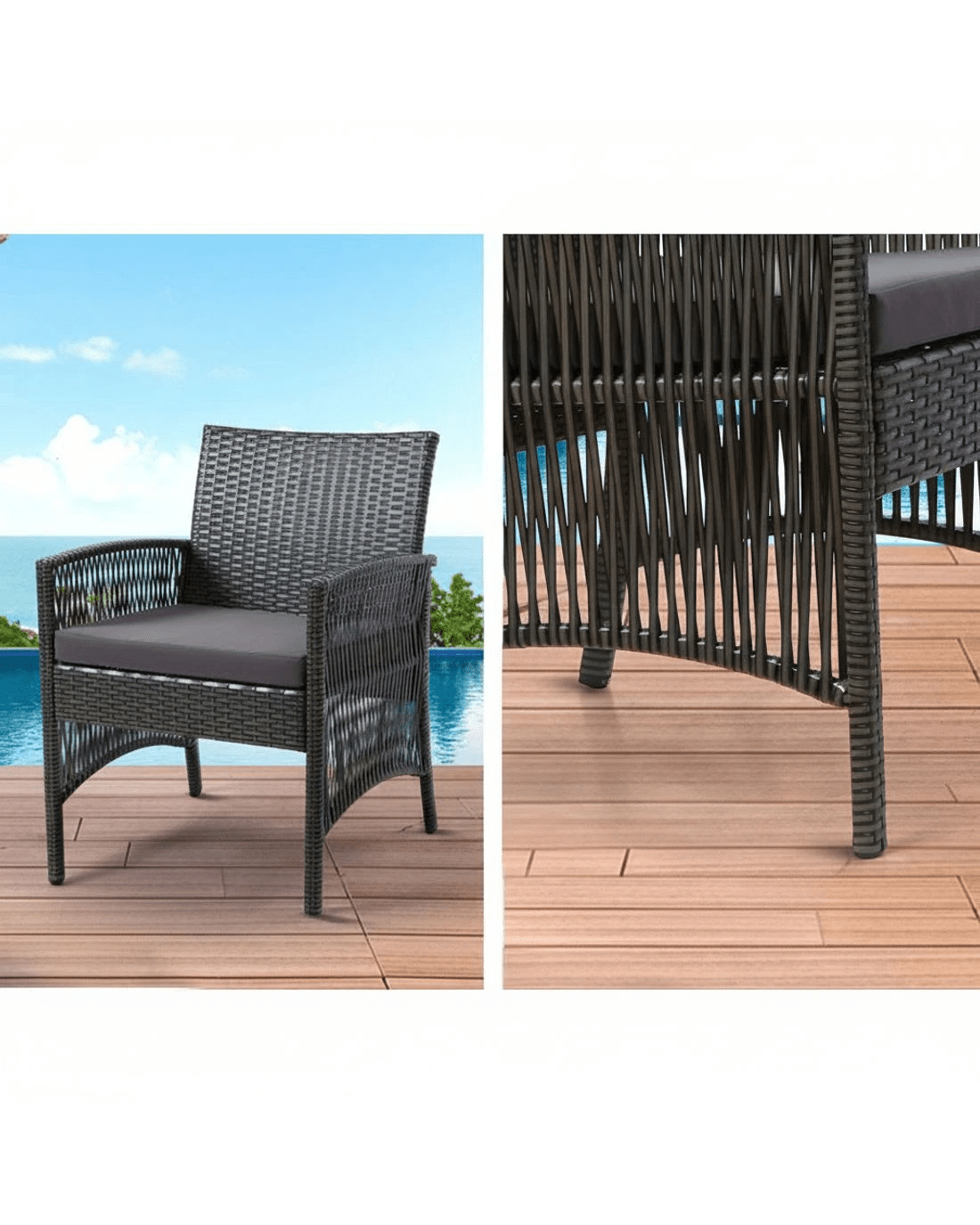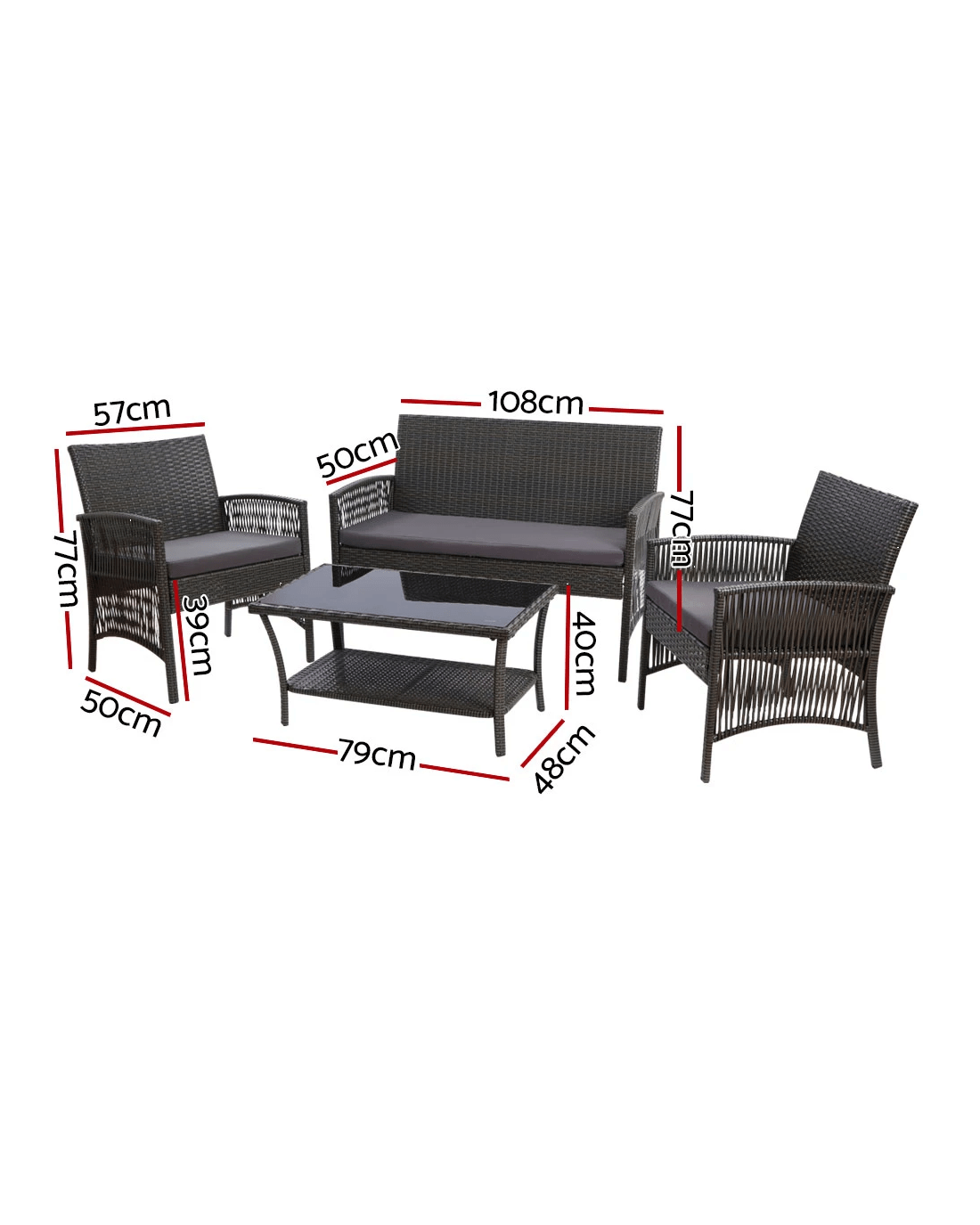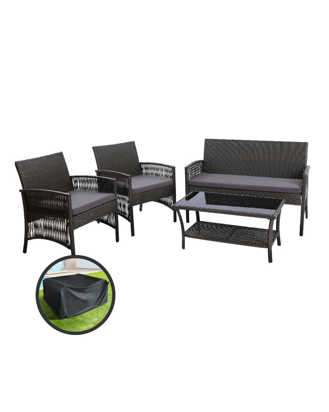 Meticulously crafted, our Gardeon 4-piece Rattan Outdoor Set comprises two armchairs, a two-seater and a matching table for a beautiful integrated look. Its presence will definitely add panache and style to your deck, patio or even living room. Made of PE wicker and a sturdy steel frame, this set is designed to last through all weather and the test of time. The 5mm thick tempered glass top with non-slip suction pads for the table also ensures strong and safe use with total peace of mind. Not least, the cushion covers are removable and washable to maintain their pristine appearance. There is even a bonus storage cover included for you to protect the set from sun and rain when not in use, so that you can keep enjoying your garden parties for many years to come.