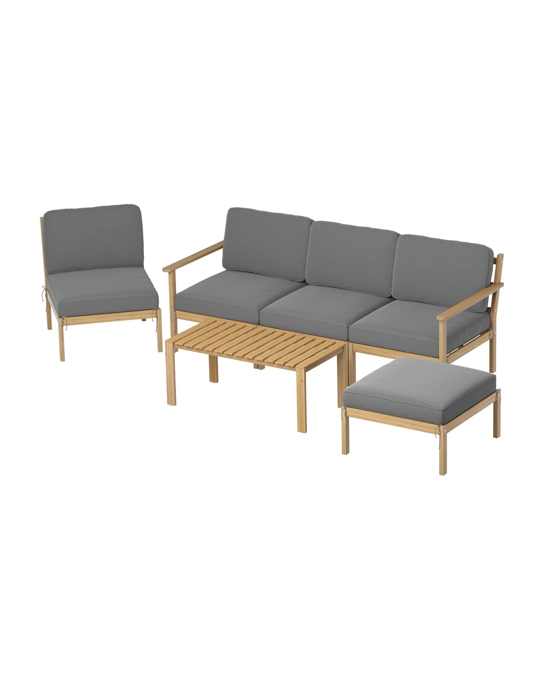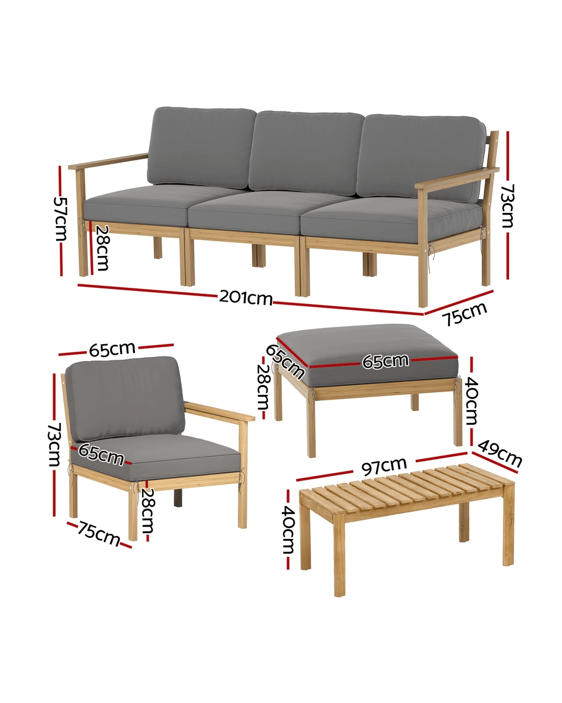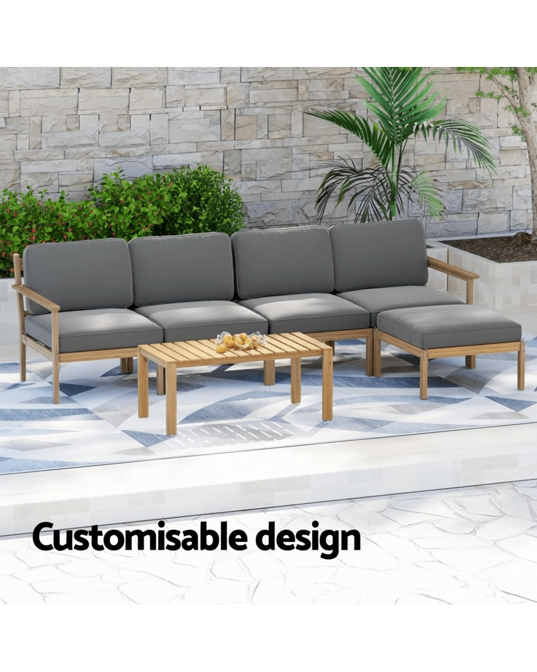 Get outdoors just in time for summer with the Gardeon 5-seater Outdoor Sofa Set. Featuring single sofa, armed sofa, a wide coffee table and an ottoman, there's plenty of space for the whole family. The conversation sofa set is easy to assemble, and you can easily configure the seating into your perfect outdoor set-up. The set uses solid wood, while the outdoor cushions feature water-resistant, UV-resistant covers, and a thick high-density foam core for comfort. The tabletop's slatted design easily drains during wet weather and has plenty of room to hold your outdoor essentials. Maintenance is as easy as wiping down the furniture, and you can remove the cushion covers for even easier cleaning. So what are you waiting for? Make the most out of the beautiful weather with a Gardeon 5-seater Outdoor Sofa Set.