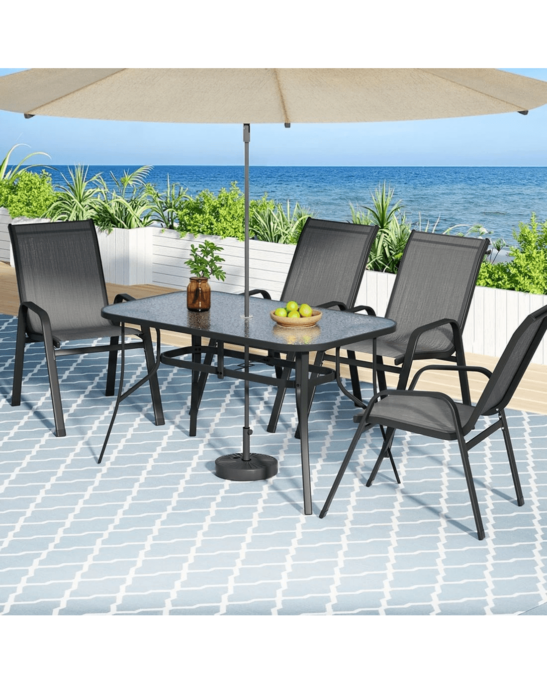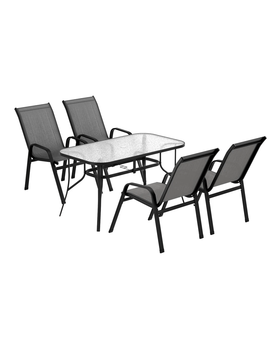 Elevate your outdoor living with the Gardeon 5 Piece Mesh Dining Set—perfect for sunny gatherings in fresh air! The rust-proof powder-coated steel frame ensures lasting durability, while the all-weather synthetic fabric resists sun, rain, and stains, keeping colors vibrant for years. The spacious tempered glass table features a convenient parasol hole for shade, and the stackable chairs maximize storage space. Floor protectors safeguard your surfaces while providing stability on uneven ground. With its sleek, versatile design, this set transitions seamlessly from patio to indoor dining. Low-maintenance and built for comfort, the Gardeon dining set is ideal for relaxing meals with family and friends under the open sky!