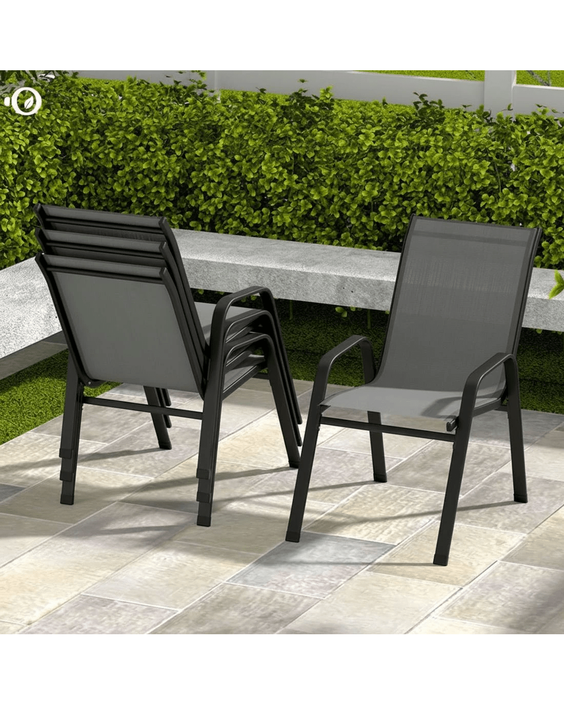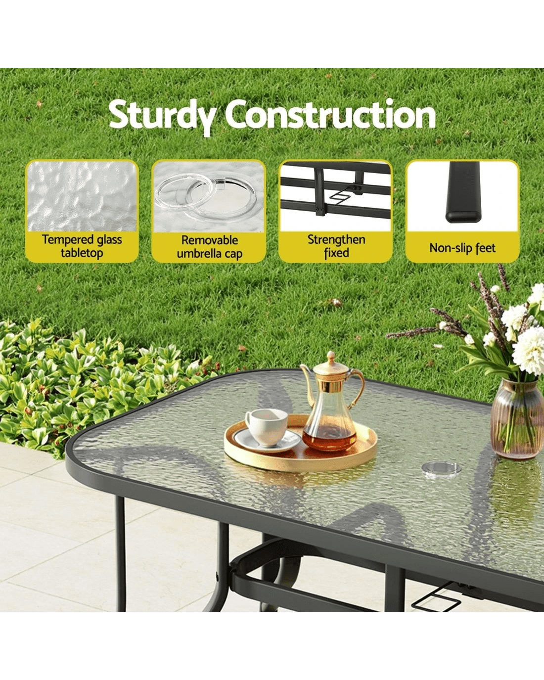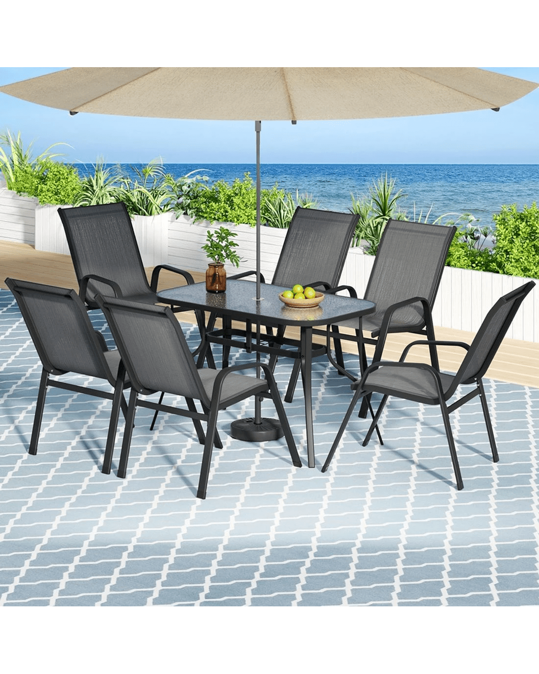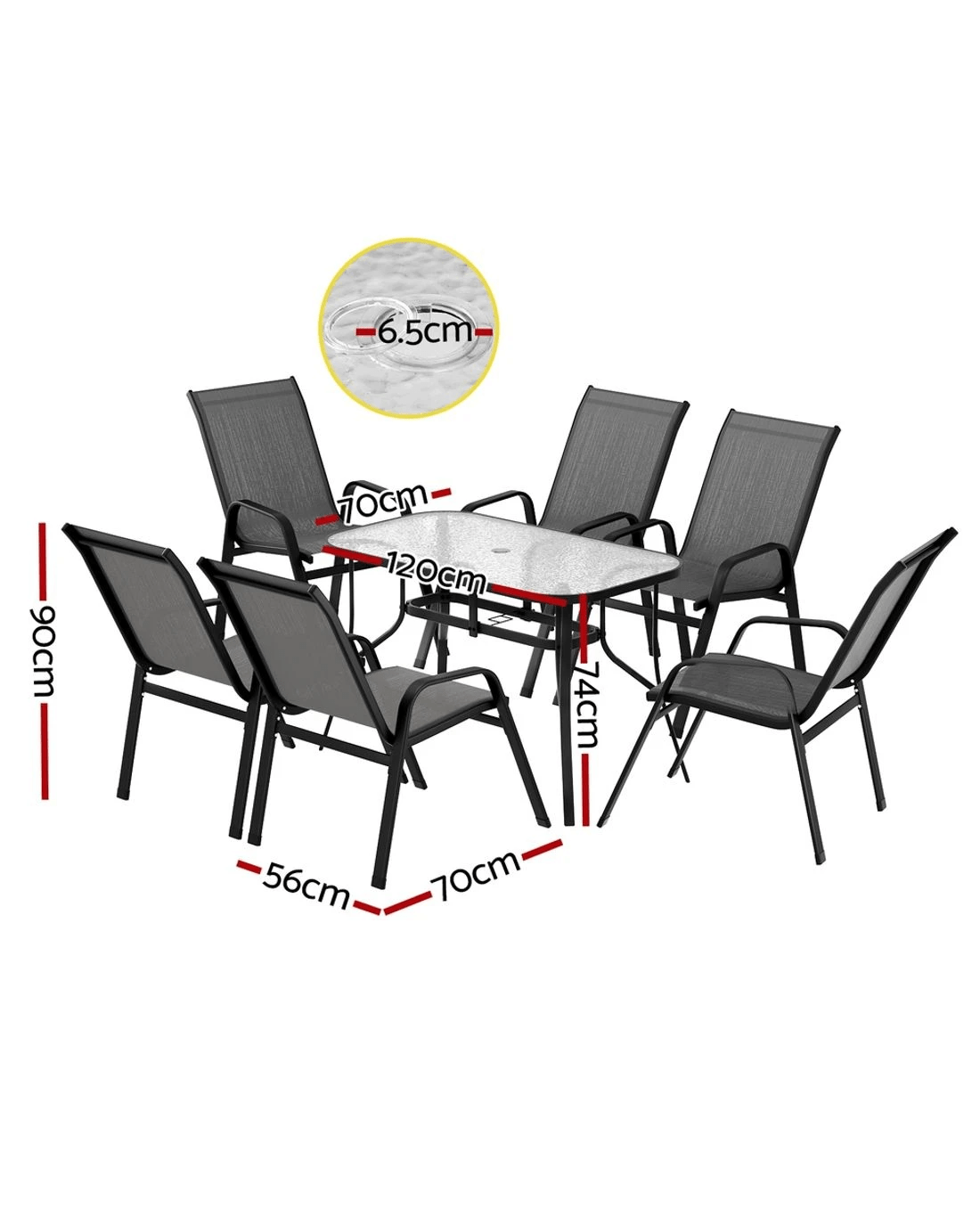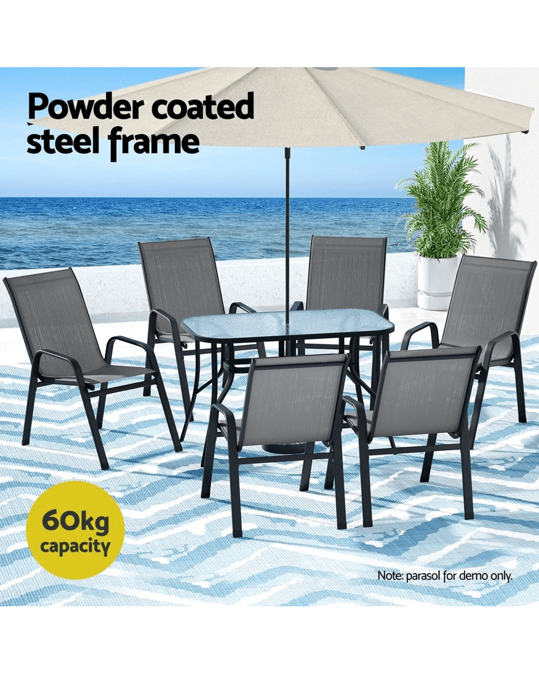 Elevate your outdoor living with the Gardeon 7 Piece Mesh Dining Set—perfect for sunny gatherings in fresh air! The rust-proof powder-coated steel frame ensures lasting durability, while the all-weather synthetic fabric resists sun, rain, and stains, keeping colors vibrant for years. The spacious tempered glass table features a convenient parasol hole for shade, and the stackable chairs maximize storage space. Floor protectors safeguard your surfaces while providing stability on uneven ground. With its sleek, versatile design, this set transitions seamlessly from patio to indoor dining. Low-maintenance and built for comfort, the Gardeon dining set is ideal for relaxing meals with family and friends under the open sky!