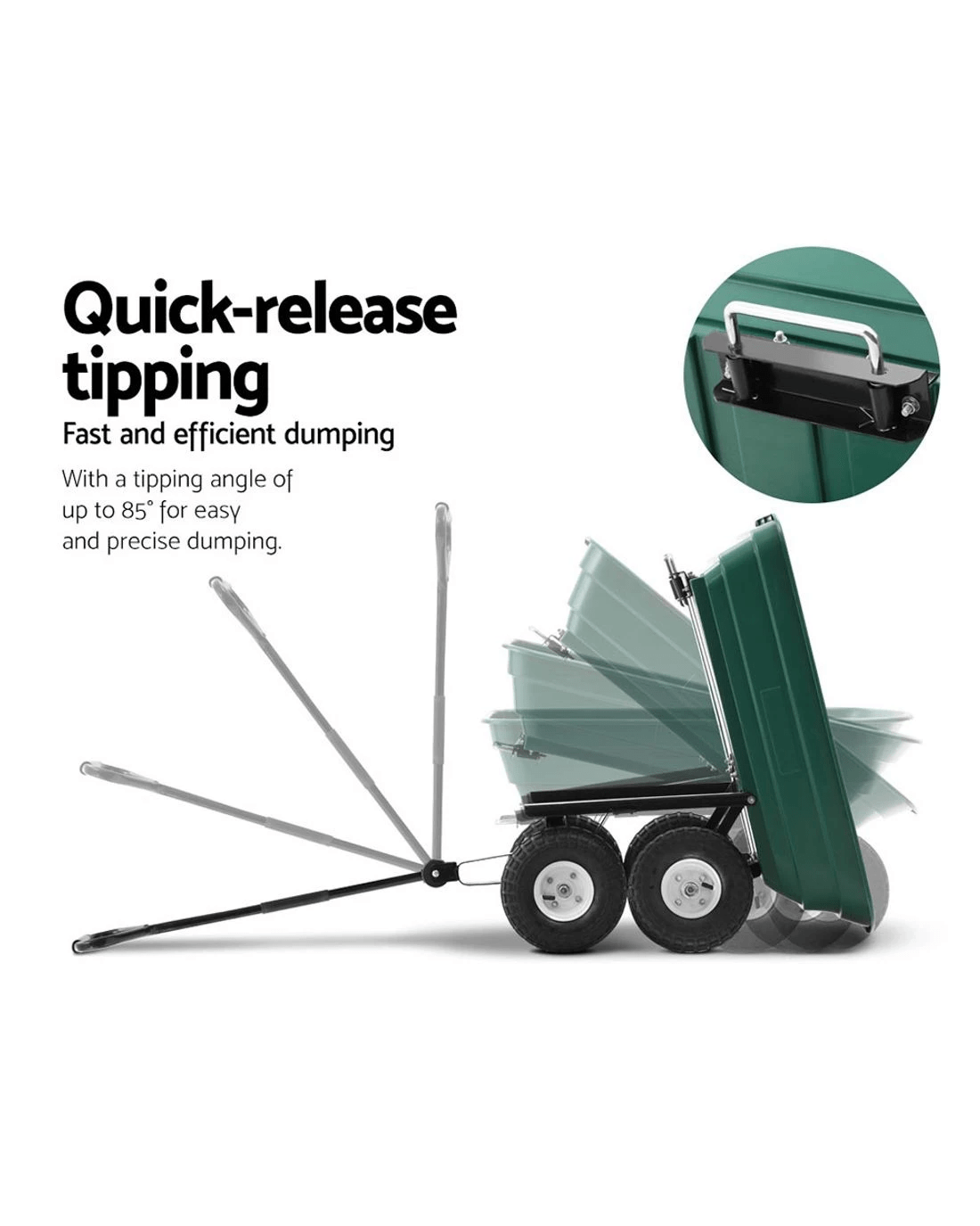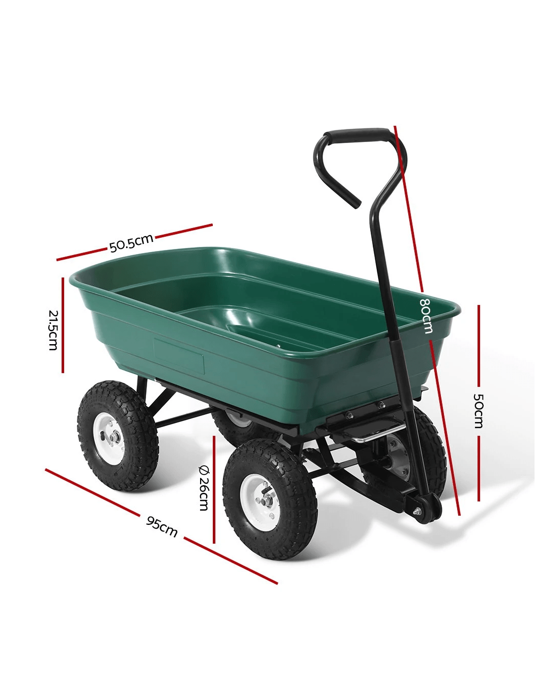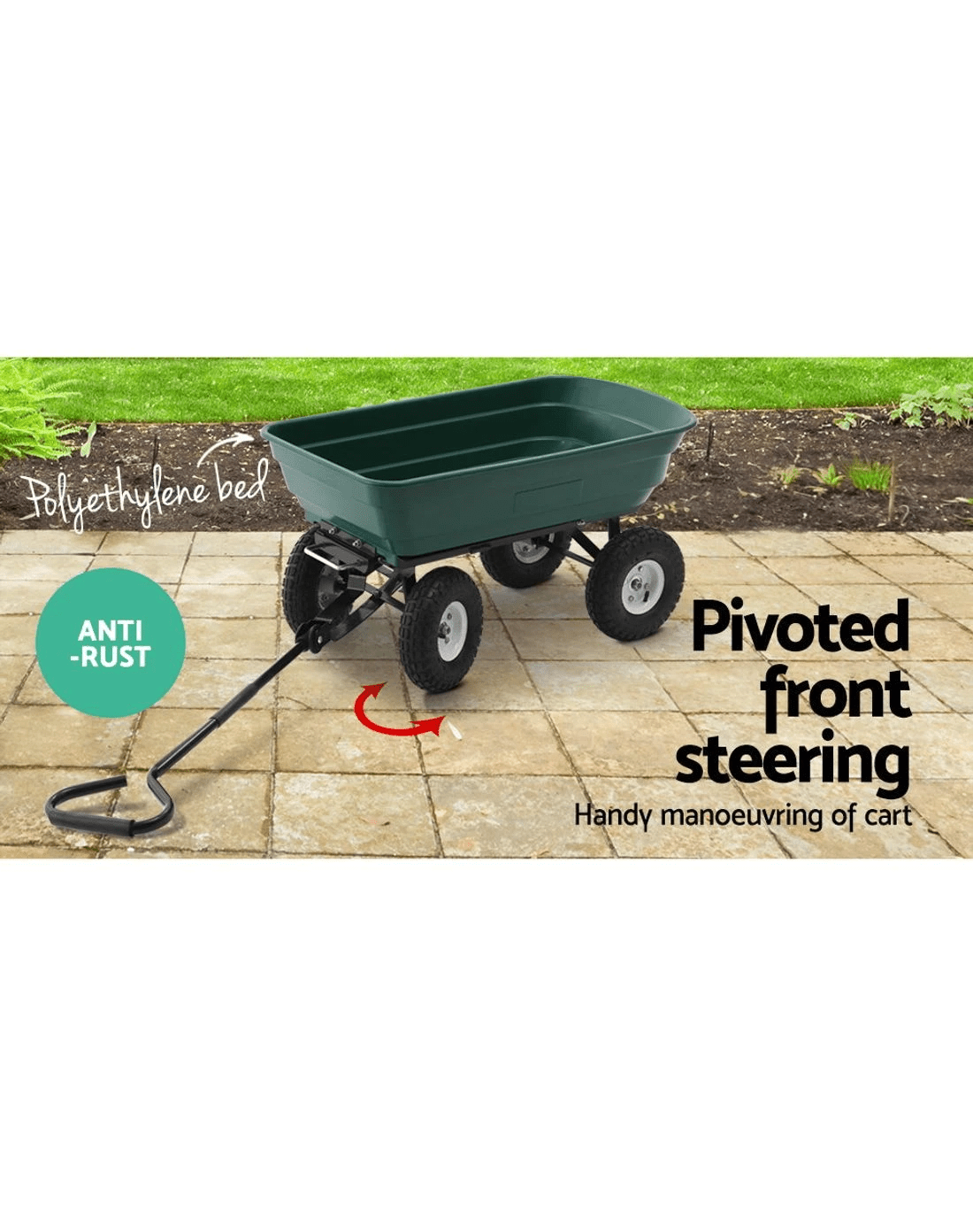 This handy Dump Cart can transport a variety of loads such as soil, plants, timber, pebbles, tools and much more. Thanks to its ultra-durable and rust-proof 75-litre polyethylene bed that can hold up to a massive 270kg of materials. But the real magic of this Garden Cart is its unique dumping function.