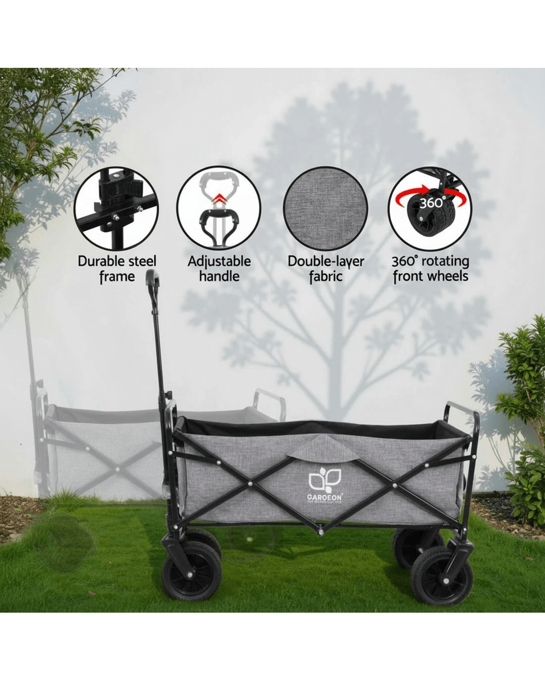 Introducing our versatile Gardeon garden cart: a multipurpose trolley for gardening, shopping, and outdoor adventures. With a sturdy steel frame, 360° rotating wheels, adjustable handle, and spacious interior, it's perfect for all your needs.