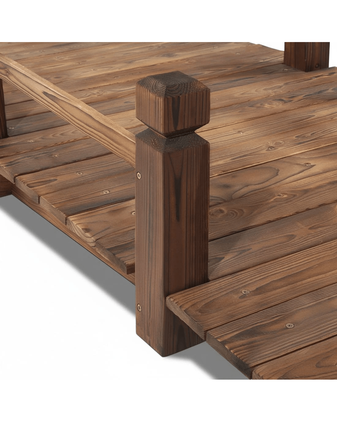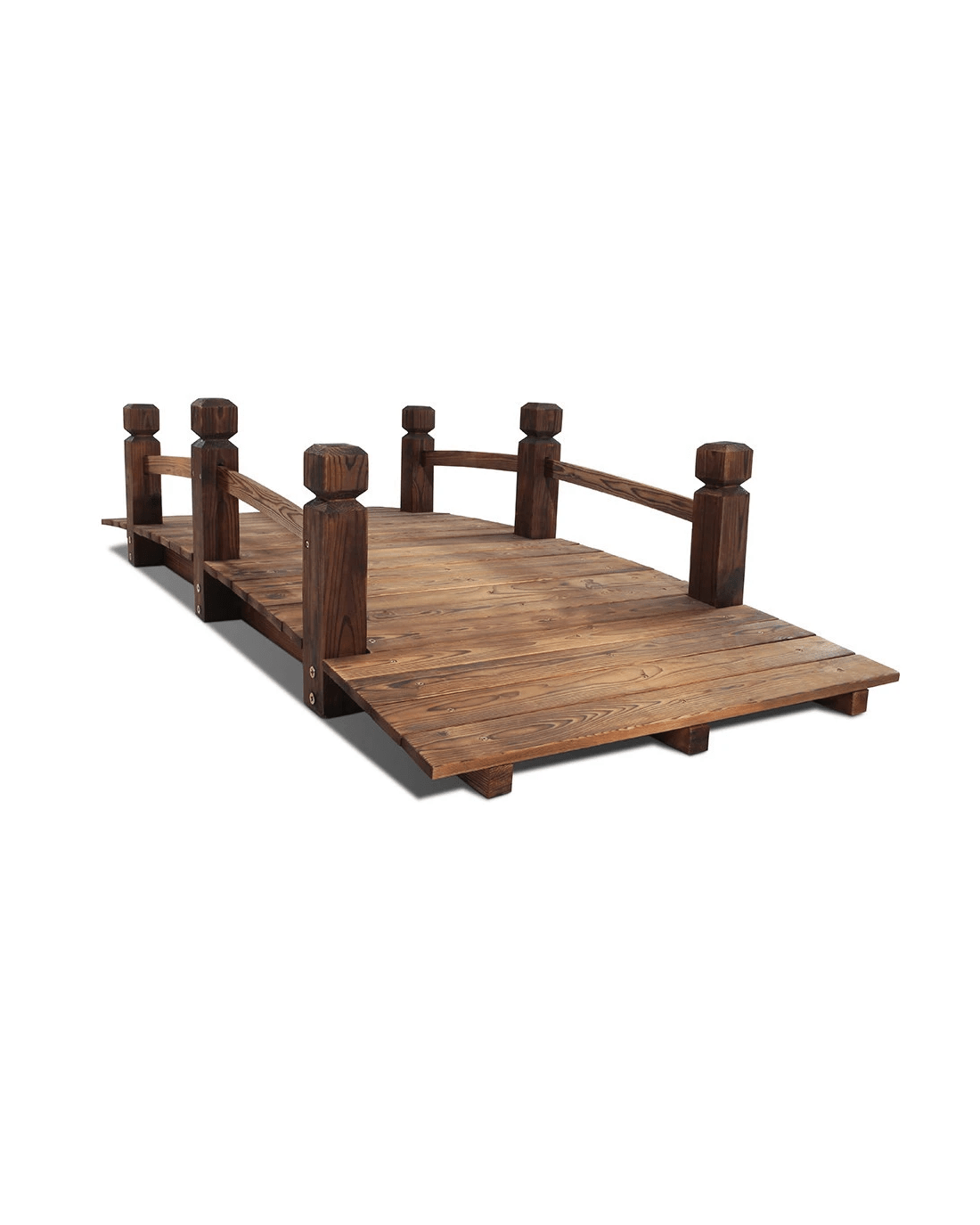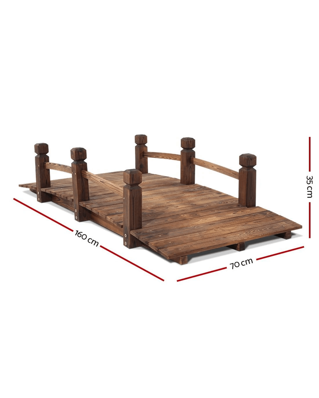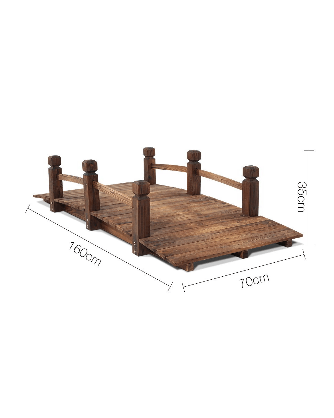 Meticulously crafted and relic-ed for period effect, our Wooden Garden Bridge is built of burnt Fir wood imported from Northern Europe that's known for its high strength and dimensional stability, with an extra thick 3-ply solid timber bottom to add extra support to the Bridge. The classic arch design Wooden Bridge can take up to 160kg in weight, so no worries about crossing it multiple times. Along the edges, sculpted side railings provide both aesthetic and functional appeal to the Wooden Bridge.