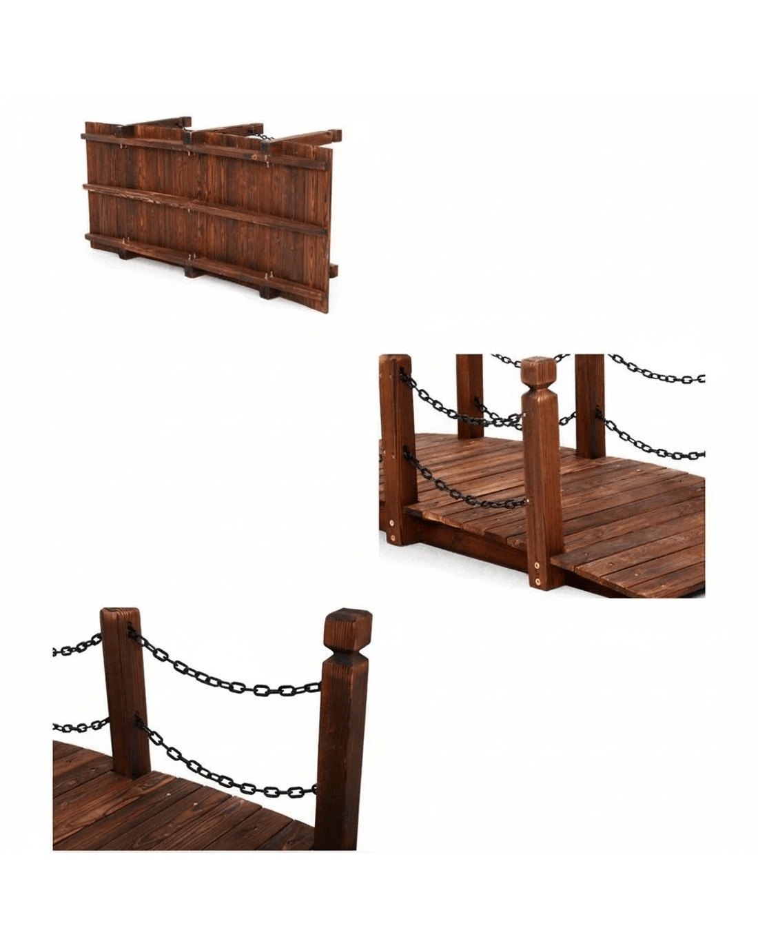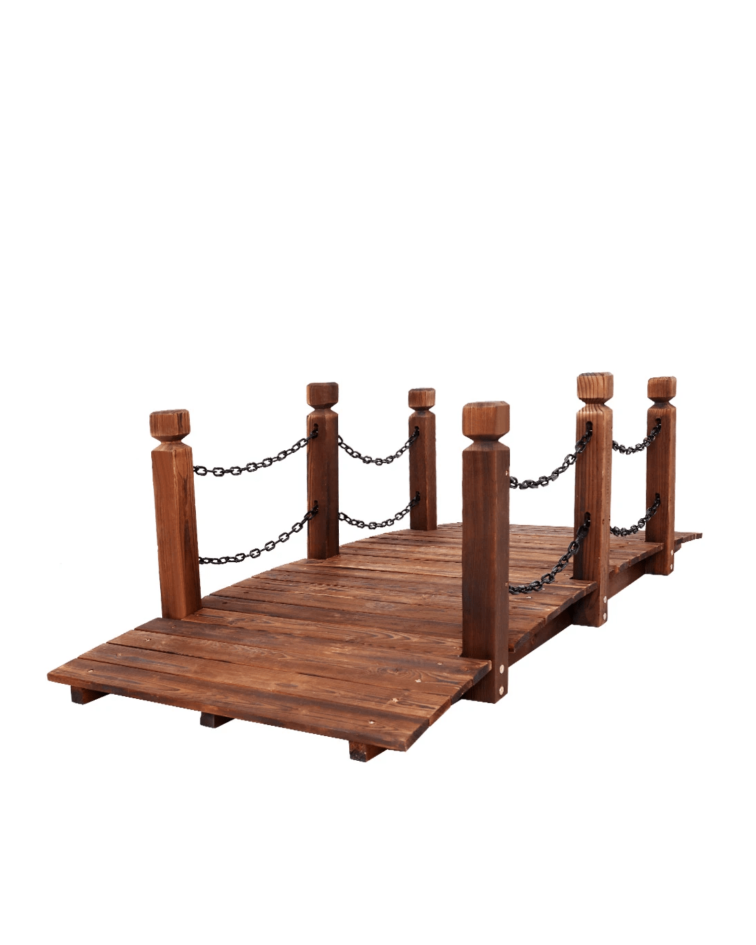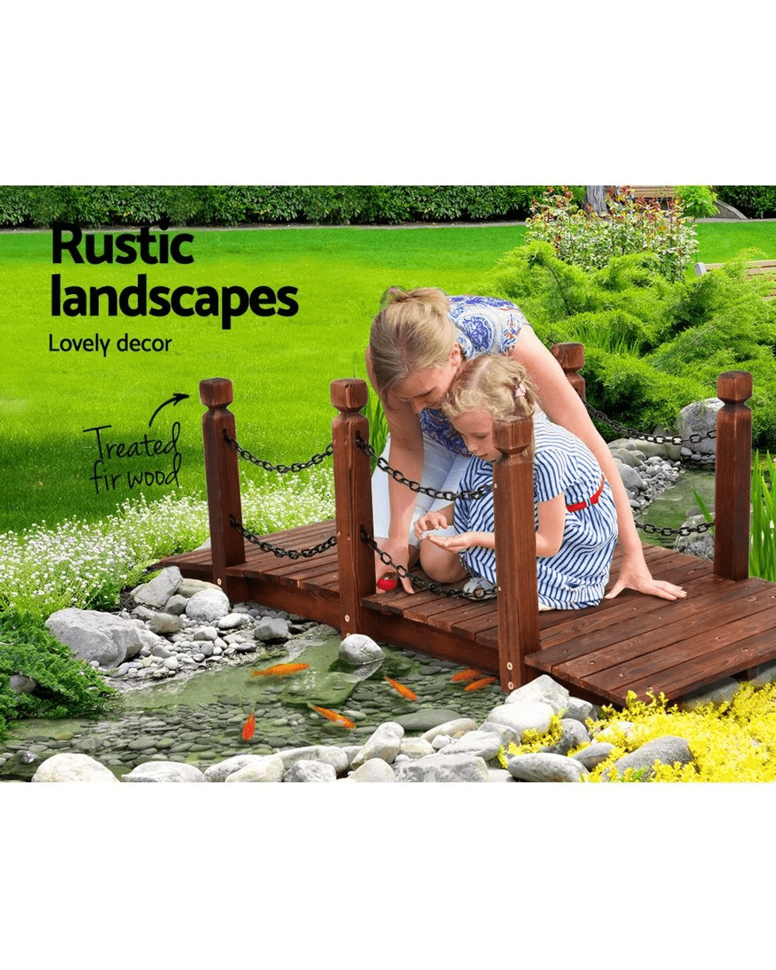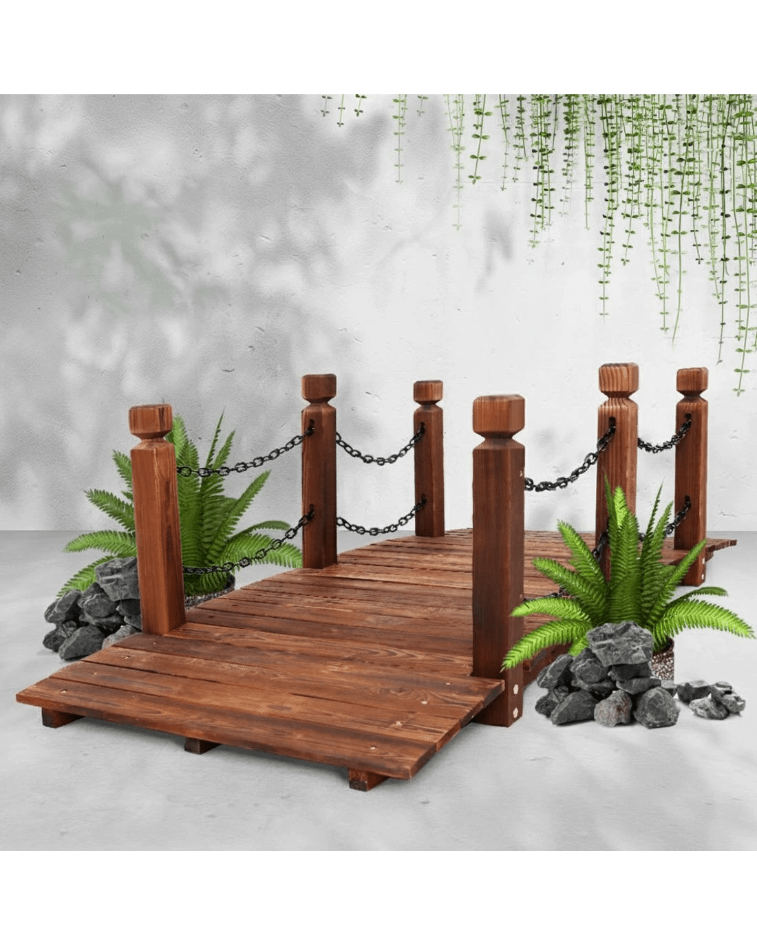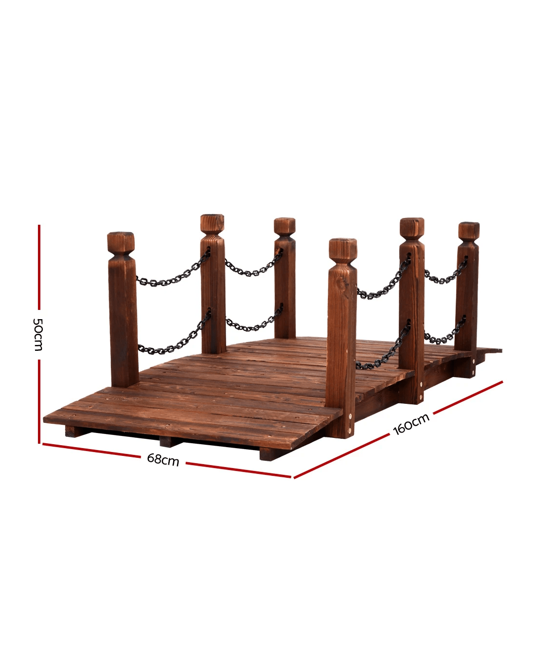 Want to add a bit of rustic quality to your garden, backyard or water feature? Perhaps a touch of nostalgia? You can now do it beautifully and realistically with our Gardeon Wooden Garden Bridge. Meticulously crafted and relic-ed for period effect, our garden bridge is built of burnt Fir wood imported from Northern Europe that is known for its high strength and dimensional stability, with an extra thick 3-ply solid timber bottom to add extra support to the bridge. The classic arch design bridge can take up to 160kg in weight, so no worries about crossing it multiple times. Along the edges, sculpted side railings with rustic chains provide both aesthetic and functional appeal. The entire assembly is weatherproof and eco-friendly and resistant to rot and pests for many years of assured beauty and use. So enhance your garden landscape with our wooden garden bridge today and cross over to the rustic side.
