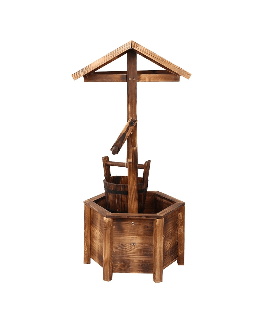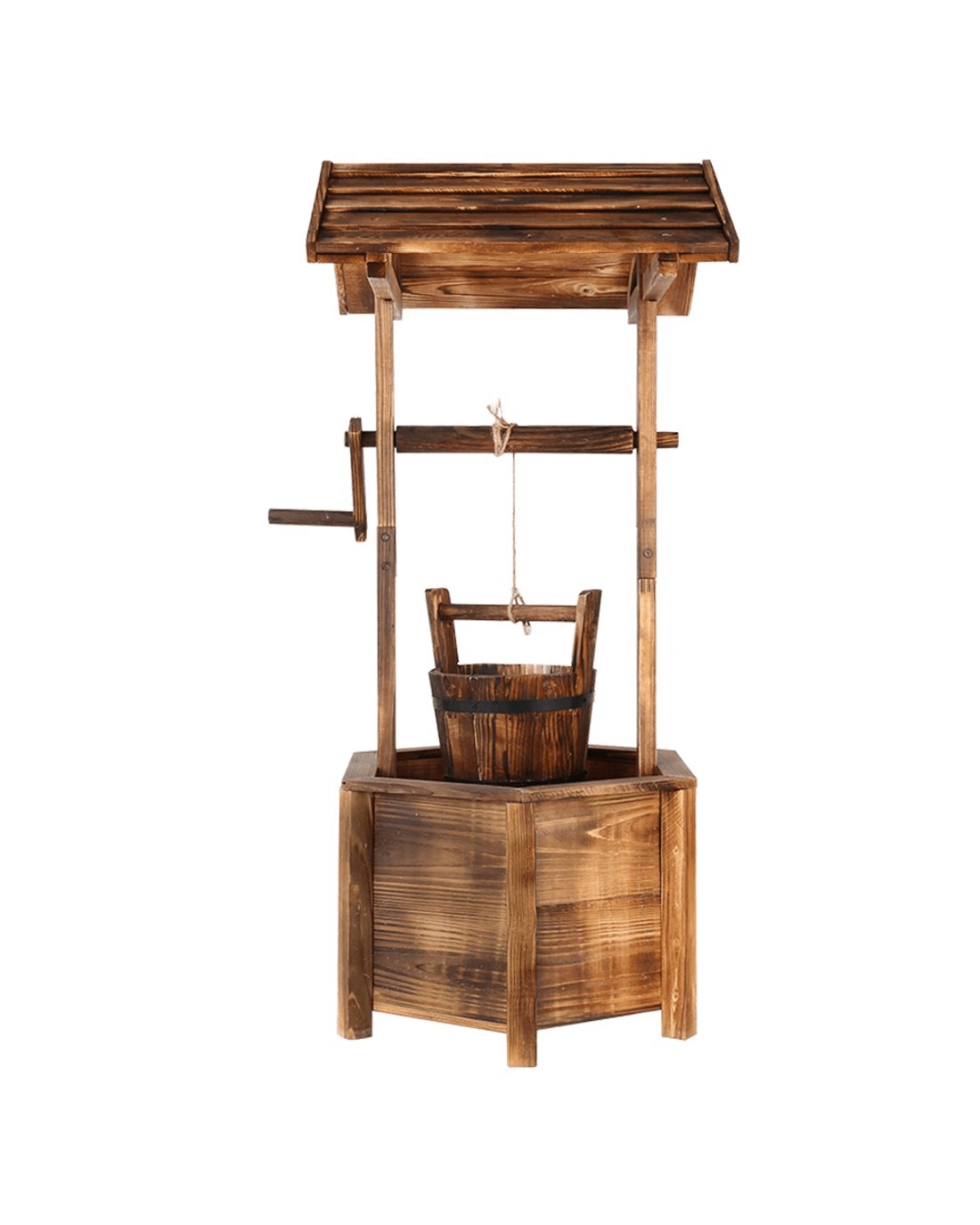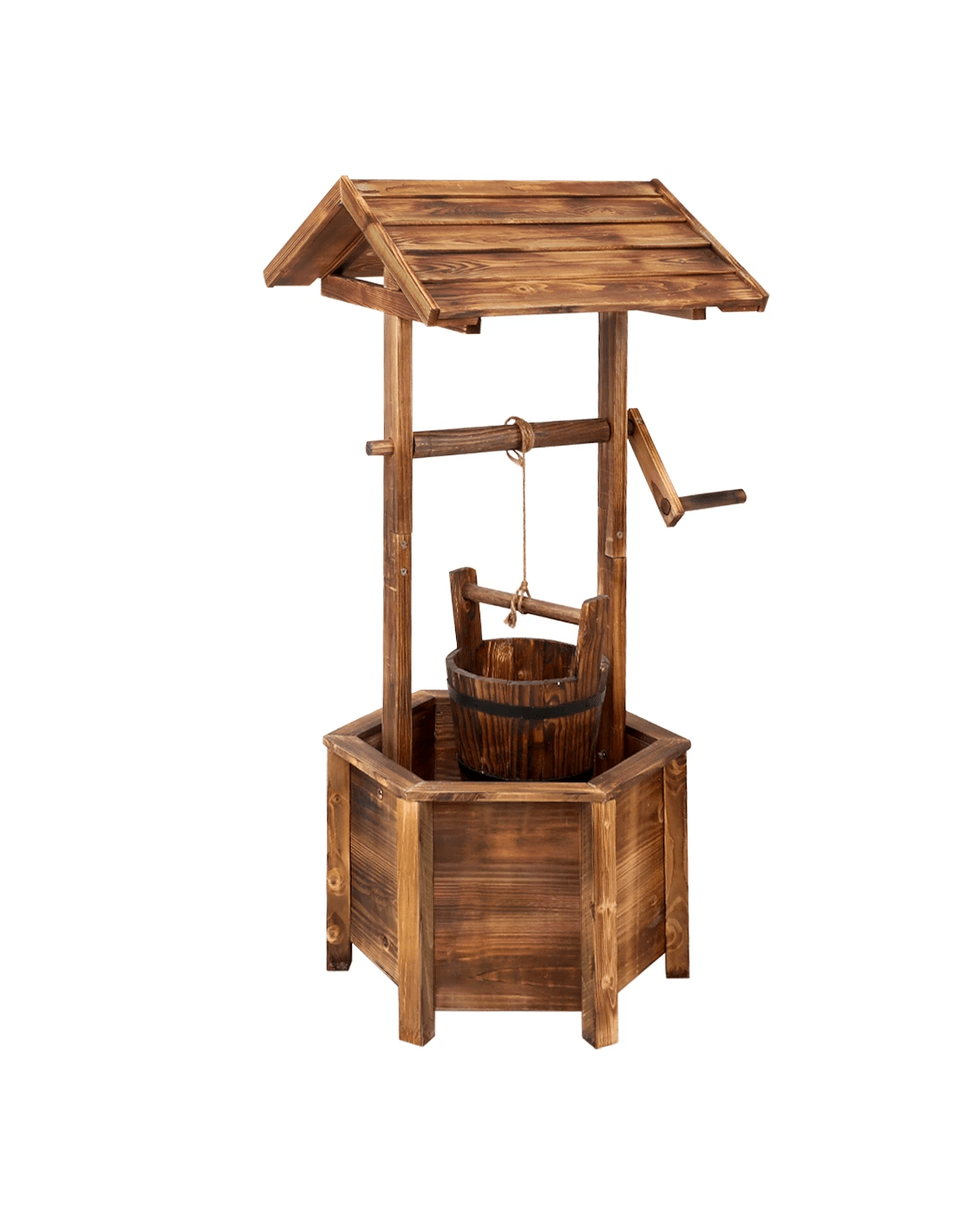 Give your home a rustic feel with our Gardeon Wooden Wishing Well. This lovely collectible evokes plenty of vintage charm as well as complementing your garden décor beautifully. Made from solid fir wood and given an extreme temperature carbonization treatment, the wishing well is designed to withstand all the weather elements as well as termites. Better still, the well can also be used as a plant bed, with the bucket as a pot and a decorative roof to shelter your flora from direct heat. The hexagonal base is also firm and steady and not easily toppled over by strong winds. Not least, this wishing well may just help to make your wishes come true in more ways than one.