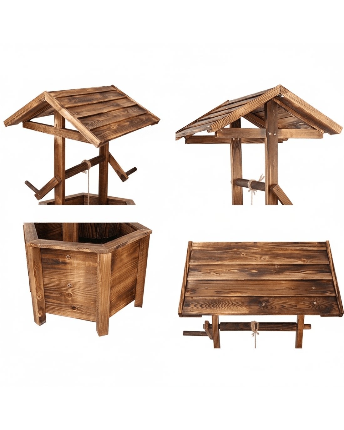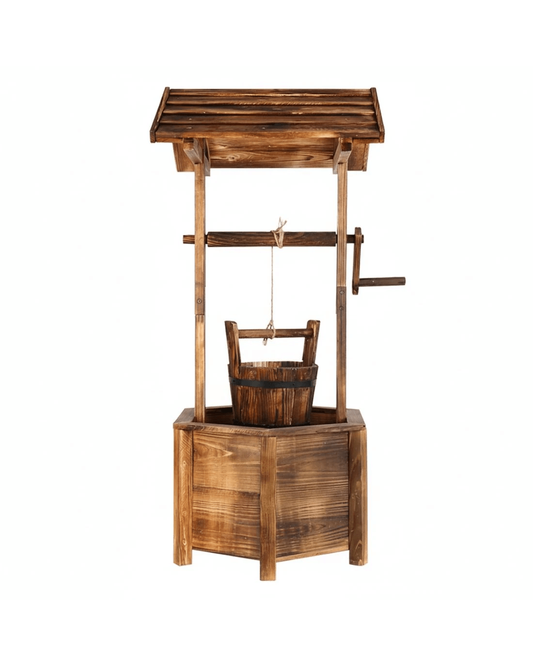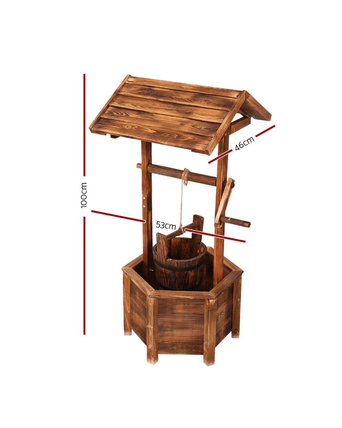 Give your home a rustic feel with our Gardeon Wooden Wishing Well. This lovely collectible evokes plenty of vintage charm as well as complementing your garden décor beautifully. Made from solid fir wood and given an extreme temperature carbonization treatment, the wishing well is designed to withstand all the weather elements as well as termites. Better still, the well can also be used as a plant bed, with the bucket as a pot and a decorative roof to shelter your flora from direct heat. The hexagonal base is also firm and steady and not easily toppled over by strong winds. Not least, this wishing well may just help to make your wishes come true in more ways than one.
