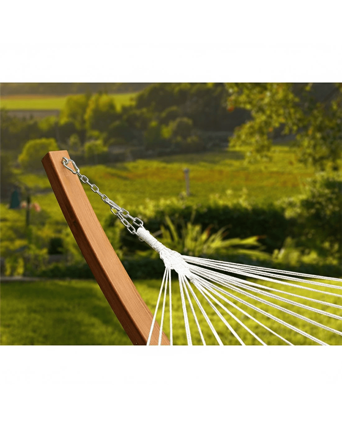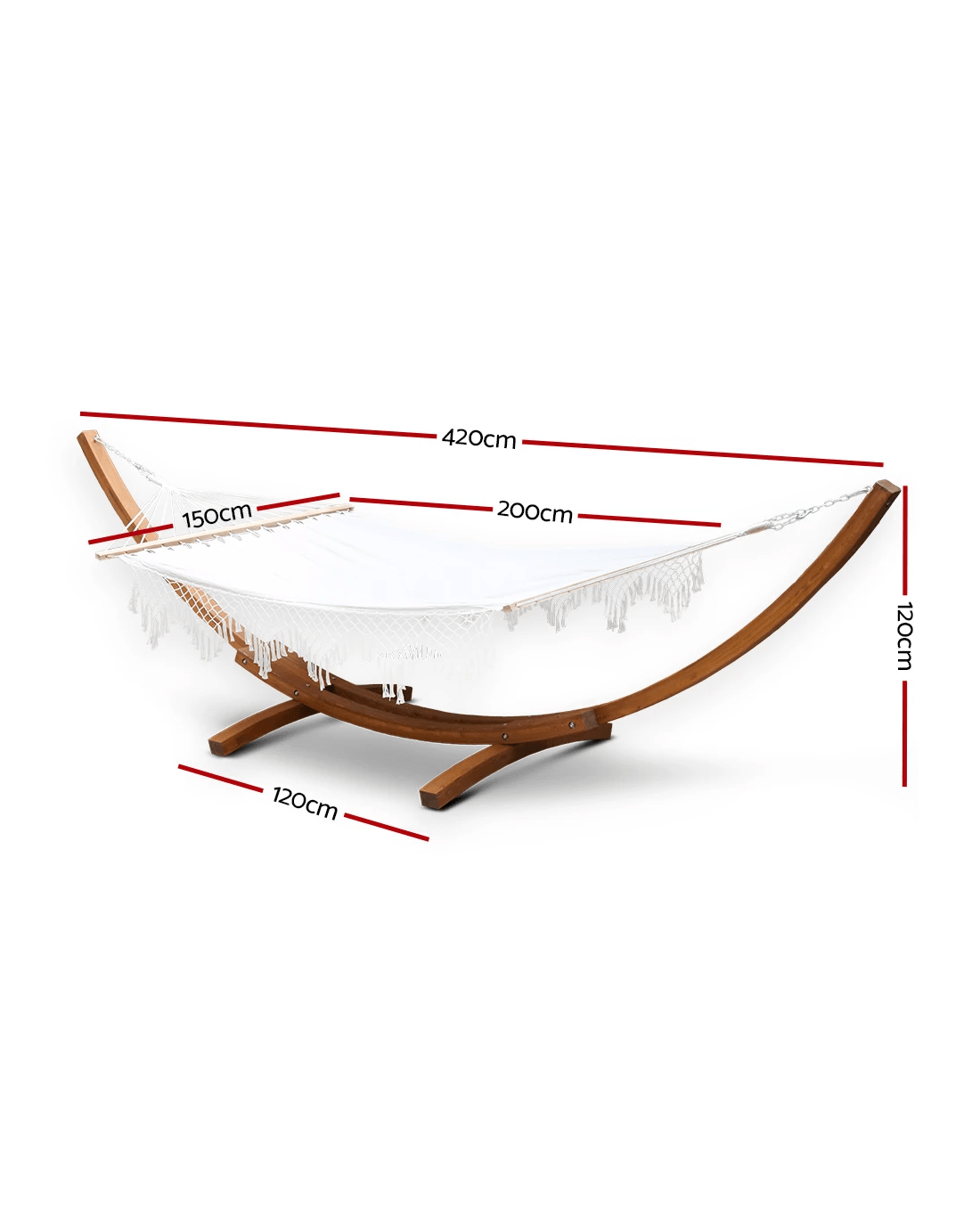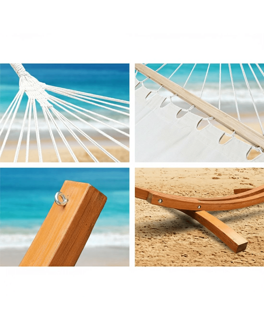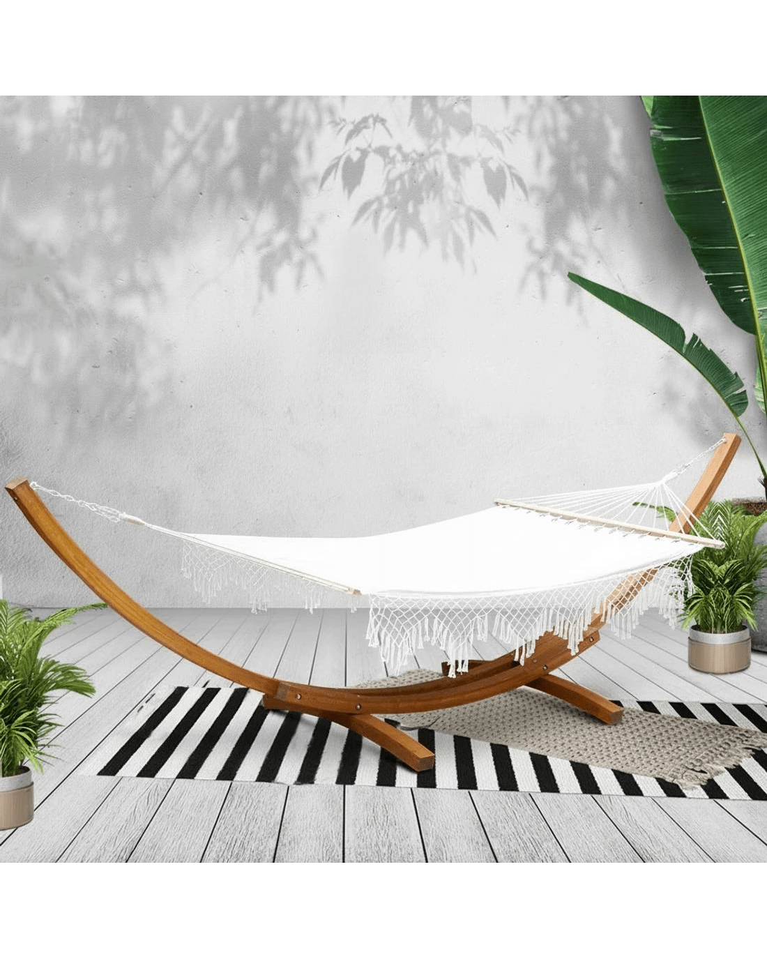 Picture yourself on a lazy Sunday, book in hand, swaying gently amidst the whispering trees. Our Gardeon Timber Hammock, crafted from durable larch wood, is your perfect retreat. Its soft-touch polyester-cotton blend ensures cozy comfort as you read, nap, or daydream. Combining luxury with versatility, it's the ideal spot for your moments of relaxation.