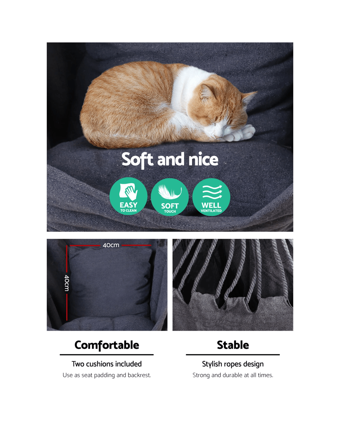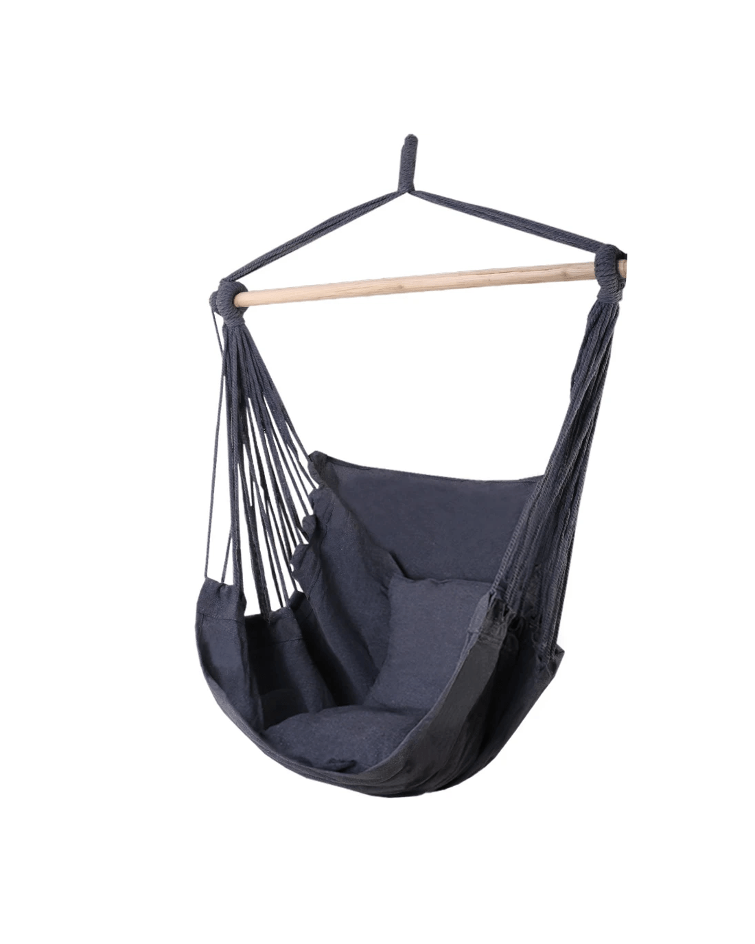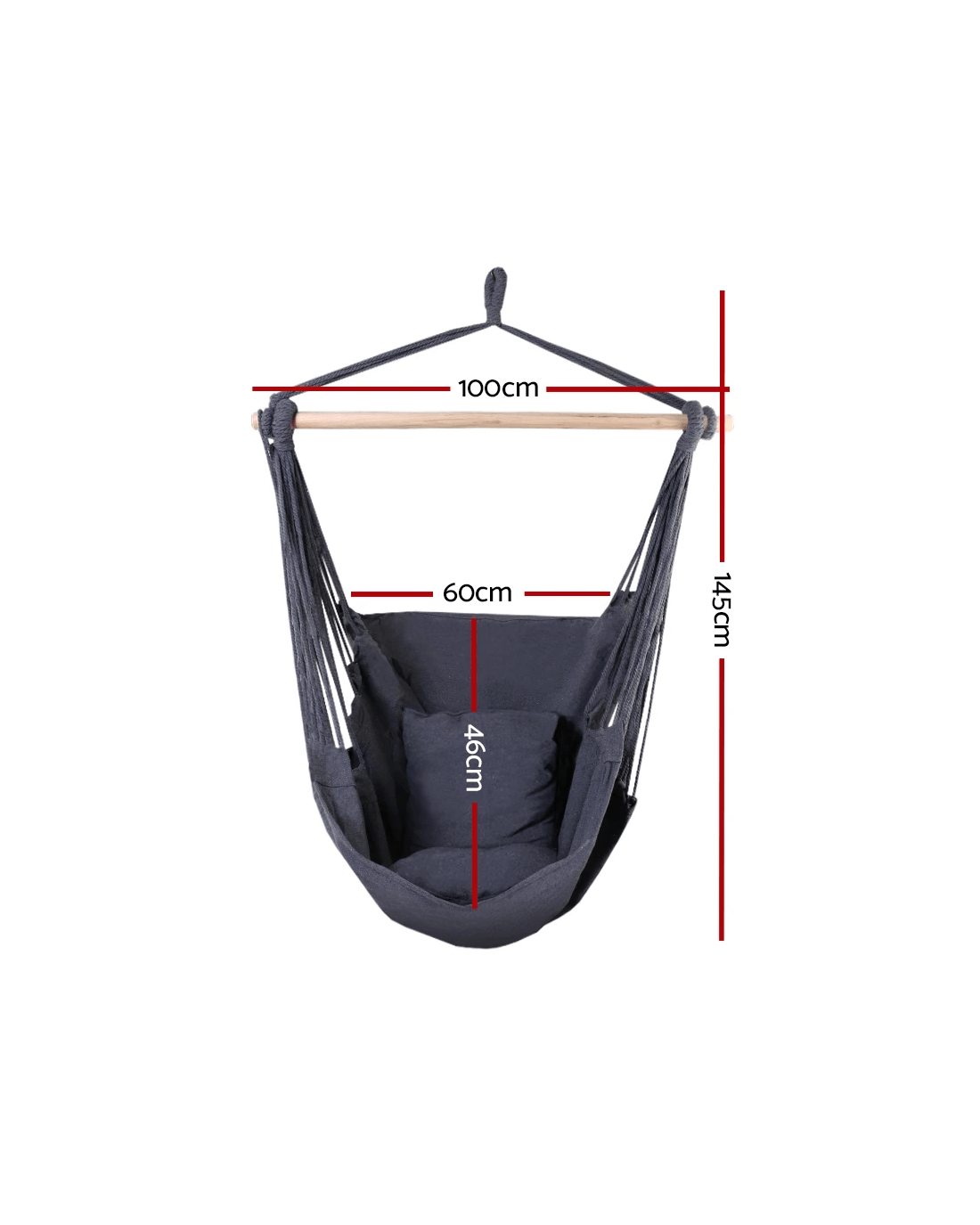 Made from quality polyester cotton with a solid timber rail, our Hammock Chair can rope in a maximum of 180kg in weight. It's easy to install with only one anchoring point and is absolutely safe and strong.