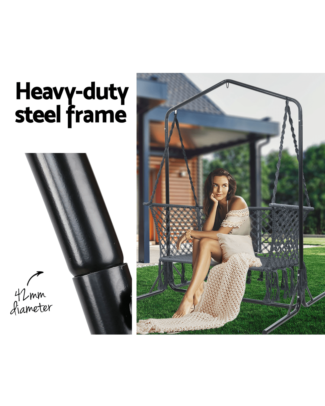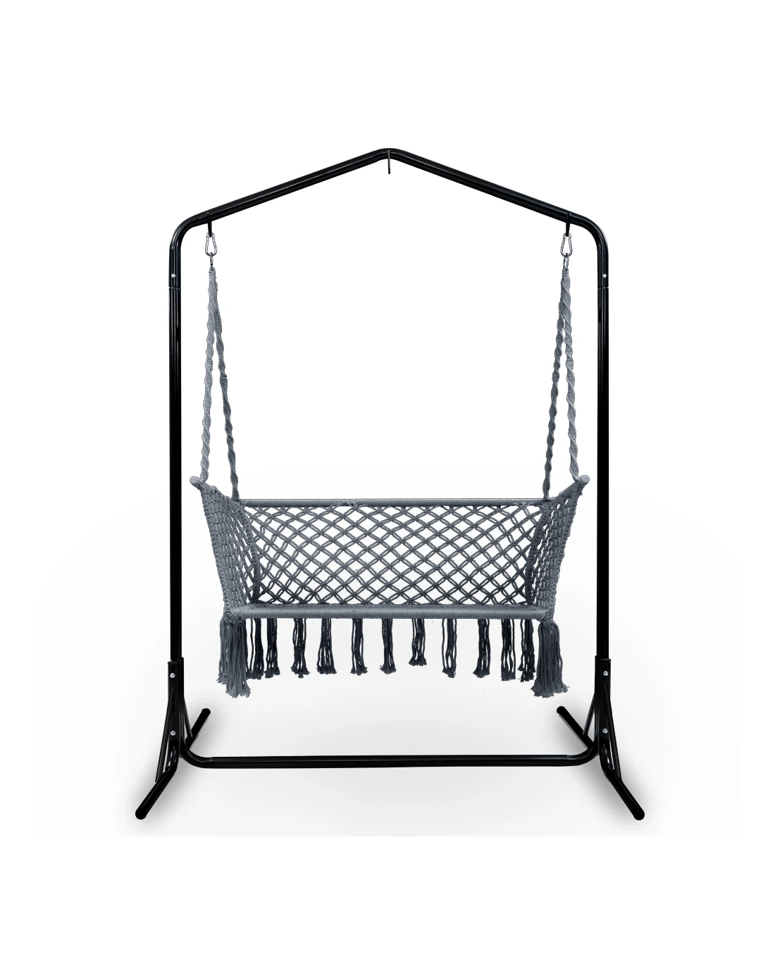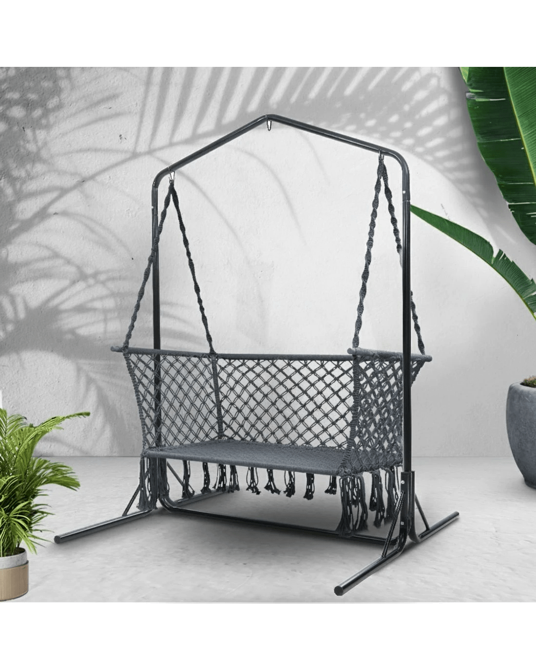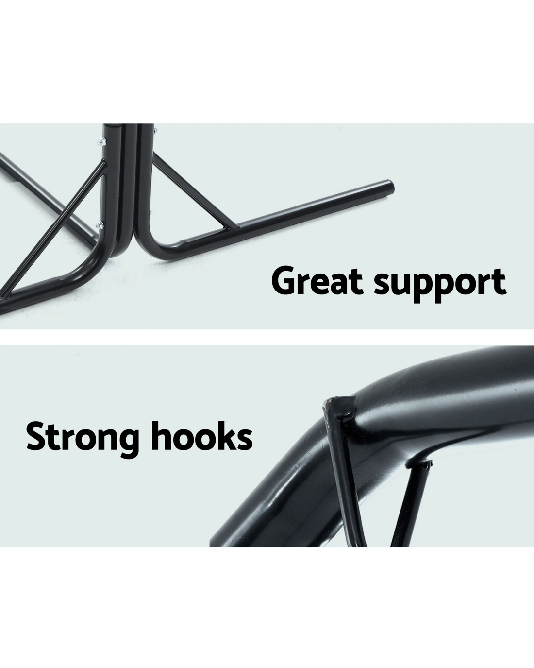 Need a heavy-duty stand for your hammock chair? Look no further than the Gardeon Full-frame Hammock Chair Stand. One of our popular models, the full-frame stand remains a firm favourite with customers who love to have their hammock chairs indoors or outdoors. Crafted from powder-coated steel, the 1.6m frame is designed to be weather-resistant and rust-resistant and strong enough to withstand robust use of up to 200kg weight capacity. Simply hook up your single or 2-seater hammock chair to the reinforced S-hook, adjust the desired height and you are ready for a relaxing time in the chair in the backyard, at the balcony, by the pool side or simply in your living room. Not least, the wide base ensures that the entire ensemble is safe and sturdy for many years of wonderful relaxation and leisure with your hammock chair.