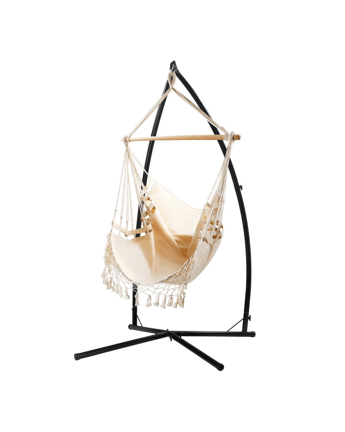 Gardeon hanging hammock chair set is a piece of excellent furniture perfect for outdoor and indoor use. It is made from quality polyester cotton blend fabric and has a solid timber rail for strength and durability, and the powder-coated steel frame is designed to be weather and rust-resistant. Our cross-shaped base hammock chair can hold up to 120kg in weight and offers stability. Plus, it's easy to install with one single attachment point for absolute safety. This versatile furniture set is suitable to be placed by the poolside, in the backyard, or in any corner of your home. Not least, this chair offers ample support to your body.