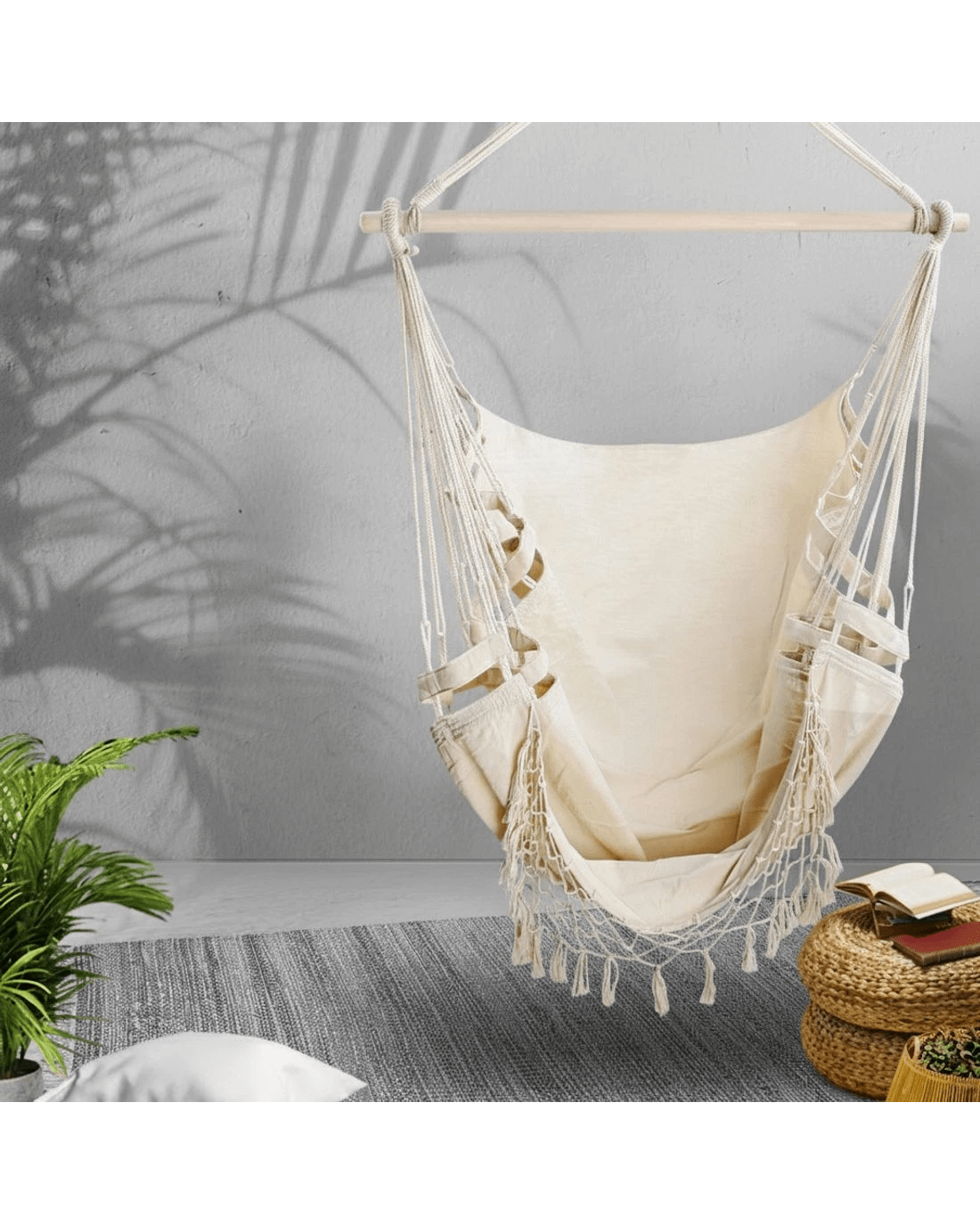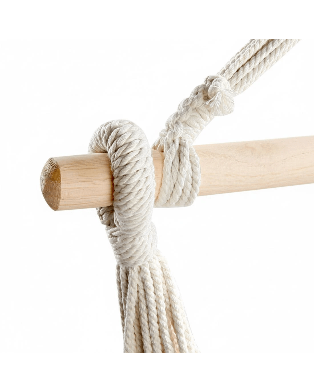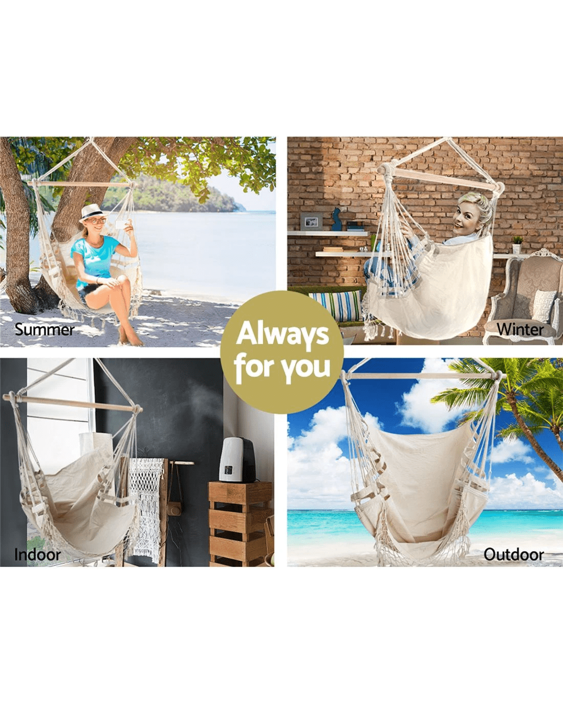 Made from quality polyester cotton with a solid timber rail, our Hammock Chair can rope in a maximum of 120kg in weight. It's easy to install with only one anchoring point and is absolutely safe and strong.