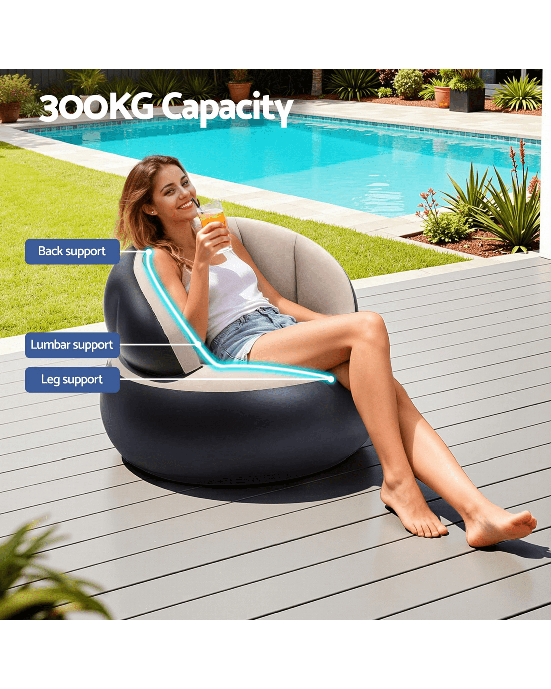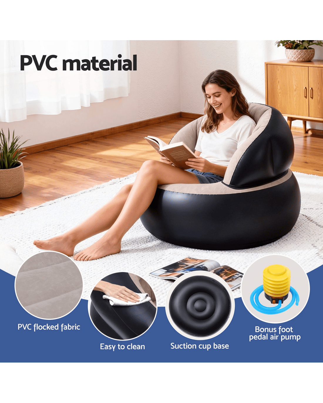 Elevate your comfort with the Gardeon inflatable sofa , complete with an air pump. Designed for all ages, it's the perfect spot for family gatherings, reading, or relaxing outdoors. Crafted from durable, flocked PVC material that stands up to regular use, this sofa offers a soft and smooth feel for superior comfort. Its convenient foldable design ensures easy storage, helping you maintain a tidy space. Perfect for the living room, bedroom, dorm, or outdoor adventures like camping and beach trips, this Gardeon sofa seamlessly blends practical function into any part of your home and lifestyle.