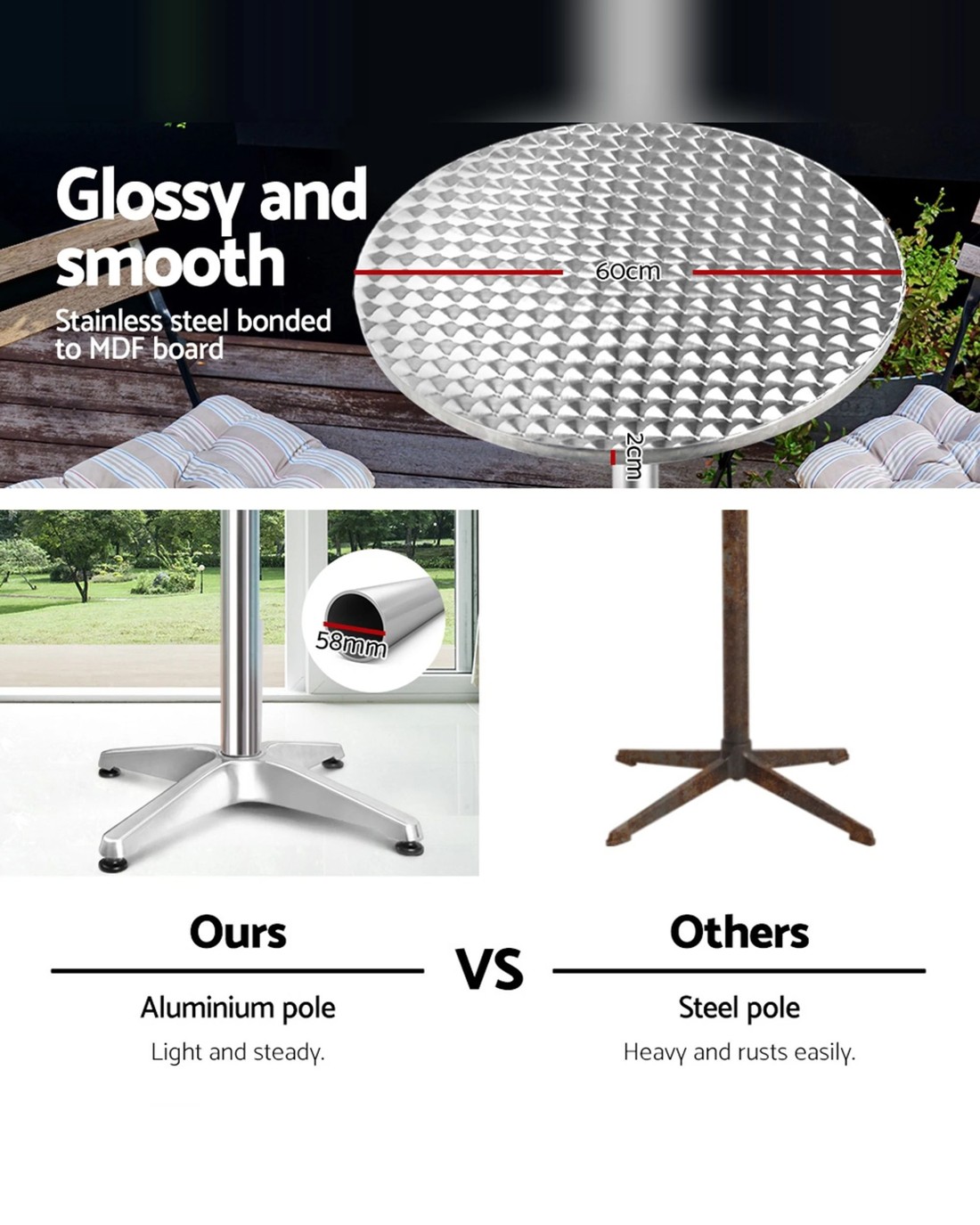 Entertain in style with our snazzy stainless steel bar round table. Stunning in looks and equally as functional, this bar table has plenty going for it. Two adjustable heights of 70cm or 110cm to set the table at the preferred level to suit your bar stool or chairs, a smooth stainless steel top and not least, a sturdy base to ensure your drinks only go down one way and definitely not on the floor. Stowing it away is just a simple flick of the quick release lock to fold it away. Perfect for bistros, cafes, pool areas and home patios, our bar table is worth drinking to.
