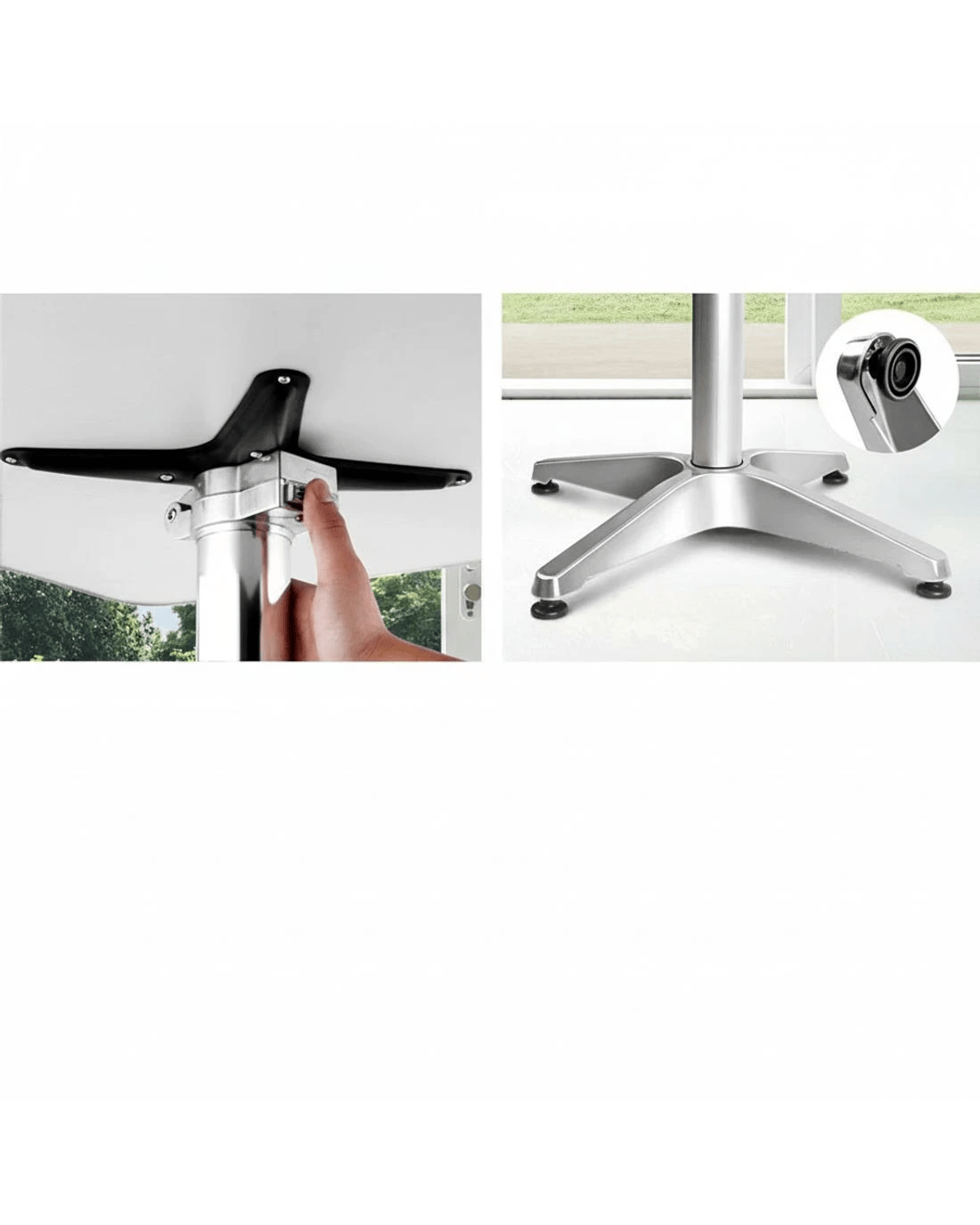 Two adjustable heights of 70cm or 110cm to set the table at the preferred level to suit your bar stool or chairs, a smooth stainless steel top and not least, a sturdy aluminium base to ensure your drinks only go down one way and definitely not on the floor. The base can also be adjusted to level things up on uneven floors. Stowing it away is just a simple flick of the quick release lock to fold it away.