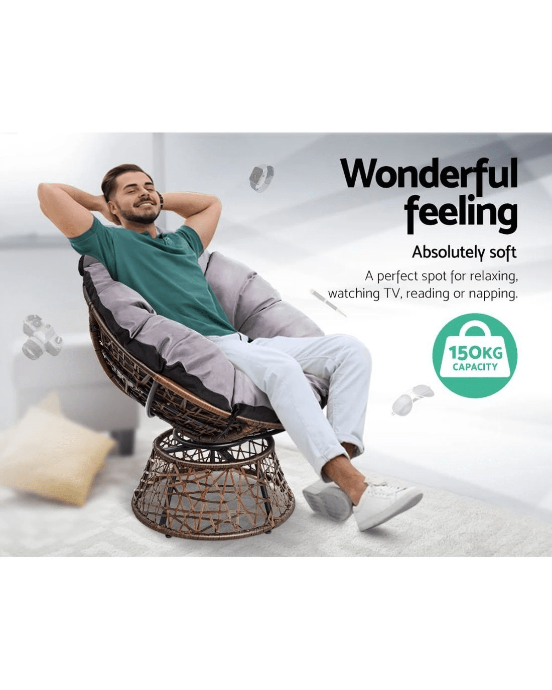 Indulge in pampered comfort with the Gardeon Papasan Chair. A rotund PE-wicker chair that comes with a thick luscious 10cm padding that is perfect for use indoors or outdoors, summer or winter. With intricate wicker weaving around a durable steel frame, the Papasan Chair is meticulously crafted to bring out its unique style and strength. The chair can be rotated all round for easy facing in any direction. Not least, the covers are UV-resistant and removable for easy cleaning.