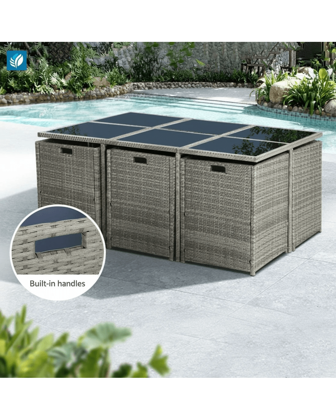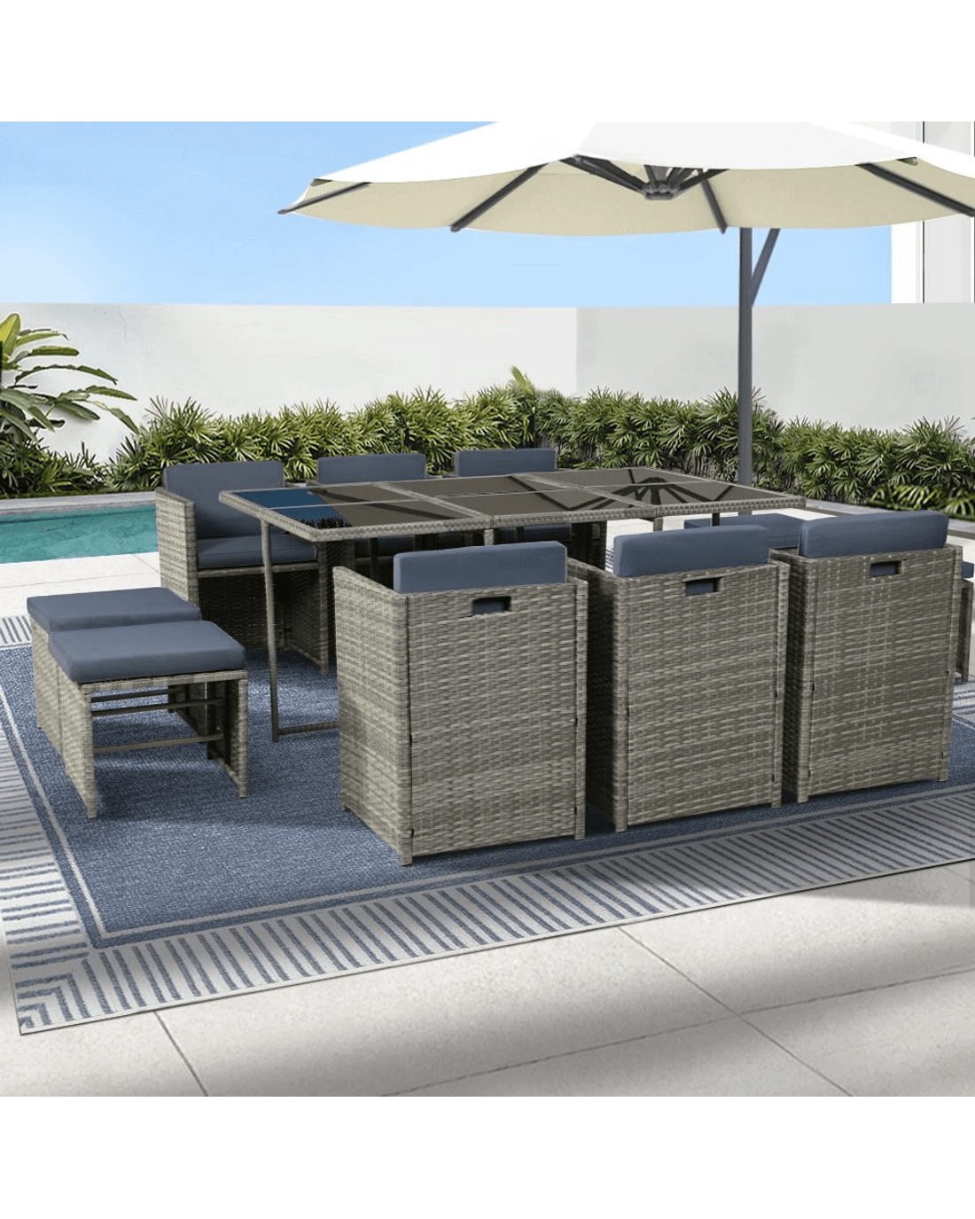 Looking to create a chic and gorgeous outdoor dining setting? The Gardeon 10-seater wicker outdoor dining set is a must purchase. It will liven up your outdoor space and help you achieve an elegant space where you can enjoy day and night and summer and winter. This 11-piece set comprises of six chairs, four ottomans, and a large table. It boasts an integrated design that helps save space. The ottomans can be pushed under the chairs when not needed. All the seat and back cushions come with thick, high-density soft padding that ensures your comfort always. Additionally, the removable cushion covers are water-resistant to suit different seasons. Furthermore, our outdoor set features a lovely wicker weave for a touch of tropical charm, and the UV-resistant PE wicker with weather-resistant steel frame is suitable for all-season use. The large table with thick tempered glass top, durable frame, and stable cross construction ensures strength, durability, and stability. This set also comes with a bonus water-resistant storage cover that offer protection from all seasons. Our wicker outdoor dining set will withstand the test of time. You can create a praise-worthy spot with just a little creativity that will wow your guests. Shop it for your home today.