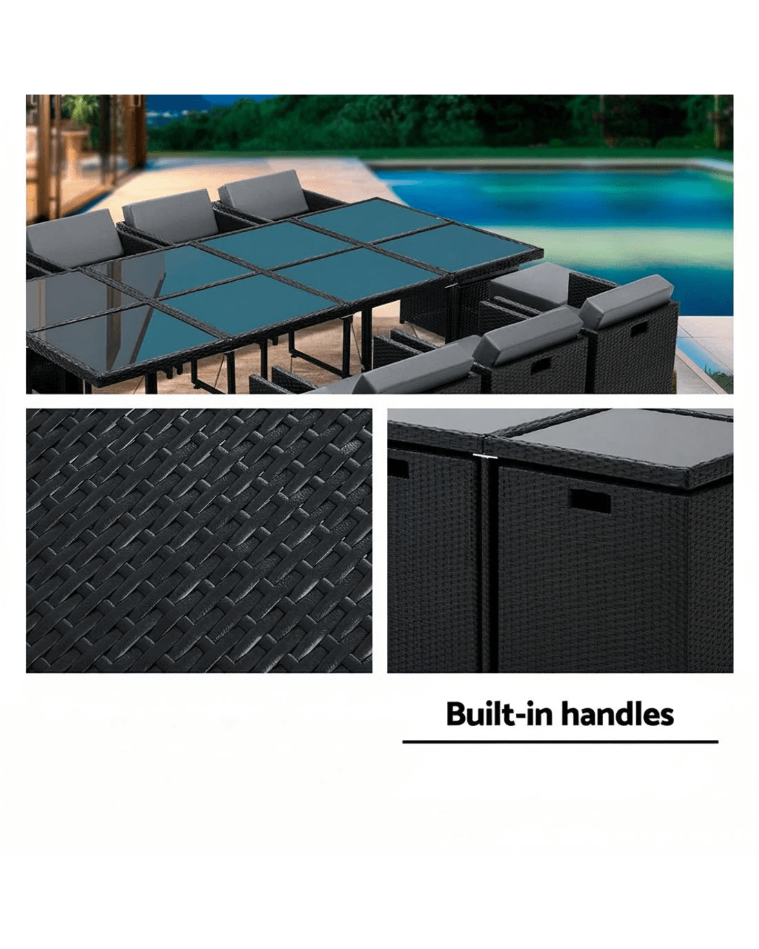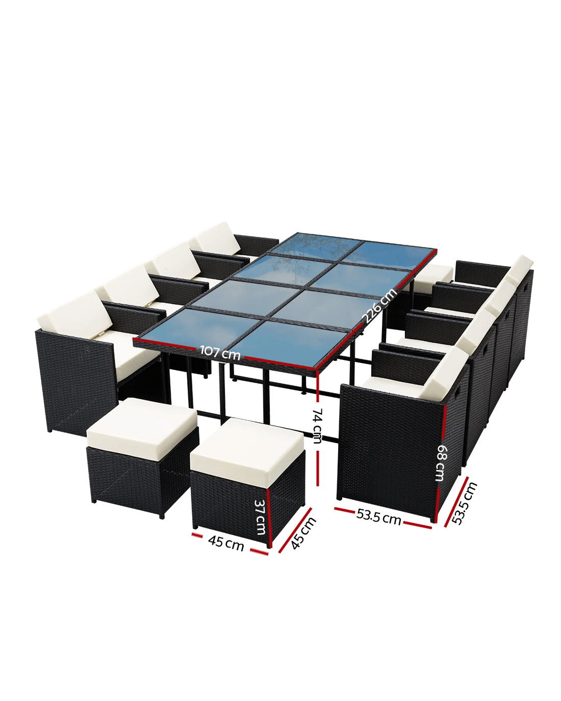 Flexibility. You can move the chairs around to create a whole new space. That's like giving a new look to your backyard whenever or wherever you want. Not least, the set is completed with a matching dining table with a tempered glass top. And as a bonus, you'll also receive all three red, grey and beige coloured seat covers at no extra cost. Three different coloured sofa sets for the price of one. Plus a water-resistant storage cover. Making sure it's covered under any weather situation.And relax and chill on our Hayman 13-piece Dining Set for the rest of the day.