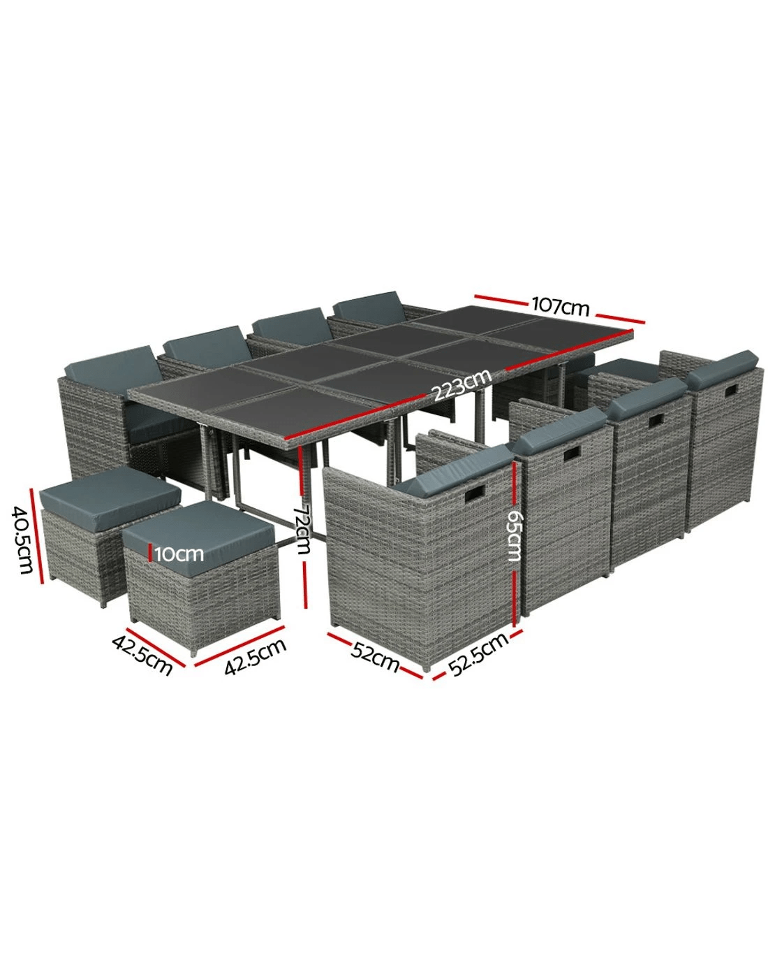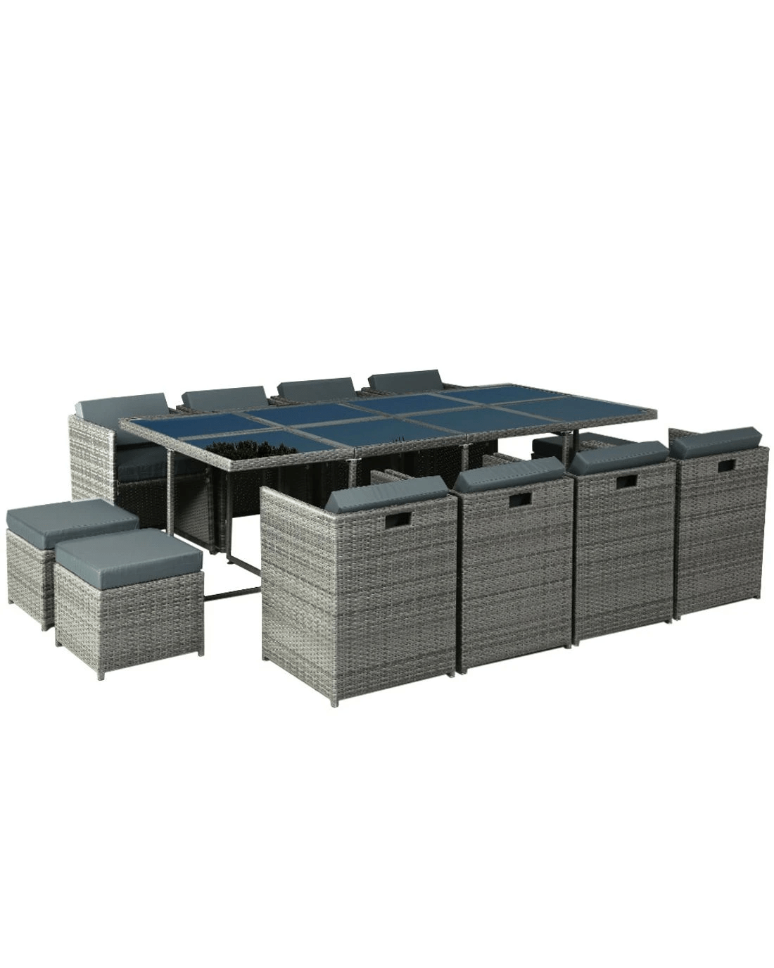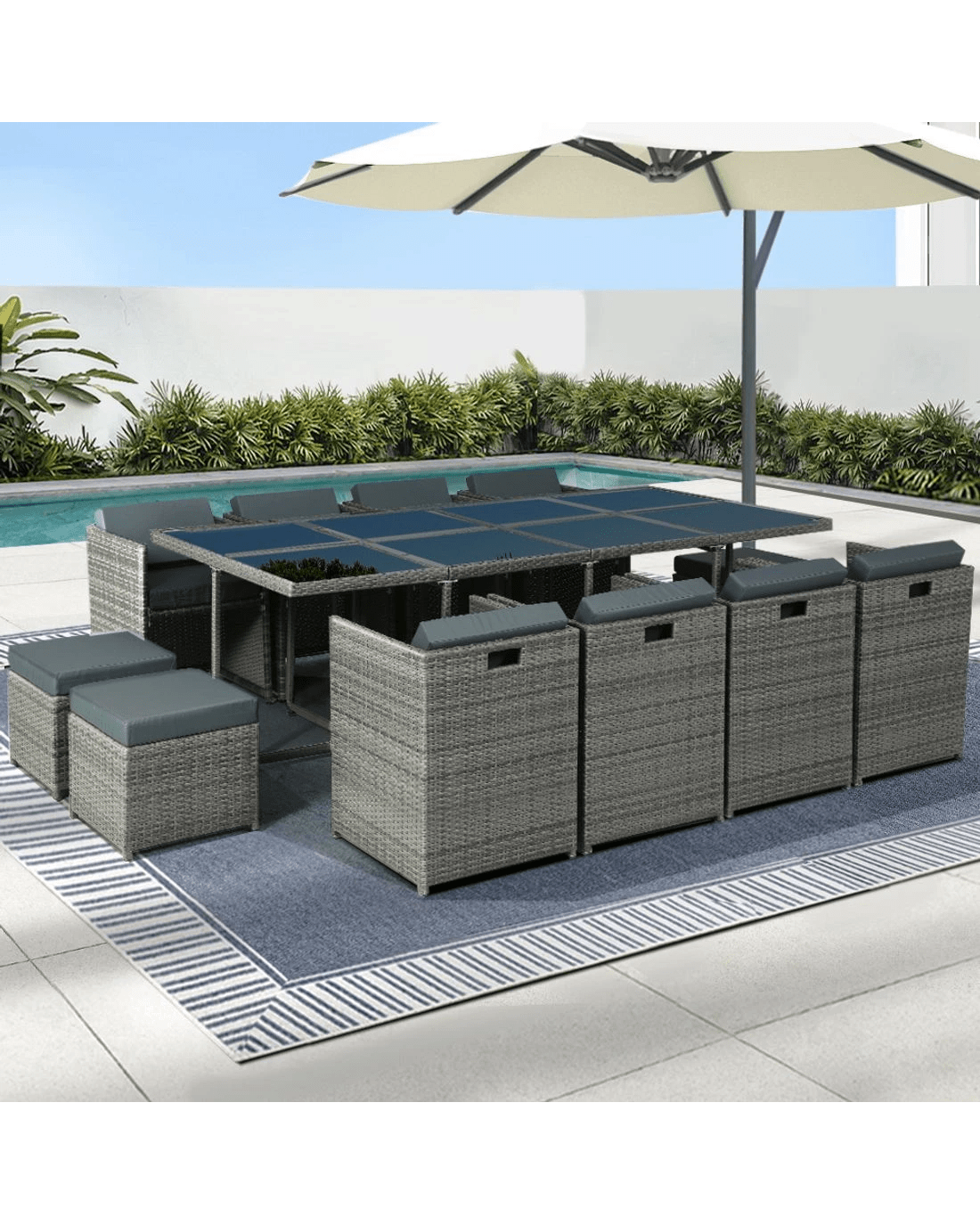 Looking to create a chic and gorgeous outdoor dining setting? The Gardeon 12-seater wicker outdoor dining set is a must purchase. It will liven up your outdoor space and help you achieve an elegant space where you can enjoy day and night and summer and winter. This 13-piece set comprises of eight chairs, four ottomans, and a large table. It boasts an integrated design that helps save space. The ottomans can be pushed under the chairs when not needed. All the seat and back cushions come with thick, high-density soft padding that ensures your comfort always. Additionally, the removable cushion covers are water-resistant to suit different seasons. Furthermore, our outdoor set features a lovely wicker weave for a touch of tropical charm, and the UV-resistant PE wicker with weather-resistant aluminium frame is suitable for all-season use. The large table with thick tempered glass top, durable frame, and stable cross construction ensures strength, durability, and stability. This set also comes with a bonus water-resistant storage cover that offer protection from all seasons. Our wicker outdoor dining set will withstand the test of time. You can create a praise-worthy spot with just a little creativity that will wow your guests. Shop it for your home today.