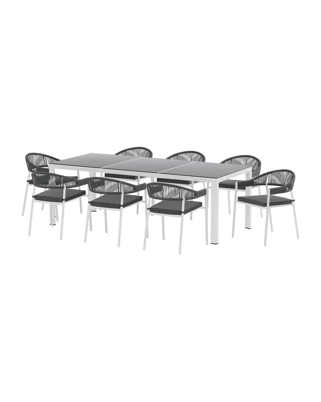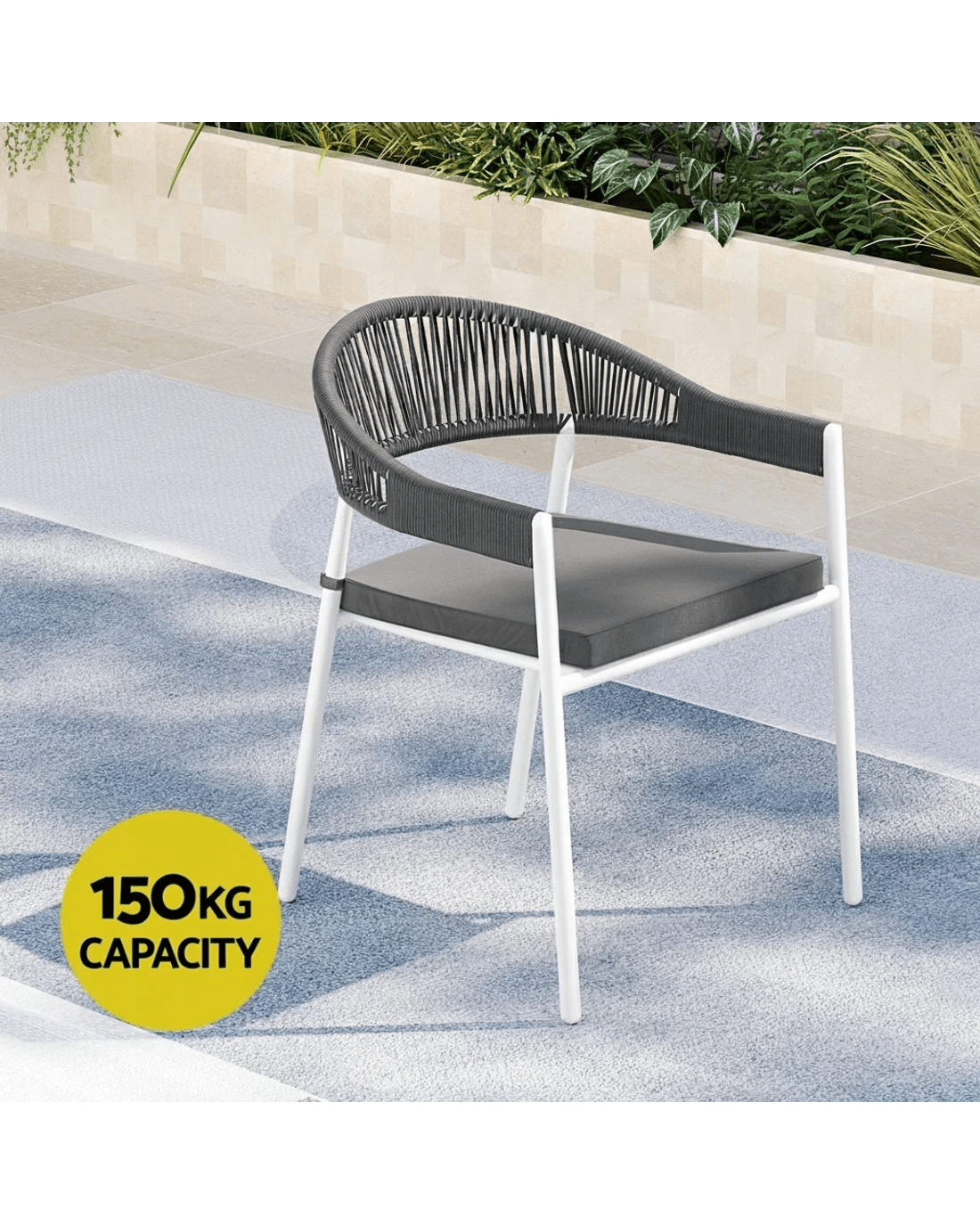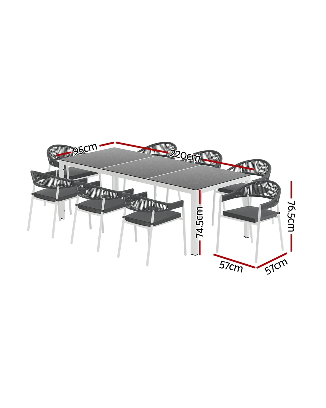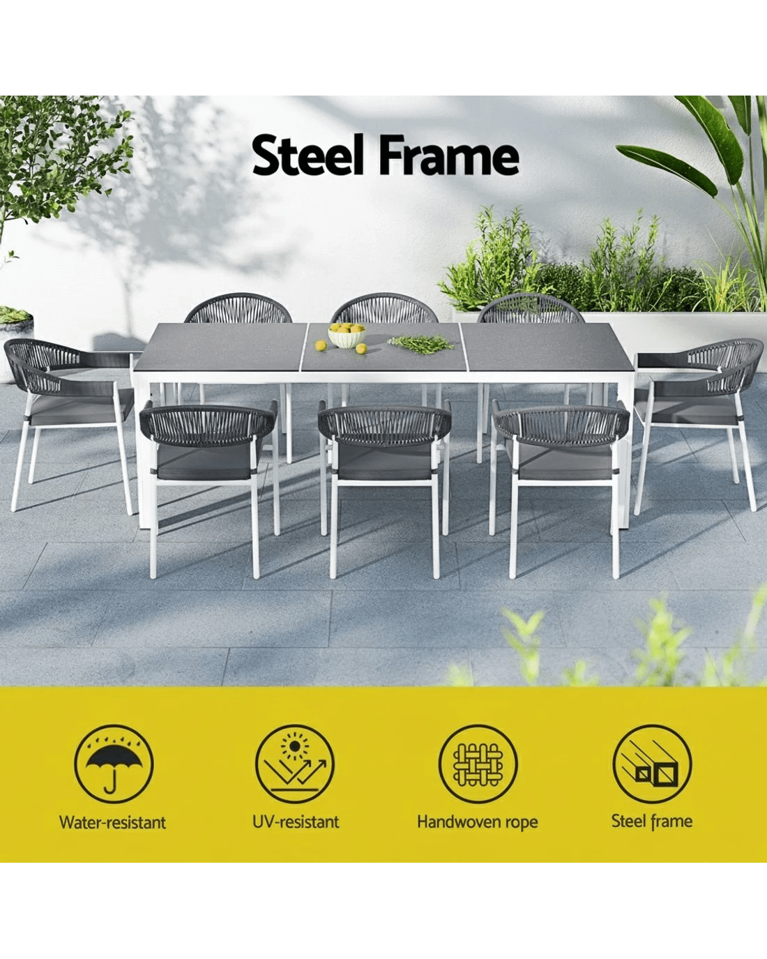 Experience the best the outdoors has to offer with this Gardeon 9-piece Outdoor Setting. Featuring eight single chairs and a matching dining table, this set is perfect for sitting outside and watching the world go by in comfort and style. The set is made using powder-coated steel and meticulously hand-woven rope for rust and water resistance, while the removable outdoor cushions feature water-resistant fabric and thick 5cm high-density foam for comfort. The chairs have a slanted backrest and handrails to keep guests comfortable for hours on end. It is easy to assemble and features non-slip feet to keep everything in its place. The dining table features a stylish tempered glass tabletop that is gorgeous to look at, easy to maintain and generous enough to hold all of your favourite drinks, reading materials or outdoor games. Maintenance is as easy as wiping down the furniture with a damp cloth. So what are you waiting for? Make the most out of the beautiful weather with a Gardeon 9-piece Outdoor Dining Setting.