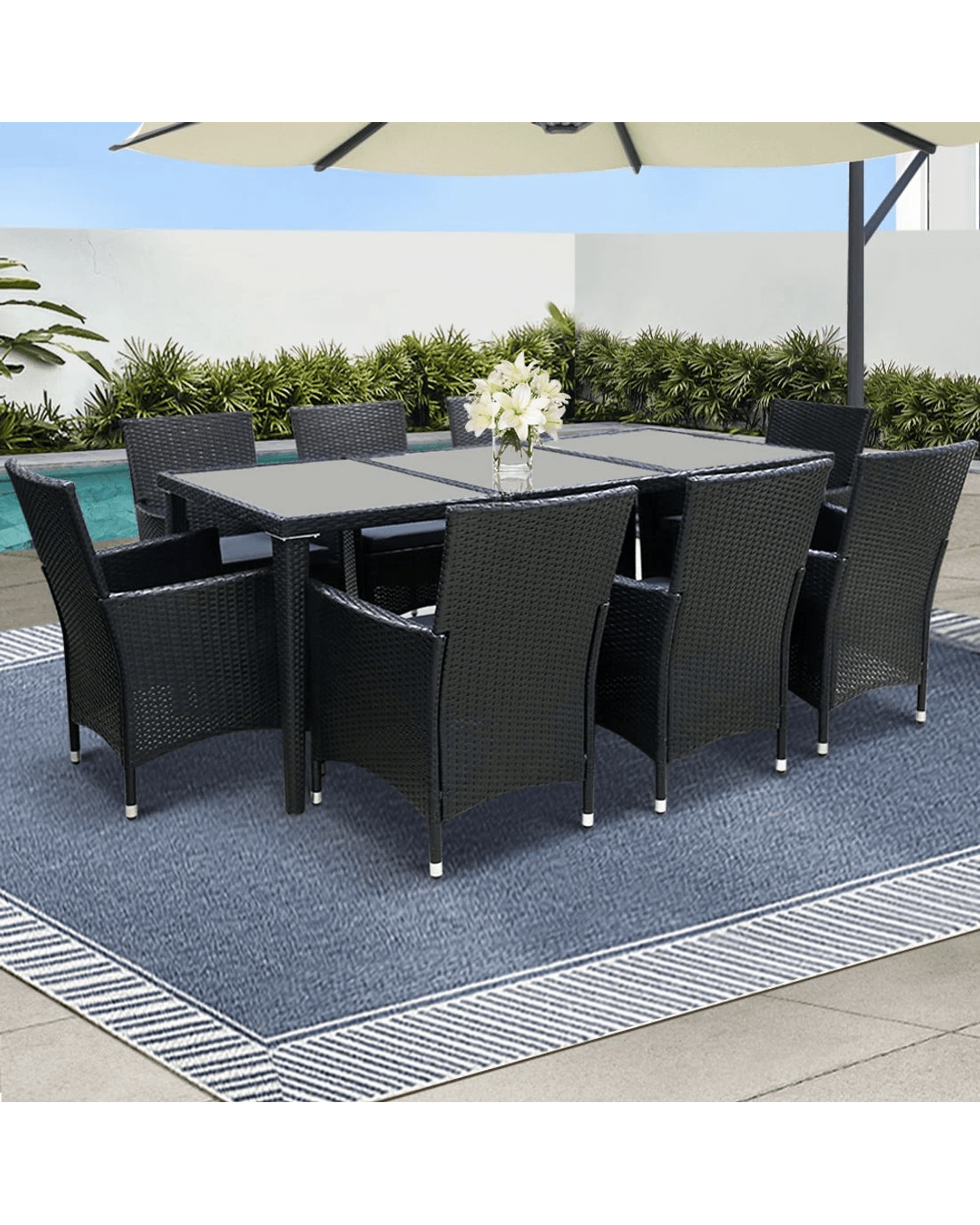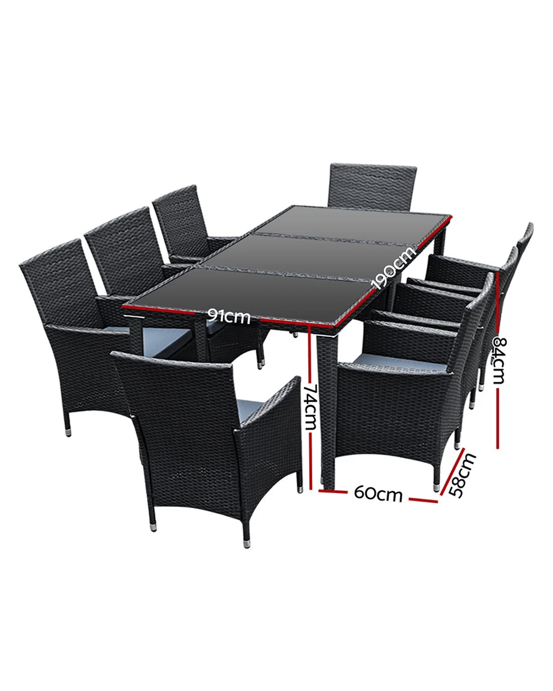 Dine in exquisite style with our elegant Gardeon Outdoor Dining Set. Finished in UV-resistant PE rattan with a strong and sturdy aluminium frame construction for both chairs and table, this multi-piece dining set is designed to please as well as stand up to the weather elements. The chairs have a sleek and contoured profile with 5cm thick high density foam cushions to ensure comfort and style are always in place. And the spacious dining table features a 5mm thick tempered glass top for safe and hardy use. Not least, a water-resistant cover for the entire ensemble is also included to keep it clean always.