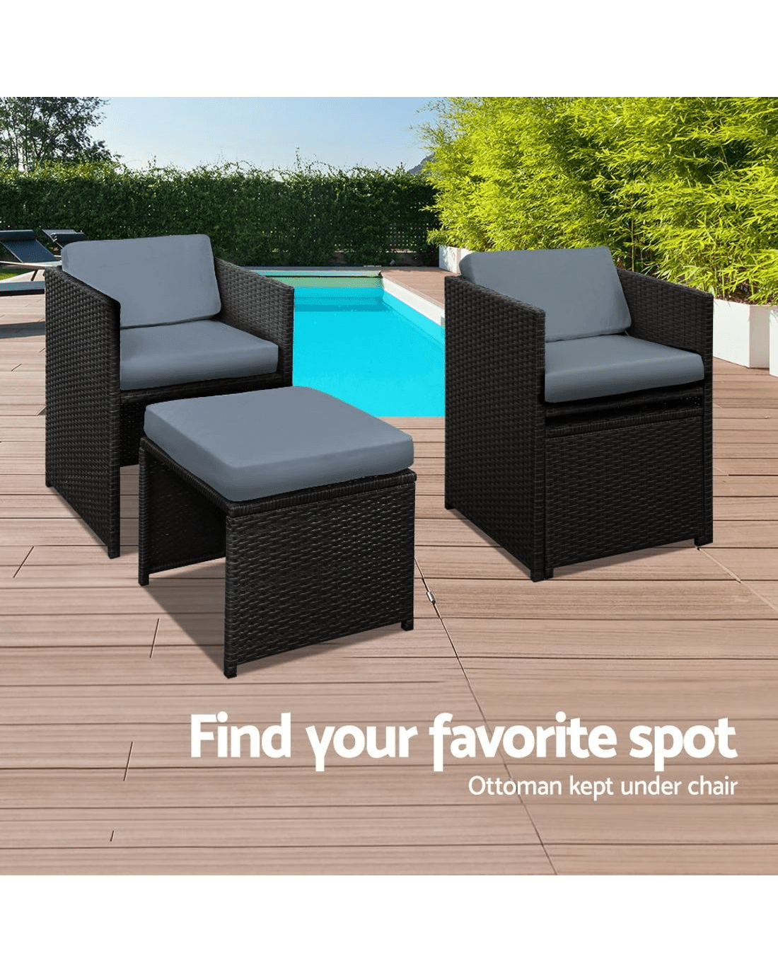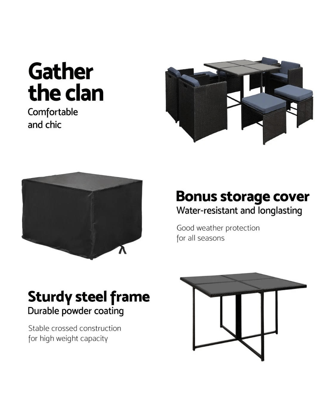 Time to give your backyard a complete make-over with our stylish yet affordable outdoor furniture set! It is made of powder coated steel frame and UV-resistant PE wicker, together with amazing designs, you won't be disappointed with the quality. The set comes with a tempered glass top table along with seat cushions padded in 5cm high density foam that are removable and washable. With the water-resistant cover, you do not need to worry about storing them during rainy days anymore. Plus, it is easy to set up with the individual seatings around your backyard for a party!