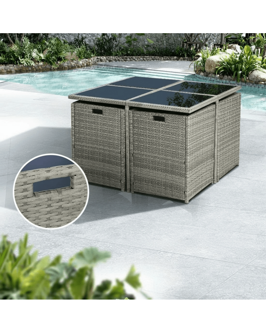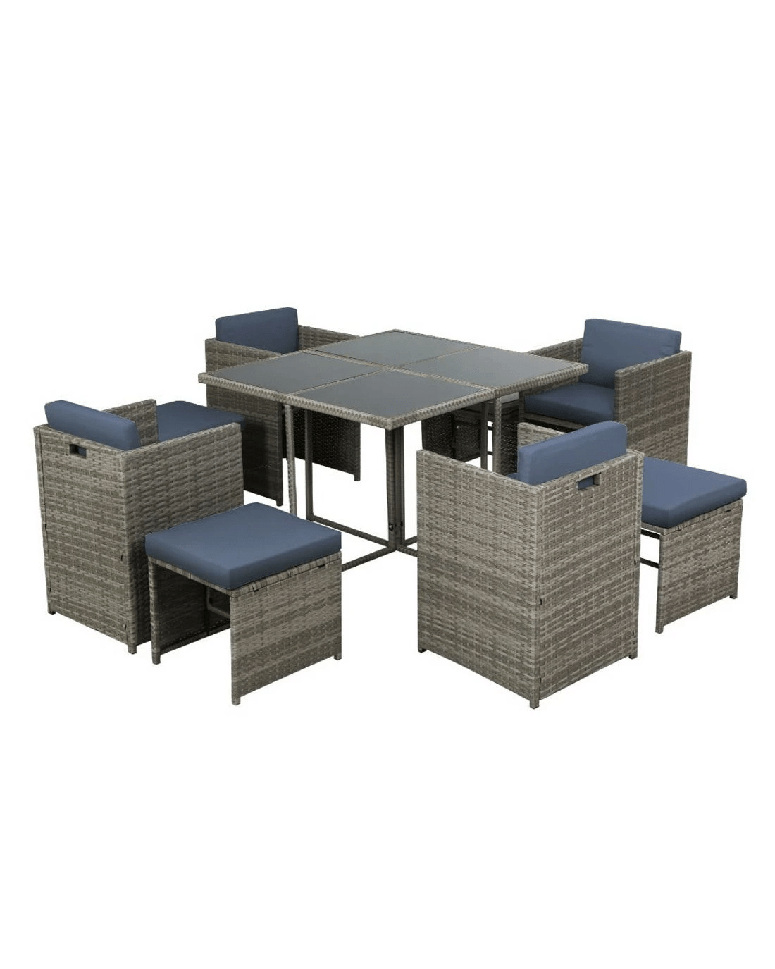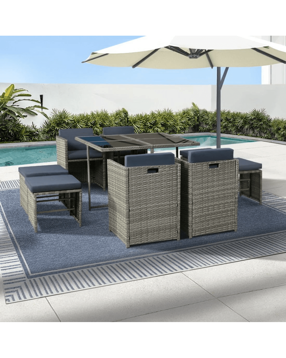 Looking to create a chic and gorgeous outdoor dining setting? The Gardeon 8-seater wicker outdoor dining set is a must purchase. It will liven up your outdoor space and help you achieve an elegant space where you can enjoy day and night and summer and winter. This 9-piece set comprises of four chairs, four ottomans, and a large table. It boasts an integrated design that helps save space. The ottomans can be pushed under the chairs when not needed. All the seat and back cushions come with thick, high-density soft padding that ensures your comfort always. Additionally, the removable cushion covers are water-resistant to suit different seasons. Furthermore, our outdoor set features a lovely wicker weave for a touch of tropical charm, and the UV-resistant PE wicker with weather-resistant steel frame is suitable for all-season use. The large table with thick tempered glass top, durable frame, and stable cross construction ensures strength, durability, and stability. This set also comes with a bonus water-resistant storage cover that offer protection from all seasons. Our wicker outdoor dining set will withstand the test of time. You can create a praise-worthy spot with just a little creativity that will wow your guests. Shop it for your home today.