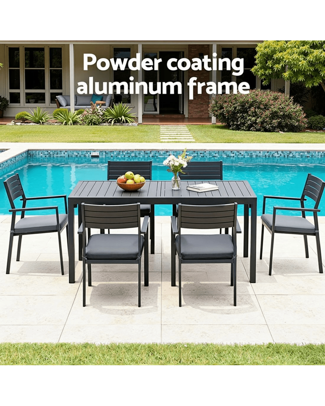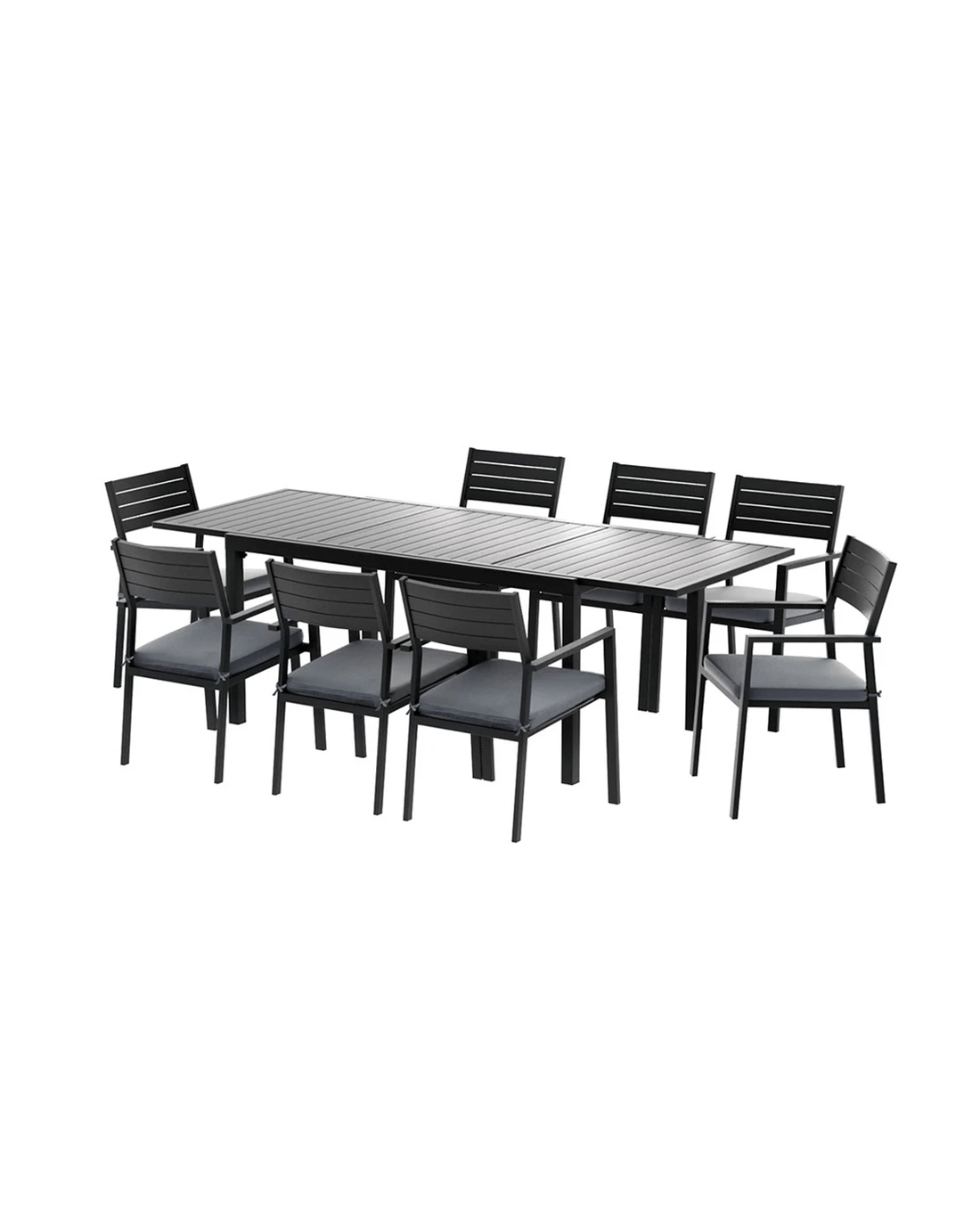 With summer fast approaching, you can once again join the sunshine with the Gardeon 9-piece Outdoor Dining Set. Made from a powder-coated aluminium frame, the set is designed for outdoor or indoor use in a wide range of weather conditions. The table and chairs are designed to comfortably seat 8 people across eight single chairs, or the table can be extended to fit up to twelve (extra chairs not included). The stable structure features fixed safety screws, giving each chair a 150kg weight capacity and a table weight capacity of 50kg. The seats are classically designed and completely comfortable with an inclined backrest, comfortable handrails, and 5cm thick foam cushions. The cushions feature removable and washable covers for easy cleaning. The table and chairs feature a slatted surface for easy drainage during wet weather. With easy and hassle-free assembly, the Gardeon 9-piece Outdoor Dining Set is the perfect addition to any backyard, patio or even sitting room.