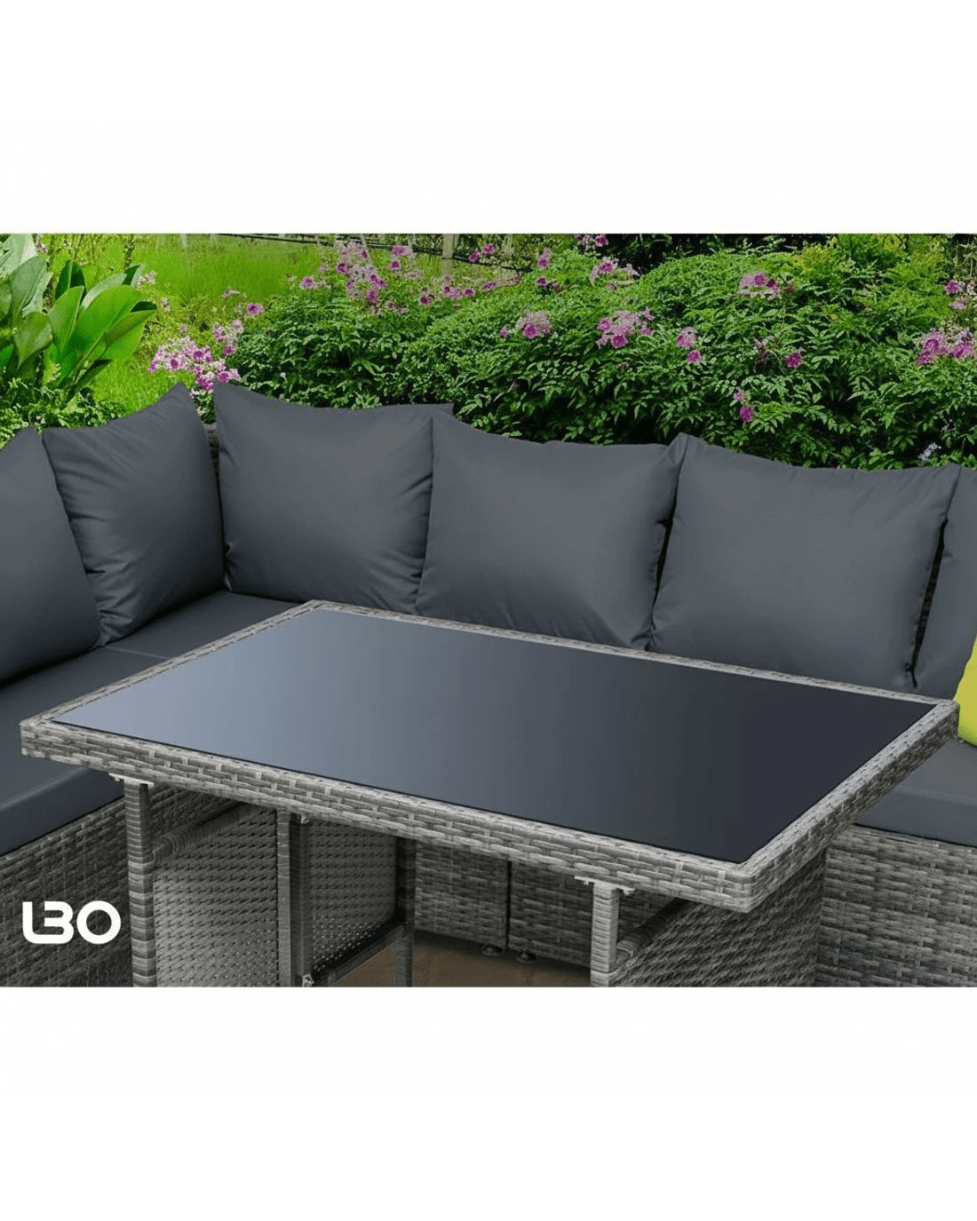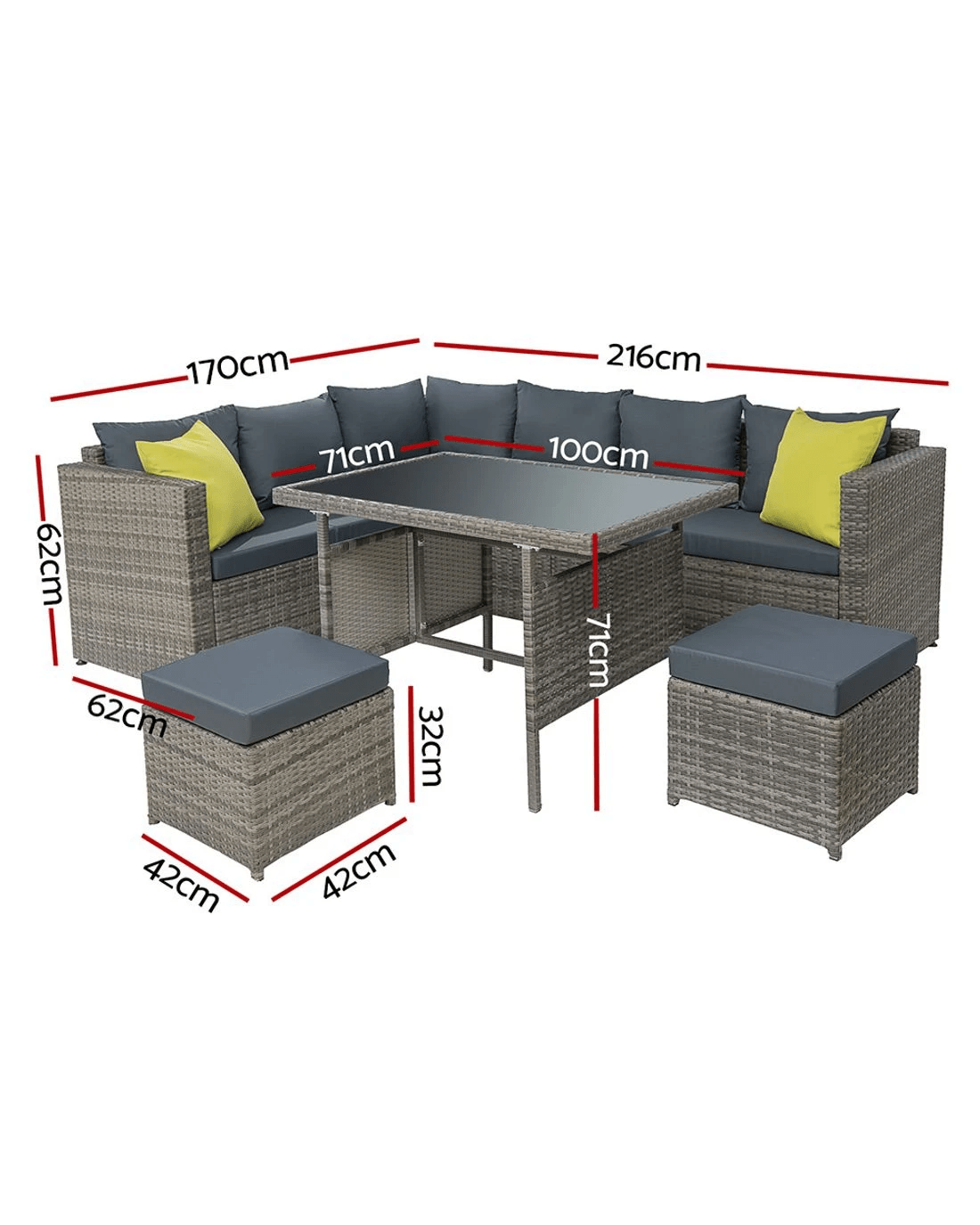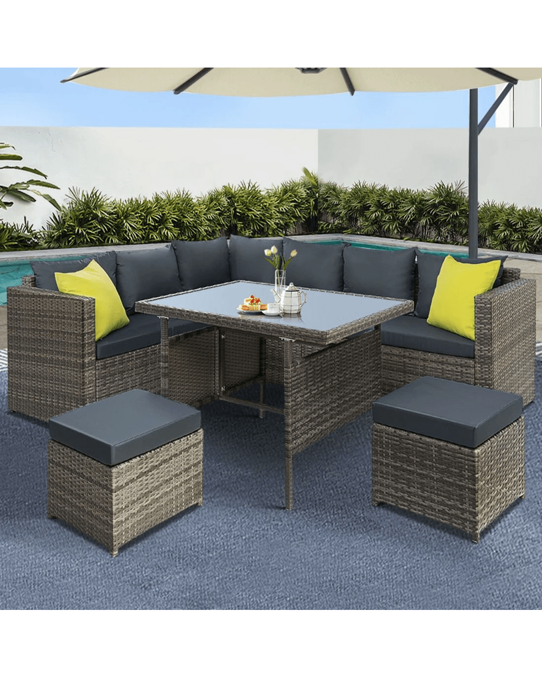 Invite your friends and family over for a garden party or just sit back and relax with our luxurious Gardeon Outdoor Sofa Dining Set. Being a multi-seater, the dining set provides enough room for all your guests to sit or for you to have a lie down and enjoy a book. You can arrange the seats (double seat, corner seat and ottoman) in various ways depending on your needs. The sofa is made of Aluminum frame with quality PE wicker finish that not only looks stylish but is perfect for outdoor use as it is both UV-resistant and weather-resistant. The seat cushions are 8cm thick to provide ultimate comfort and are water-resistant as well. The set also includes a matching table that has a 5mm thick tempered glass top with buffers for added protection.