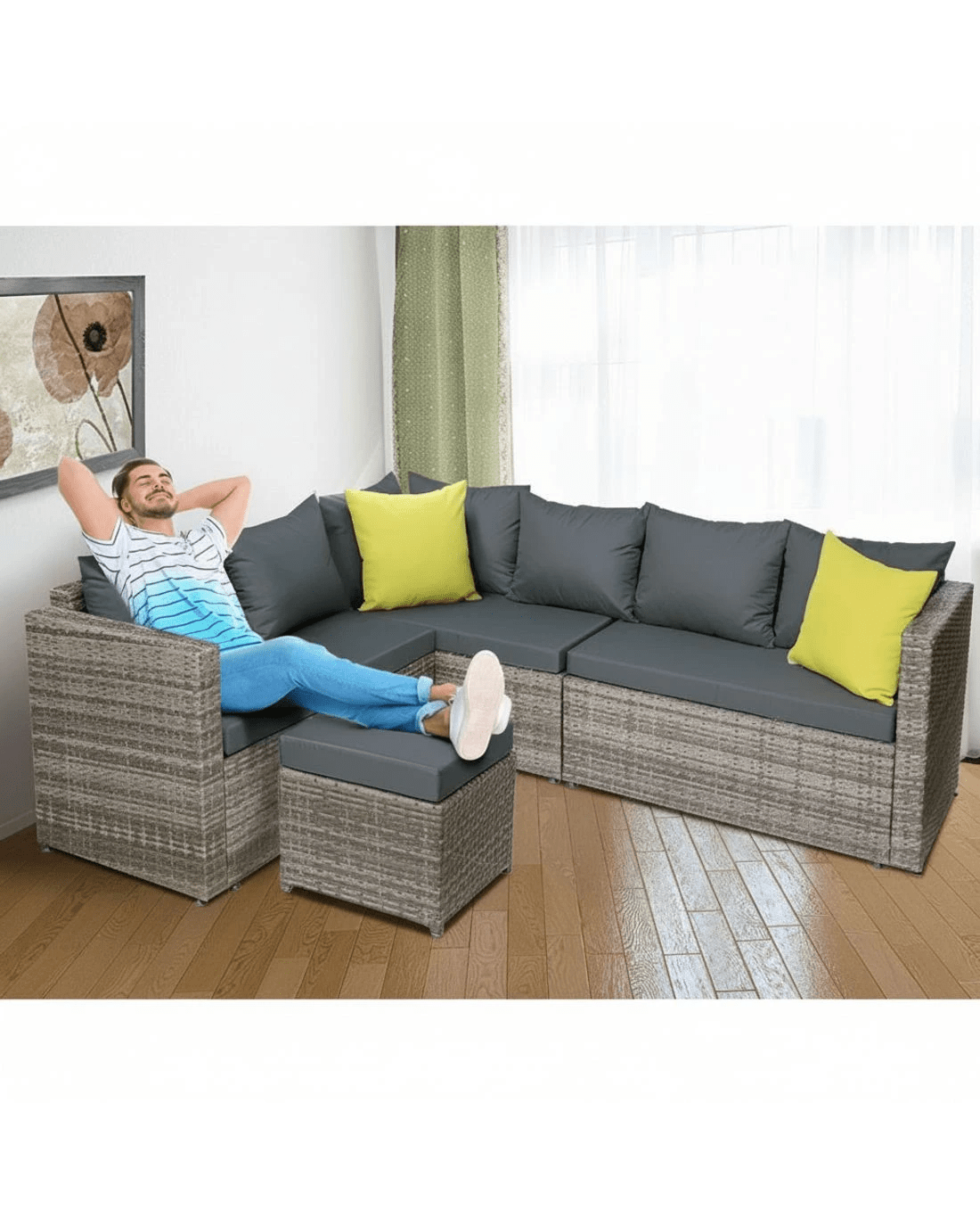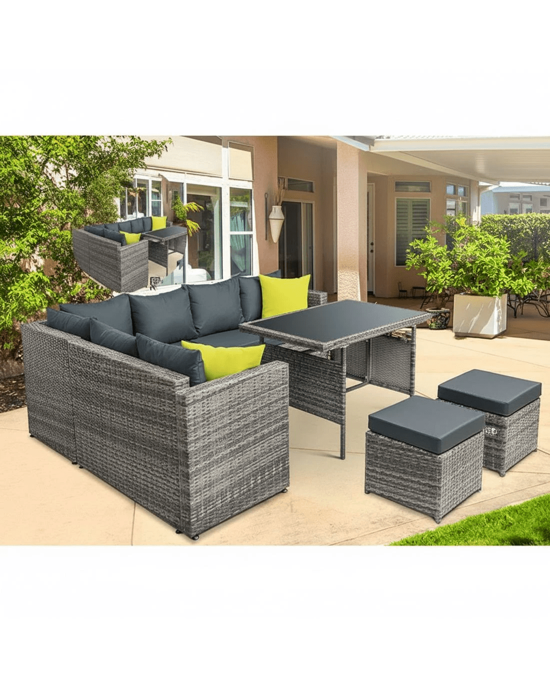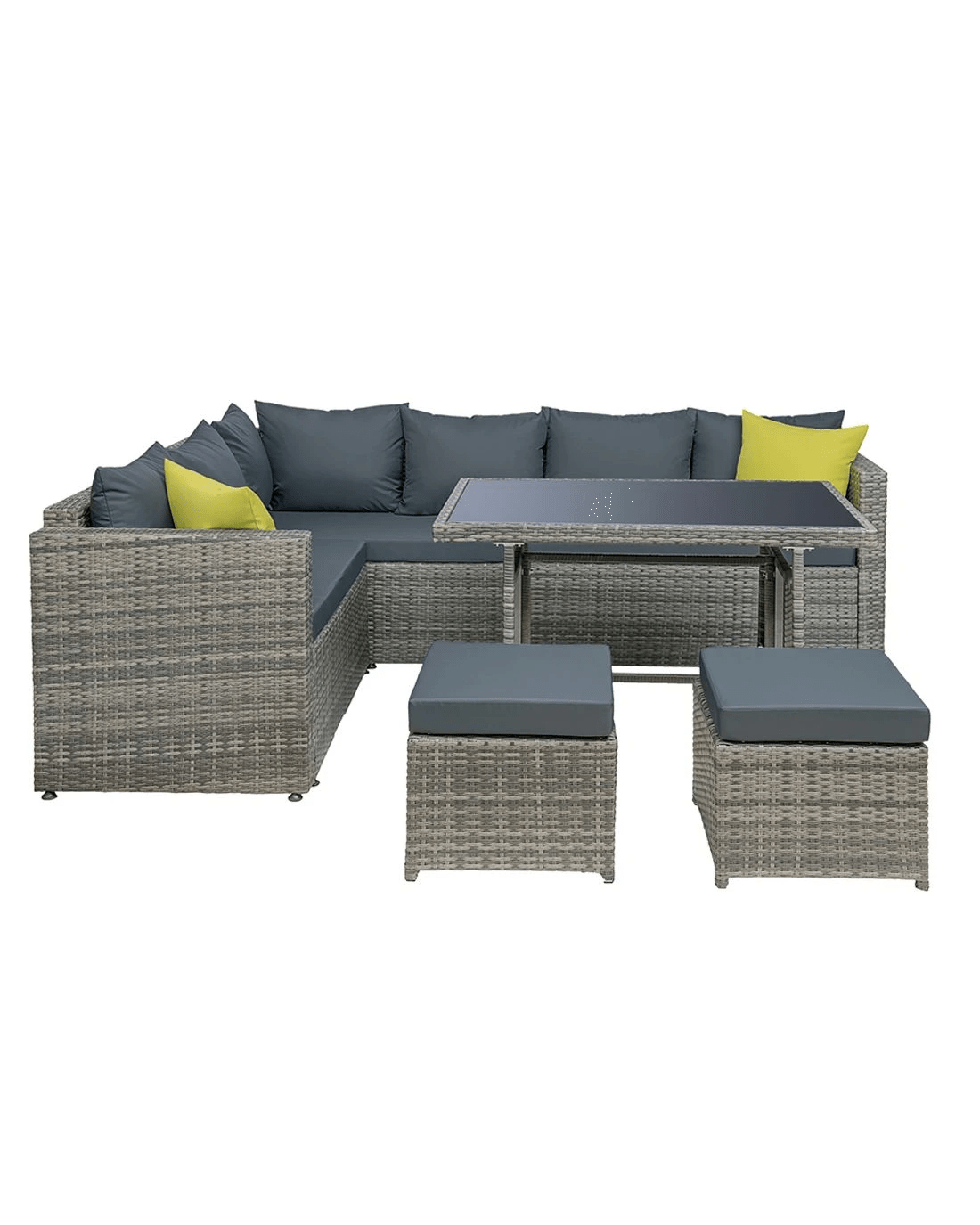 Invite your friends and family over for a garden party or just sit back and relax with our luxurious Gardeon Outdoor Sofa Dining Set. Being a multi-seater, the dining set provides enough room for all your guests to sit or for you to have a lie down and enjoy a book. You can arrange the seats (double seat, corner seat and ottoman) in various ways depending on your needs. The sofa is made of Aluminum frame with quality PE wicker finish that not only looks stylish but is perfect for outdoor use as it is both UV-resistant and weather-resistant. The seat cushions are 8cm thick to provide ultimate comfort and are water-resistant as well. The set also includes a matching table that has a 5mm thick tempered glass top with buffers for added protection.