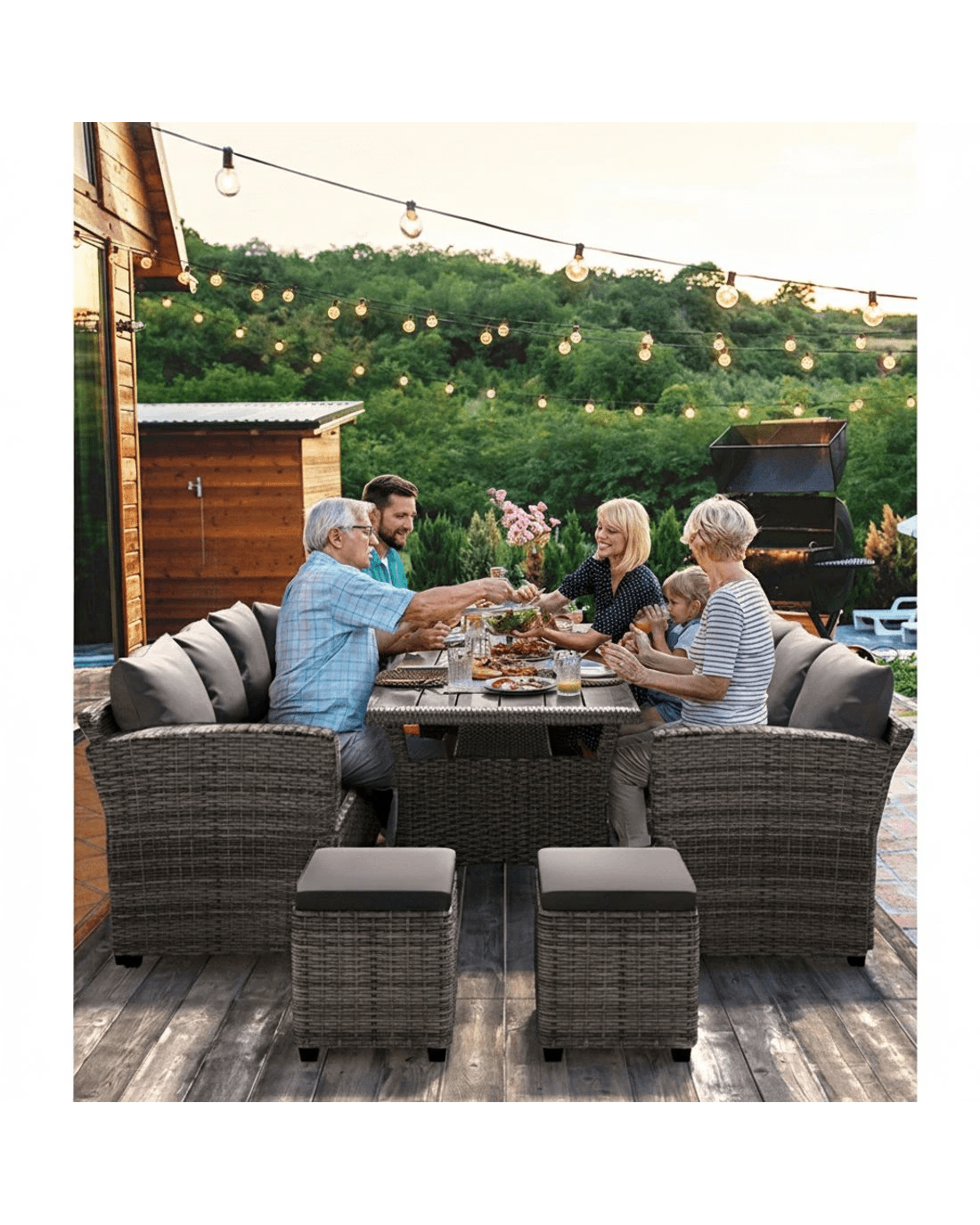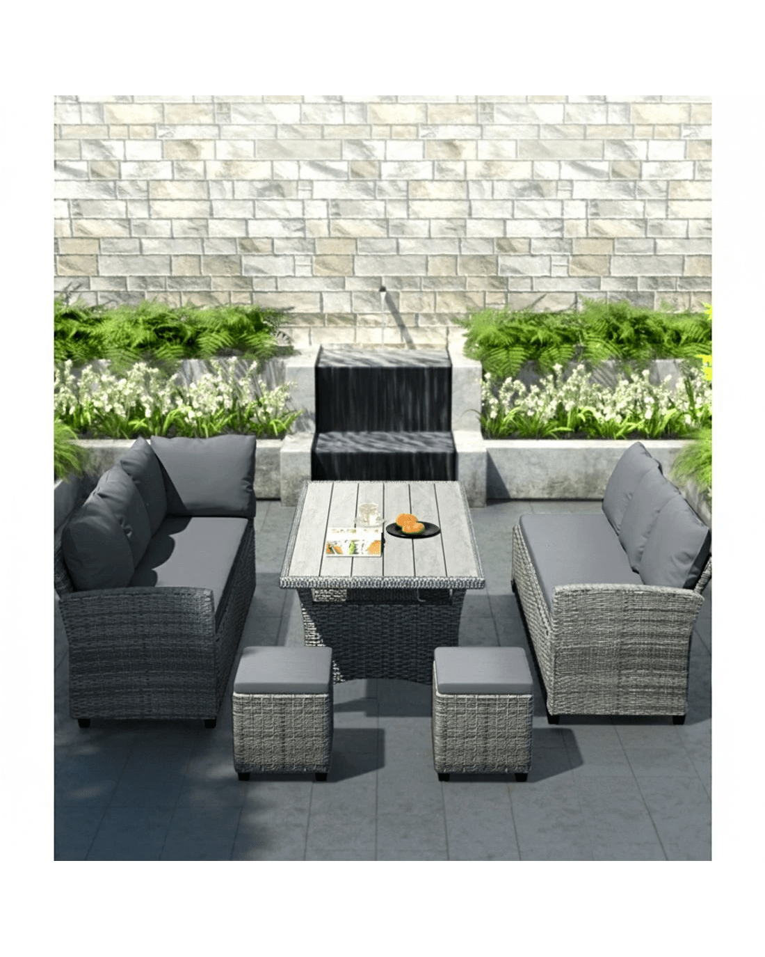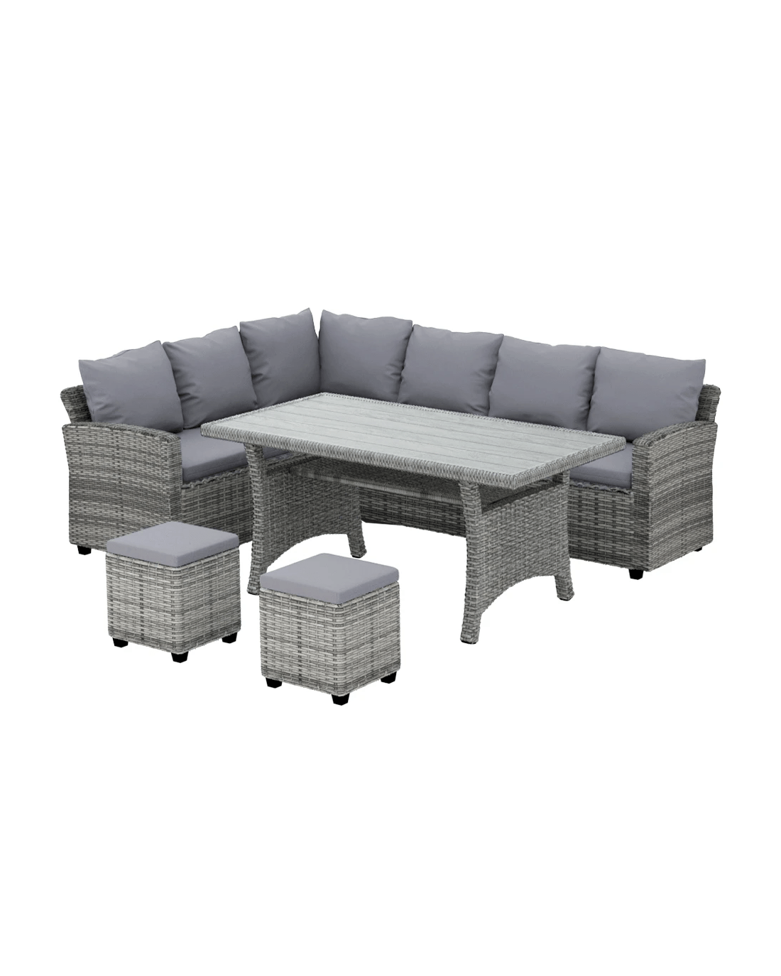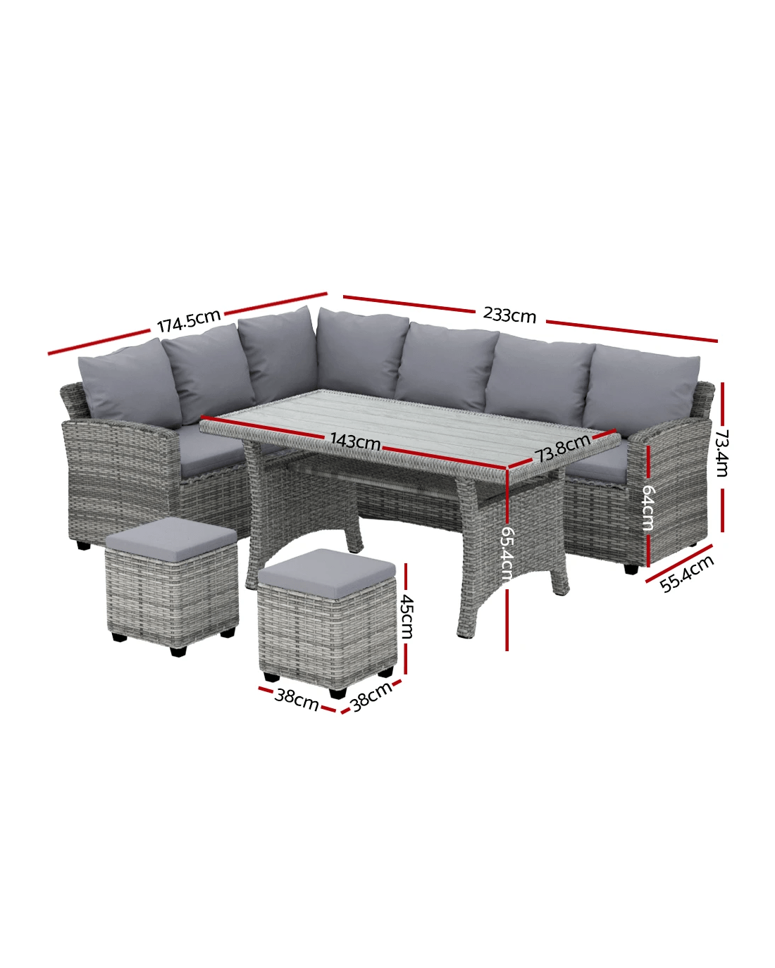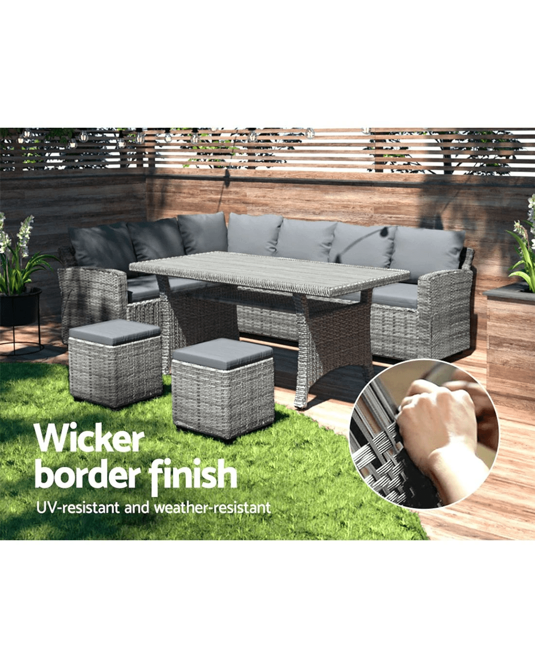 Looking to create a chic and gorgeous outdoor dining setting? The Gardeon 8-seater wicker outdoor dining set is a must purchase. It will liven up your outdoor space and help you achieve an elegant space where you can enjoy day and night and summer and winter. The set comprises of two three-seater sofas, a large table and two ottomans. Its beautiful and versatile design makes it perfect for indoor and outdoor use. This outdoor set features a lovely wicker weave for a touch of tropical charm, and the UV-resistant PE wicker with weather-resistant steel frame is suitable for all-season use. Its customisable design allows you to style this outdoor dining set in multiple ways. The large wood plastic table boasting solid structure ensures strength and durability. It comes with under-table storage shelf that allows you to keep magazines, cutlery, and other knick-knacks. Our outdoor wicker thick-padded sofas also come with removable cushions that allows you to go cushion-less to suit different seasons, and the polyester covers are easy to keep clean. The pillows are also comfortable and soft for a comfortable sitting. This wicker outdoor dining set will withstand the test of time. You can create a praise-worthy spot with just a little creativity that will wow your guests. Shop it for your home today.