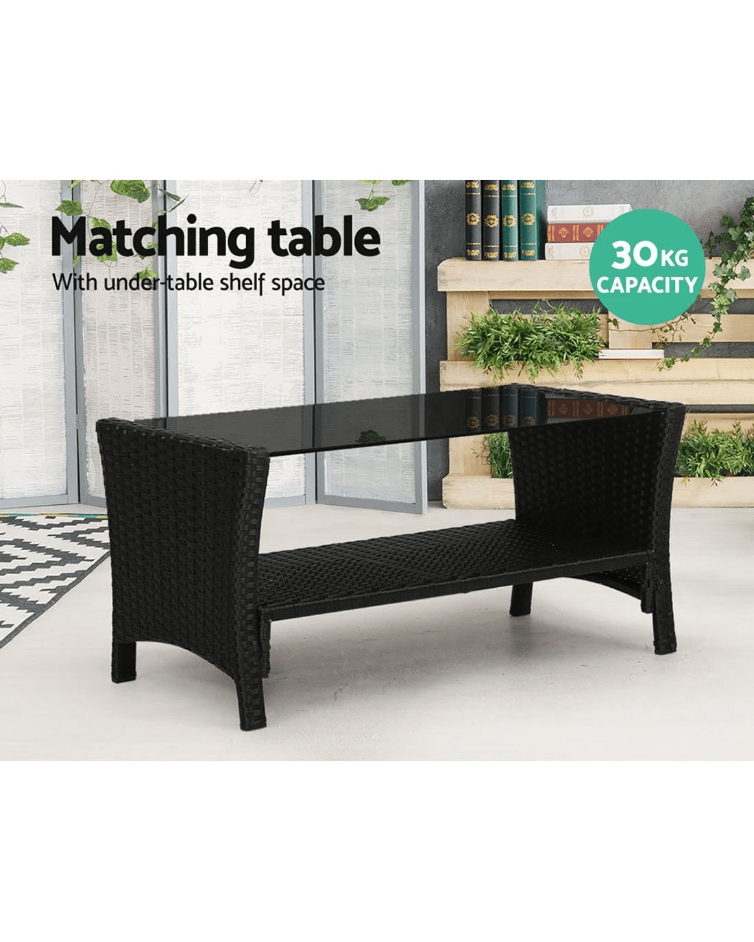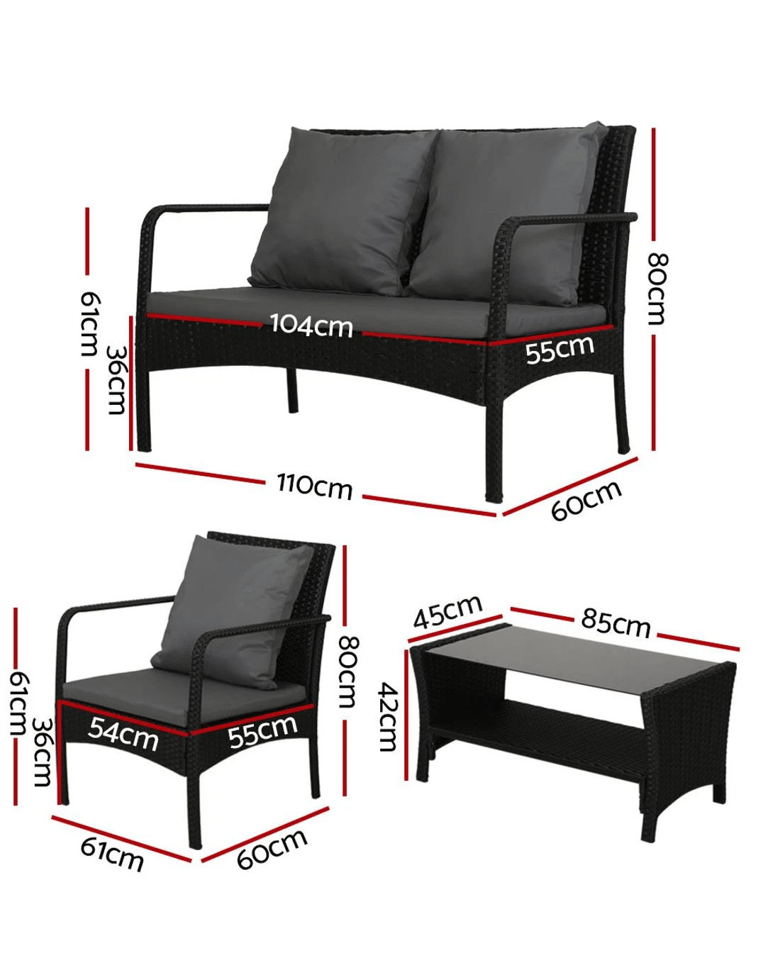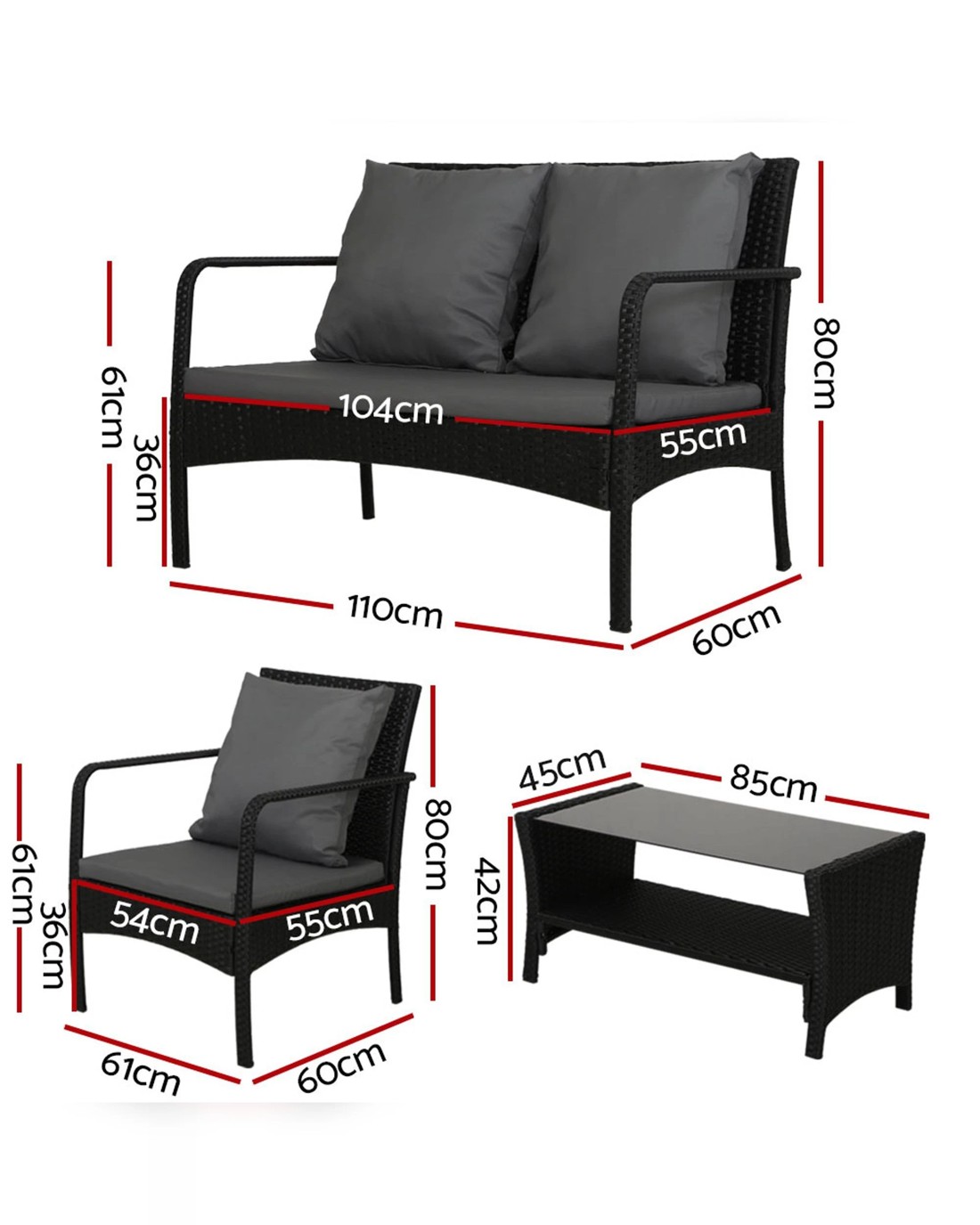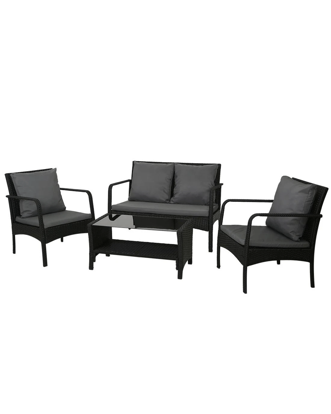 Meticulously crafted, our Gardeon 4-piece Rattan Outdoor Set comprises two armchairs, a two-seater and a matching table for a beautiful integrated look. Its presence will definitely add panache and style to your deck, patio or even living room. Made of handwoven UV-resistant PE wicker and a sturdy galvanised steel frame, this set not only looks stylish but is designed to last through all weather and the test of time. The 5mm thick tempered glass top with non-slip suction pads for the table also ensures strong and safe use with total peace of mind. Not least, the cushions and pillows on the seats are thick and well-padded to provide ultimate comfort and are suitable for all-weather use as well. And the covers are even removable and washable to maintain their pristine appearance. With so much going for it, the outdoor set certainly deserves its coveted space in your lovely backyard. Or even indoors for a unique presence.