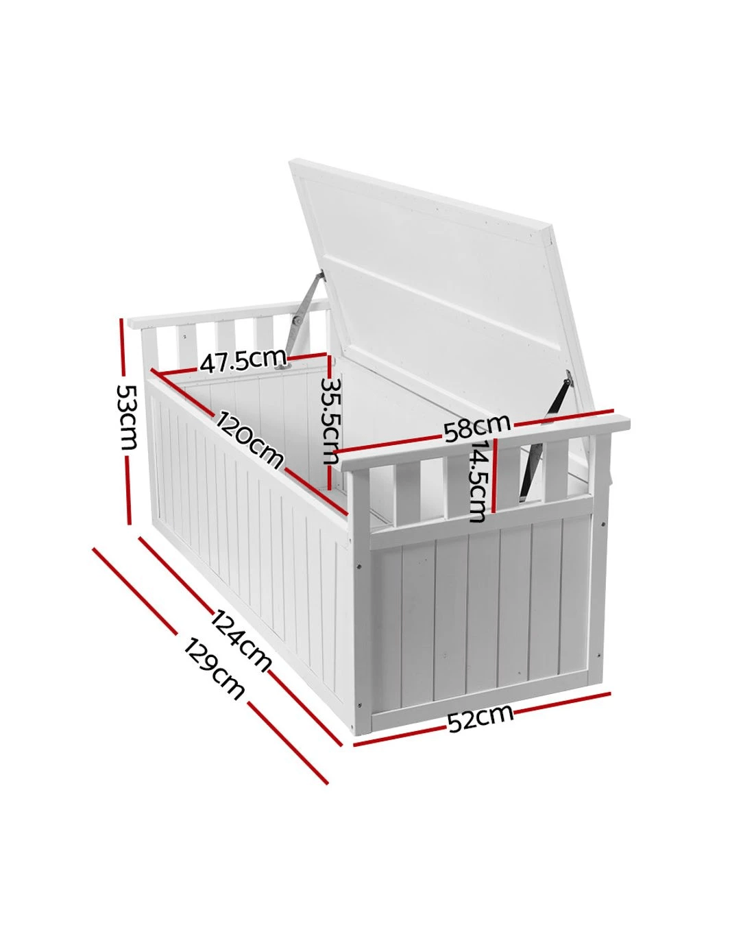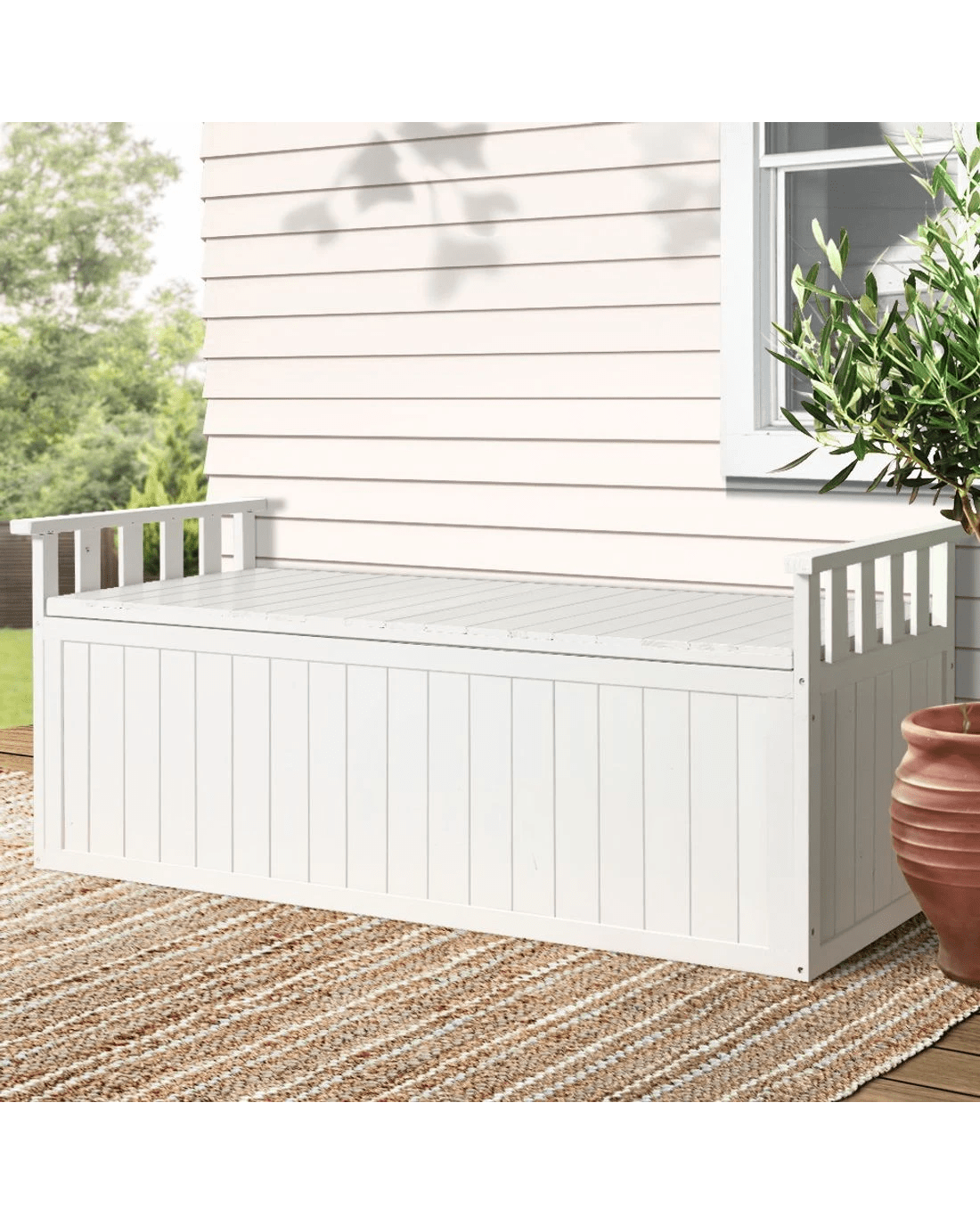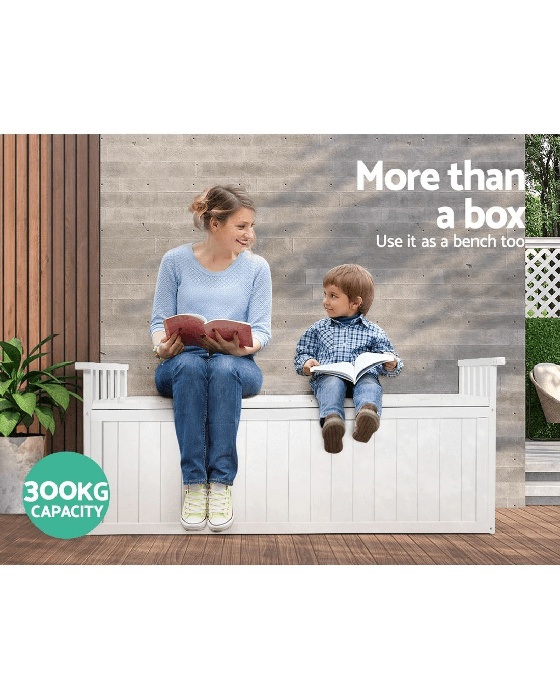 Want to create a beautiful outdoor space? Decorate and bring your outdoors to life with our gorgeously designed Gardeon 2-in-1 outdoor storage bench. Add flower beds and some good lighting to create a dreamy outdoor ambience. Our outdoor storage bench is designed to impress. Featuring beautiful, simple yet practical design with meticulous details, this garden bench is crafted from solid fir wood material and has solid structure for ultimate durability and longlasting use. Its lift-up seat with air gap handle makes it convenient to use. It has 200L storage capacity and can hold up to 300kg weight. Flaunting gorgeous wooden slatted design, our garden storage bench has open back that keeps you cool and sweat-free as you enjoy your great outdoors. It has strong 304-grade stainless steel fixings and flat base for superb stability and steadiness. Furthermore, it has side slatted wooden bars that allows you to lean back and sit comfortably. You can style this garden storage bench both indoors and outdoors. Its water-resistant design makes it suitable for all-weather use. It's available in white shade, which makes it possible to style anywhere and anyhow. Shop our Gorgeously built Gardeon outdoor storage bench today to refresh your outdoors.