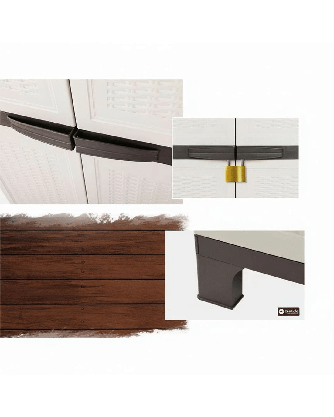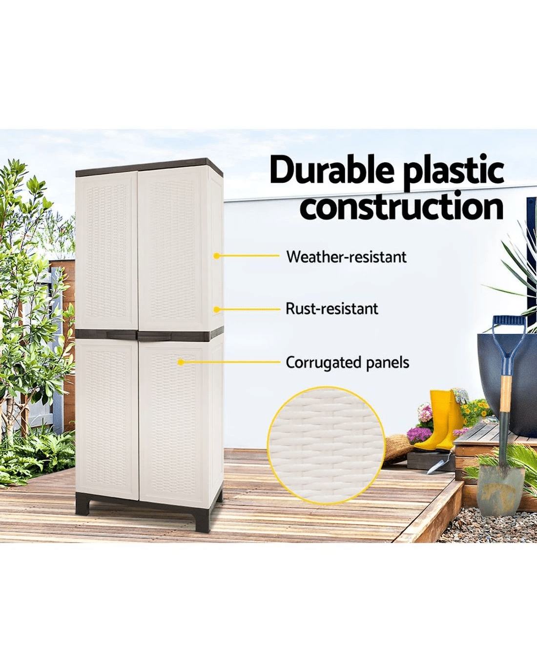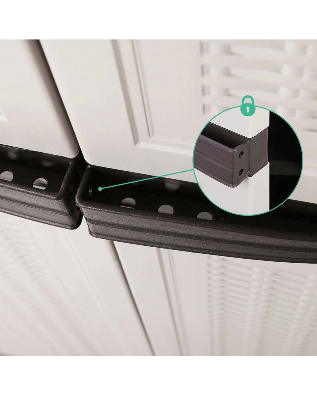 Outside, the weather-resistant Storage Cabinet features premium plastic construction with corrugated panels for both reinforced support and stylish looks. Security and safety is also enhanced with lockable doors that can be secured with a range of locks. Not least, the entire unit stands on large stilted feet to keep it away from floods, spills or wet floors.