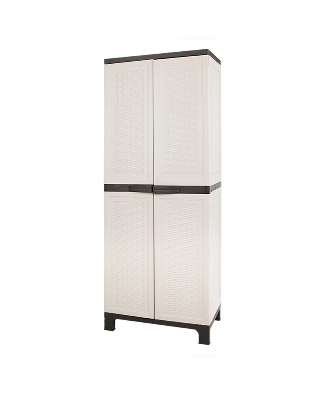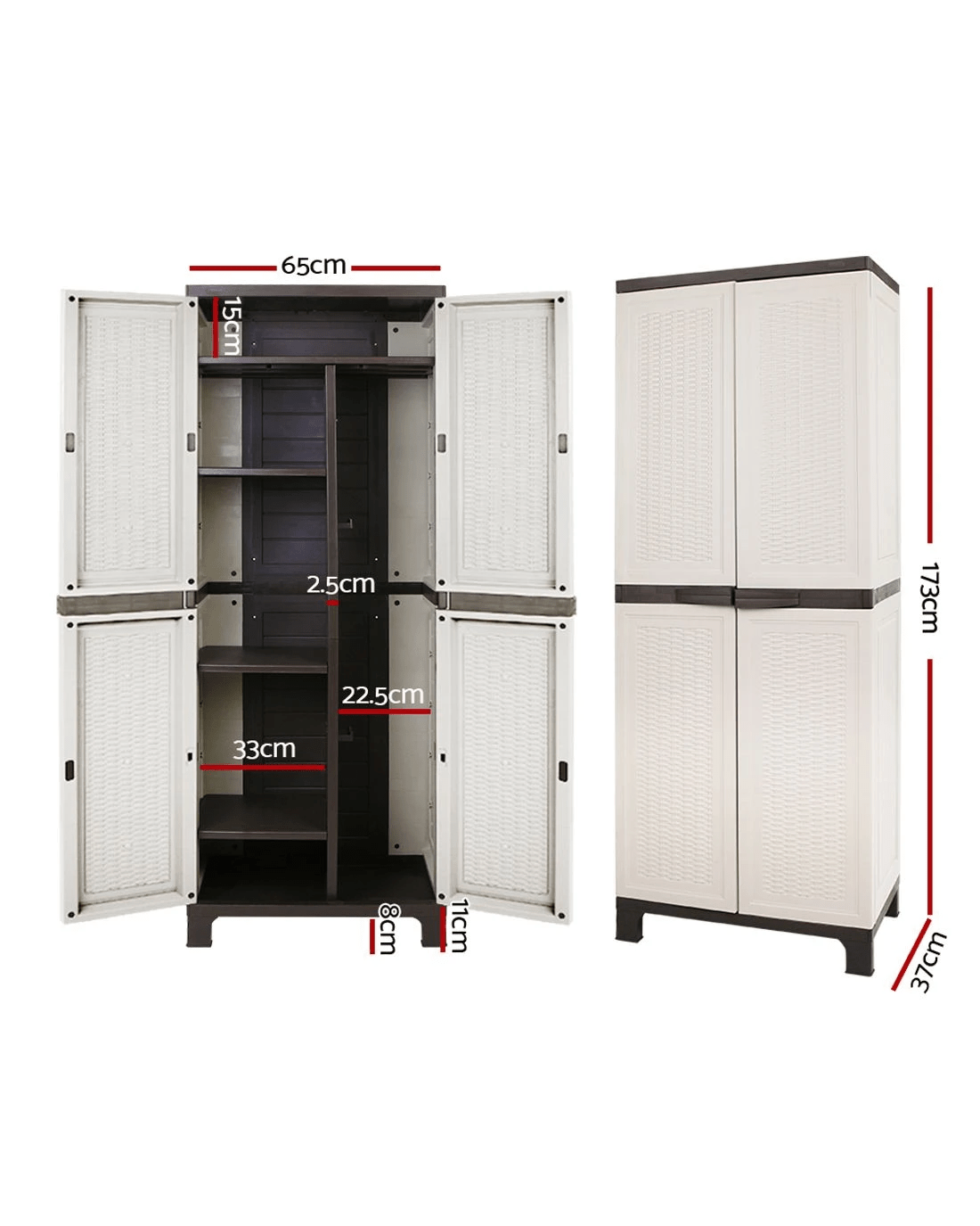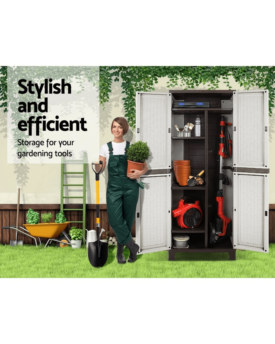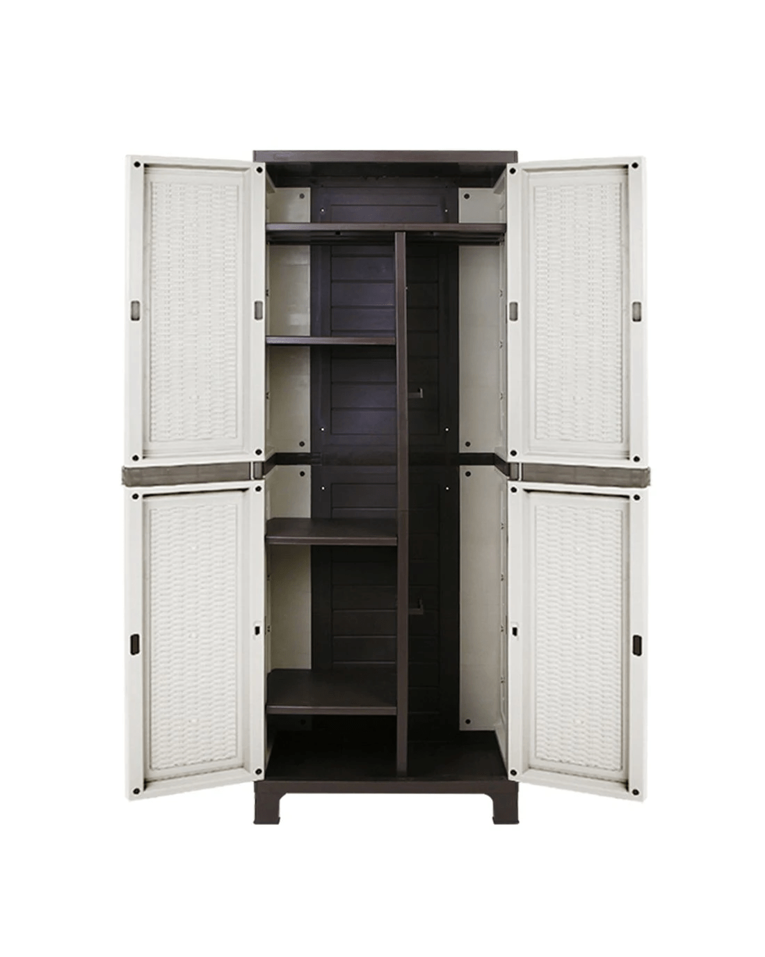 Outside, the weather-resistant Storage Cabinet features premium plastic construction with corrugated panels for both reinforced support and stylish looks. Security and safety is also enhanced with lockable doors that can be secured with a range of locks. Not least, the entire unit stands on large stilted feet to keep it away from floods, spills or wet floors.