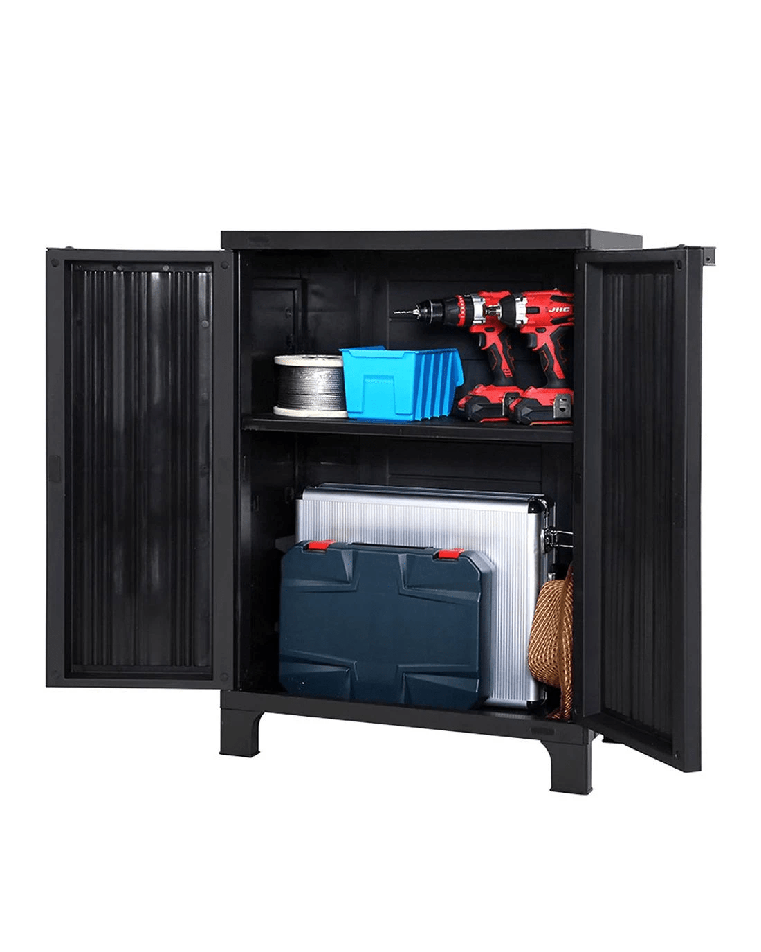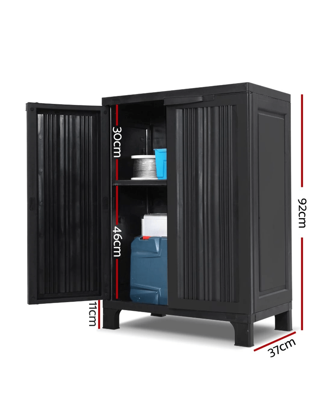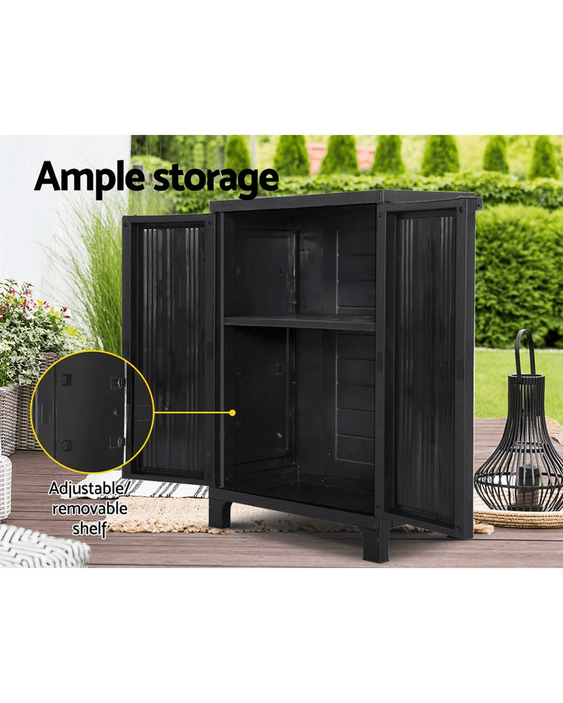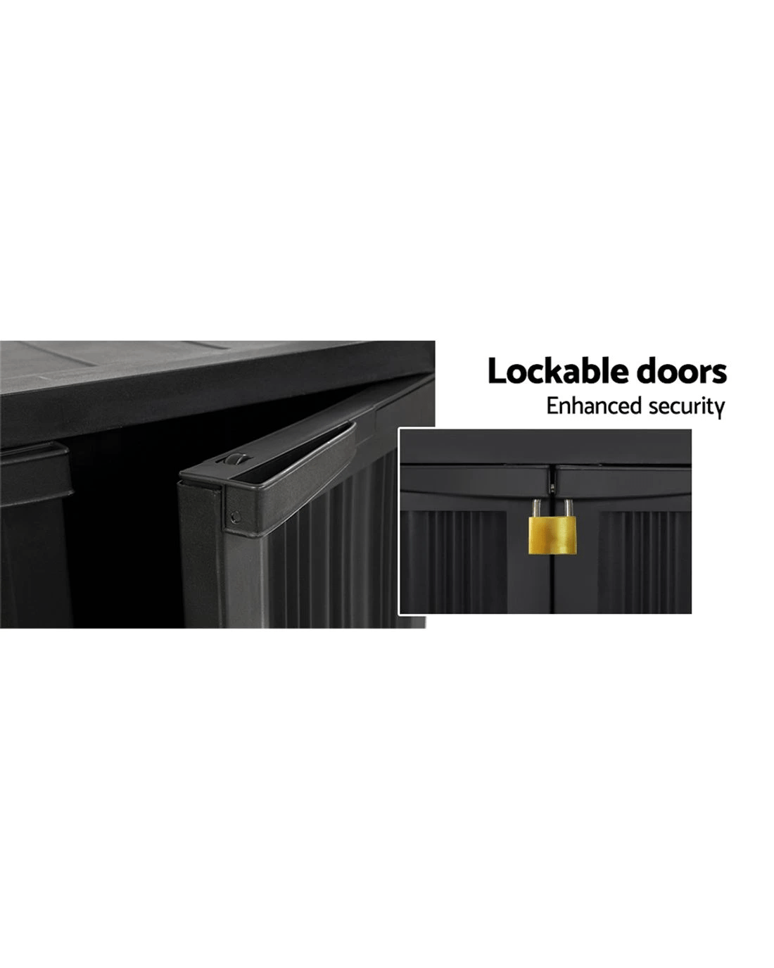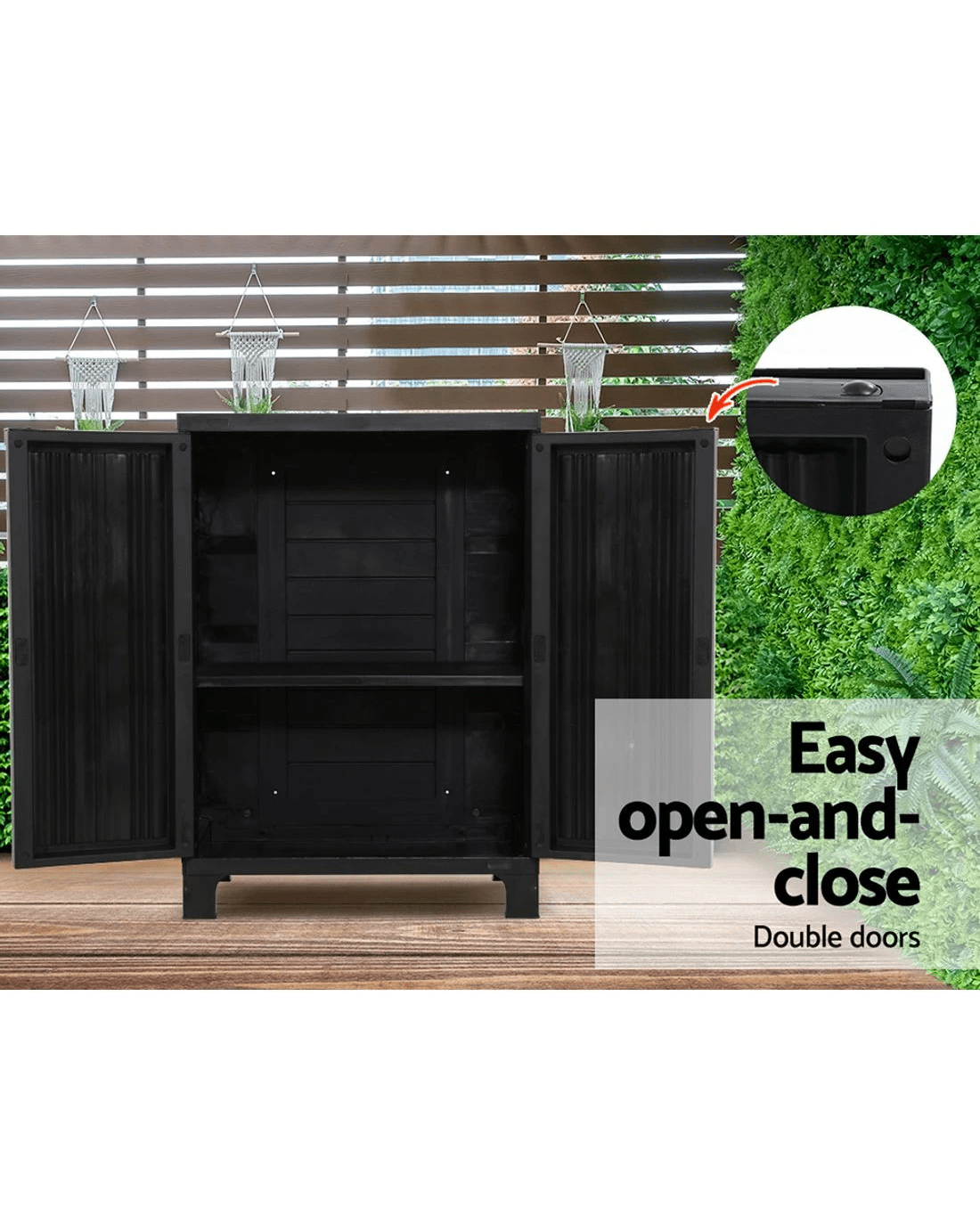 Need a more stylish looking outdoor storage cabinet that also does the work efficiently? Our Gardeon Outdoor Cabinet fits your bill perfectly. Tall, slim and pleasant-looking. Inside, the cabinet has ample storage with adjustable and removable shelves with weight capacity of up to 6kg each for customised storage options. Perfect for storing all your gardening paraphernalia and other tools and equipment of all shapes and sizes. Better still, there is also a pegboard with four hangers to hook up your hoses, ropes and similar items. Outside, the weather-resistant cabinet features premium plastic construction with corrugated panels for both reinforced support and stylish looks. Security and safety are also enhanced with lockable doors that can be secured with a range of locks. Not least, the entire unit stands on large stilted feet to keep it away from floods, spills or wet floors. So, do not just get any storage cabinet in your backyard. Make it our Gardeon Outdoor Cabinet for years of safe and durable usage.