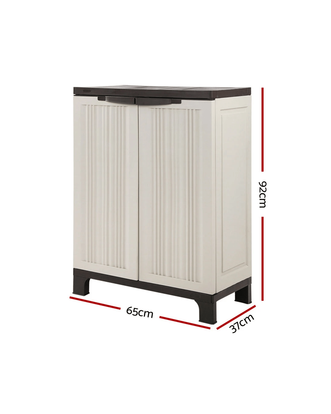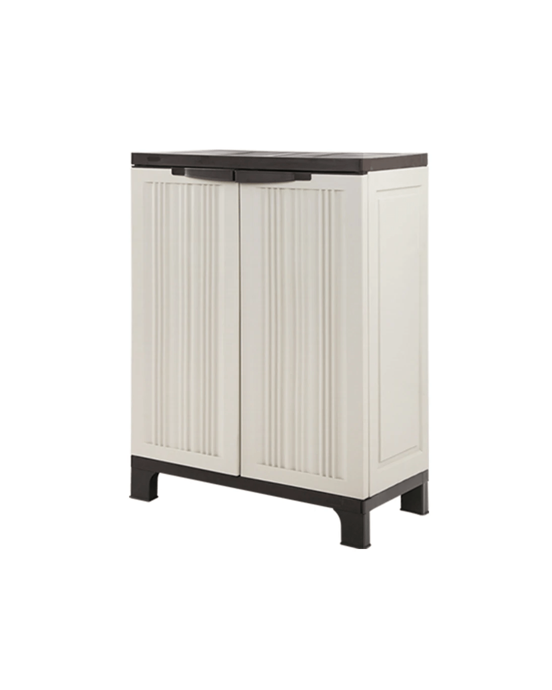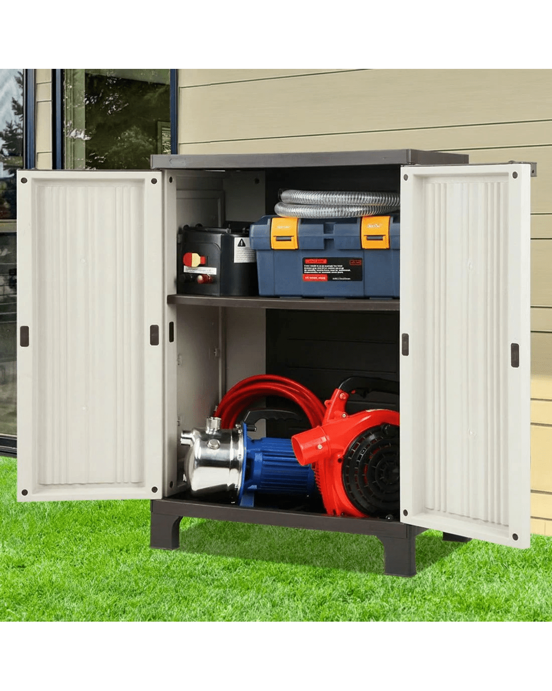 Outside, it shares similar attributes of the full-size cabinet with the same corrugated panel design for added support and style. The weather-resistant premium plastic construction ensures longlasting use while the stilted feet protects it against spills, floods or wet ground. No worries there of where you want to place it.