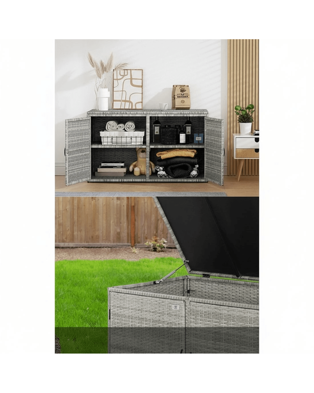 Looking for some extra storage space for your garden or outdoor essentials and tools? Gardeon has you covered with this stylish and versatile Wicker Outdoor Storage Cabinet. The outdoor cabinet is made from durable handwoven wicker that is UV and weather resistant and boasts a strong steel frame with excellent weight capacity – 60kg per shelf and 90kg on the top cover. It has two layers of inner storage space with two different ways of opening. It flaunts a fantastic 2-in-1 design: you can use it as just a storage cabinet, or as a cabinet and side table. It is inherently safe with its wide variety of features including a safe hydraulic hinge, convenient rope handles, durable anti-rust hinges, non-slip foot pads and wall attachments to prevent tipping. Suitable for indoor and outdoor use, you can add style and function to anywhere in the home with a Gardeon Wicker Outdoor Storage Cabinet.
