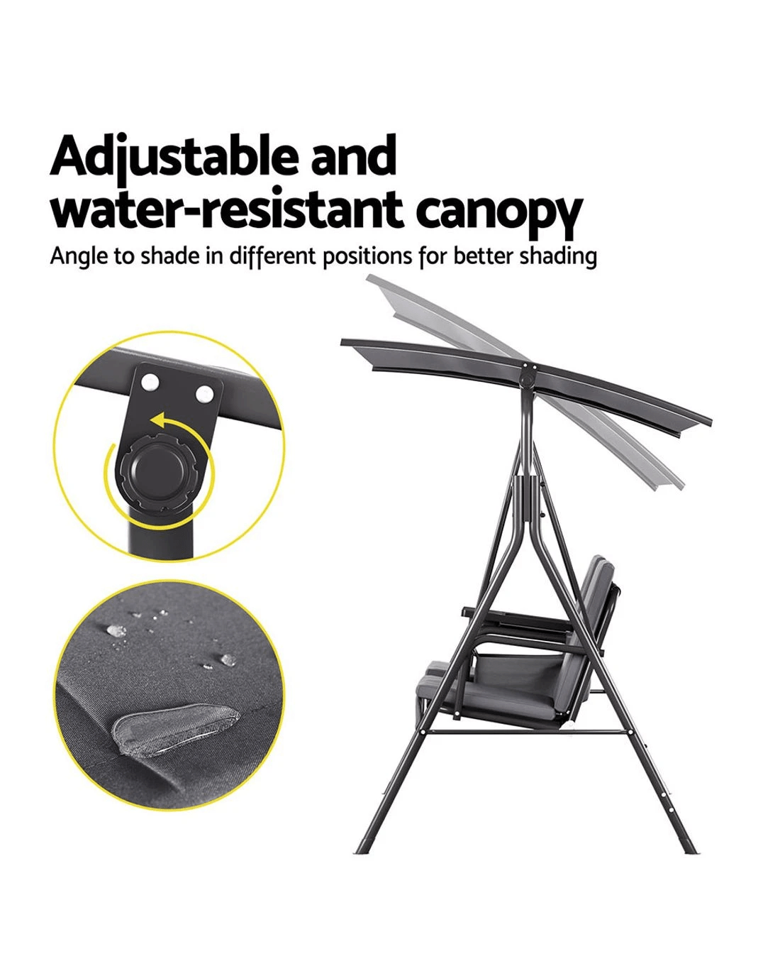 The chair features a strong powder-coated steel frame and upgraded support springs, giving the chair a total weight capacity of 200kg. The textilene fabric canopy is water-resistant and UV protected, keeping you comfortable in rain or shine.
