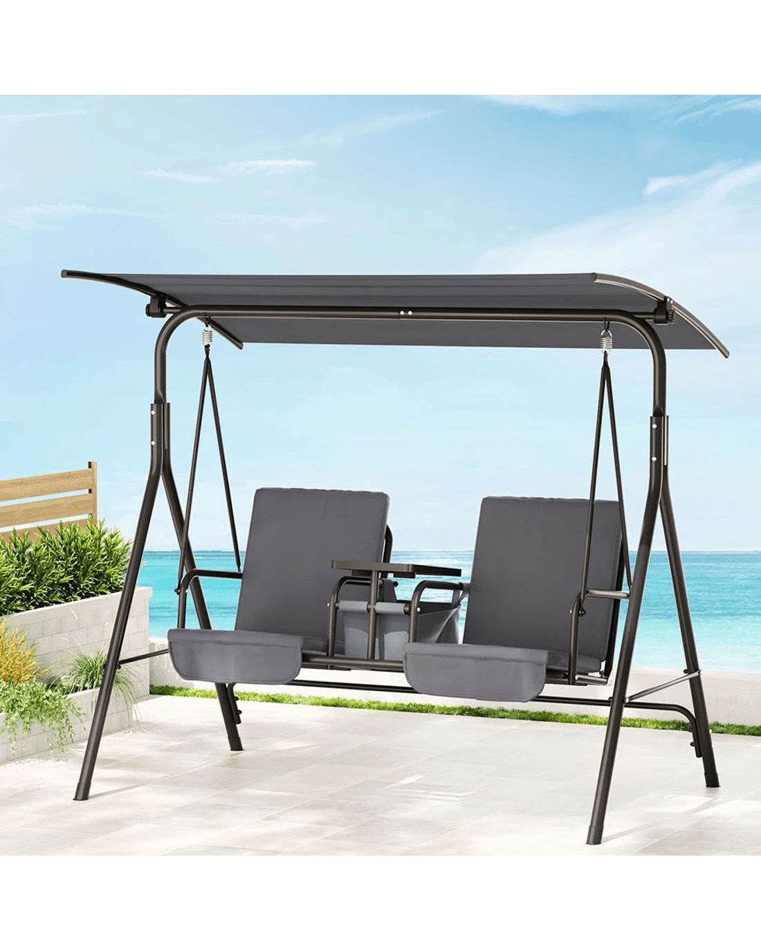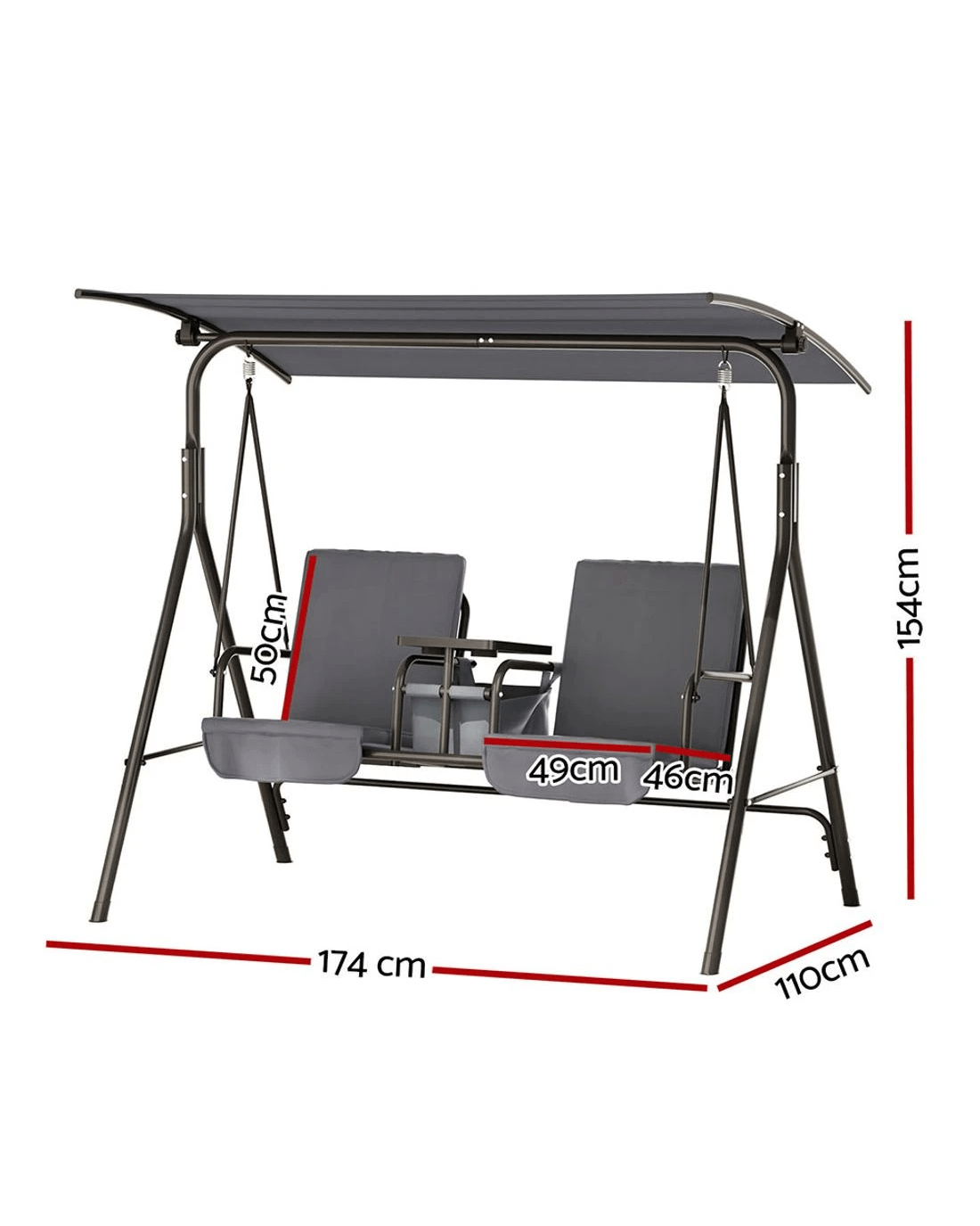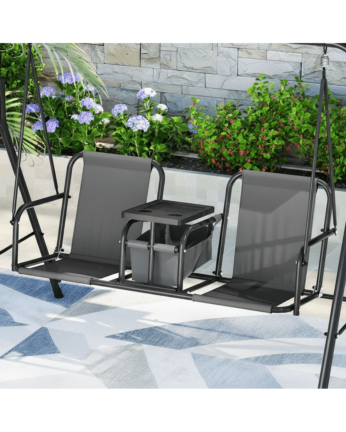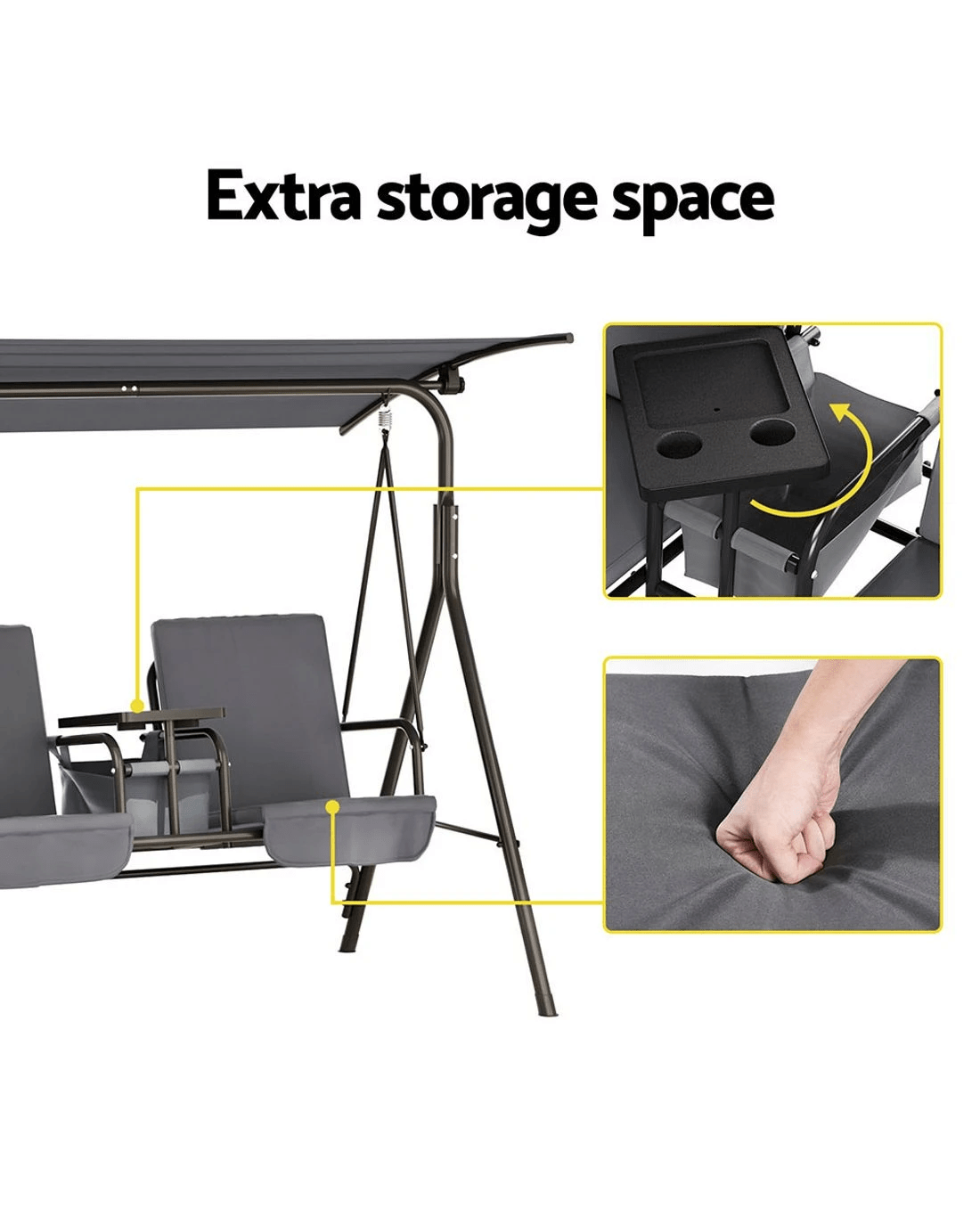 Finally, a central storage box with cup holders keeps everything you need at hand, from food and drinks to books and electronics. Swing on gentle breezes and enjoy fun and relaxation on the delightful Gardeon 2-seater Swing Chair.