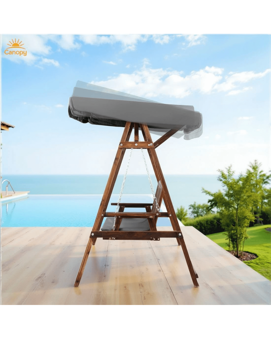 Made of durable fir wood, the frame is strong and sturdy while the generously padded seat upholstered in durable polyester offers ultimate comfort. The water-resistant and UV-protected canopy can be set in any position to provide the right cover or detach completely for relaxed sunbathing.