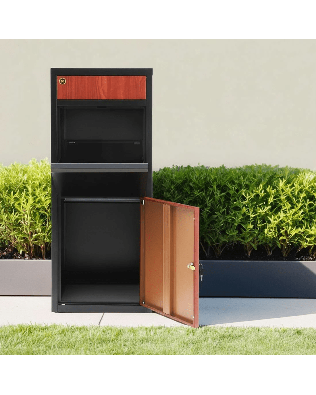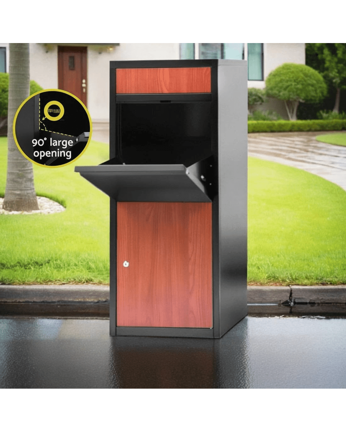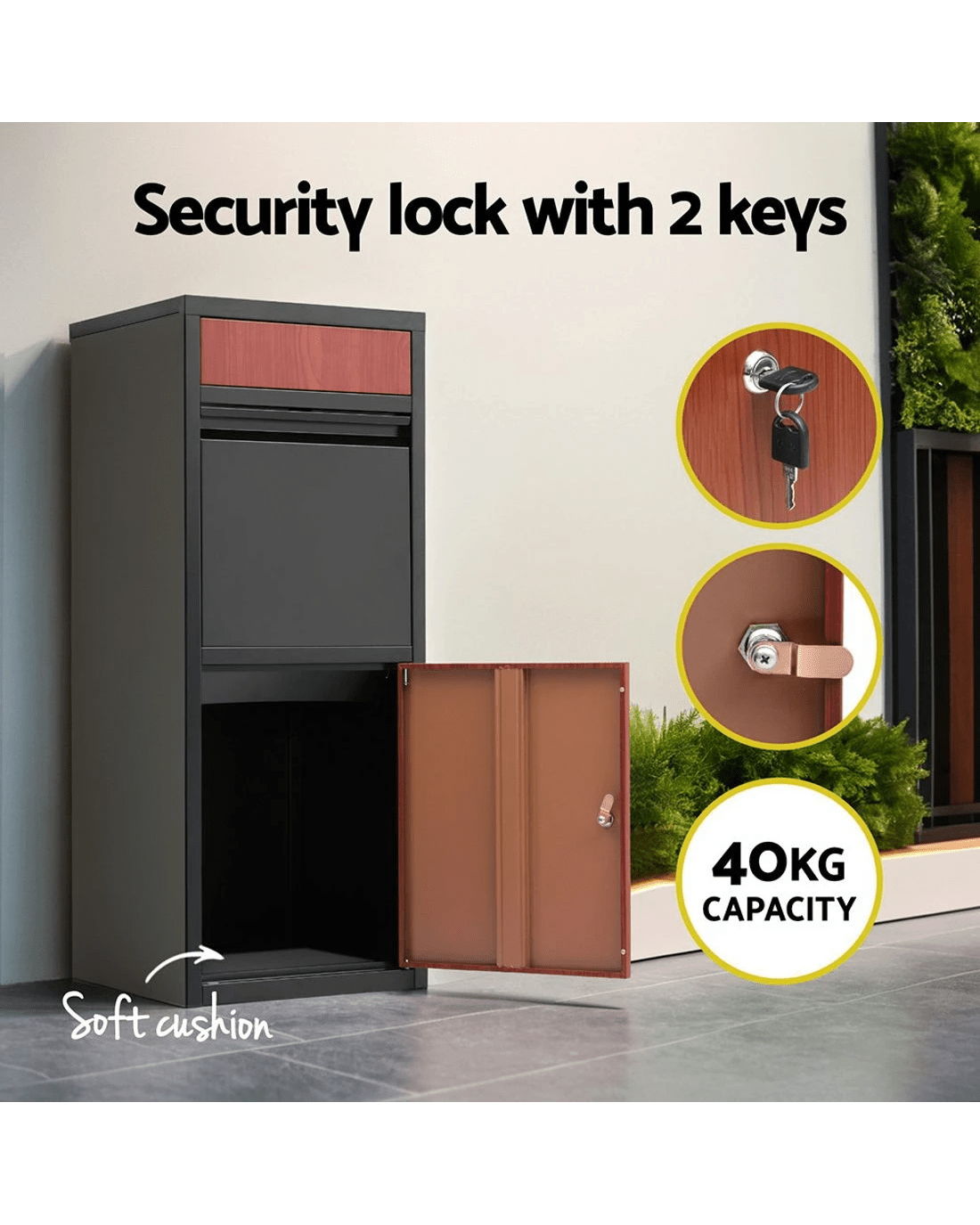 The Gardeon Freestanding Parcel Drop Box in sleek black offers a secure and convenient solution for receiving packages, featuring a water-resistant steel frame and 2-slot drop design. With its 90° large opening, locked cabinet, and soft bottom cushion, this drop box ensures your deliveries stay safe and protected.